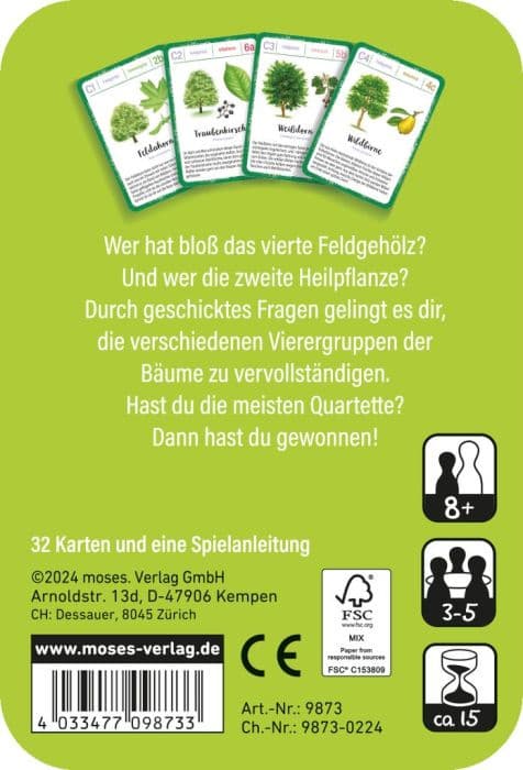 Bei diesem kompakten Klassiker-Kartenspiel heißt es sammeln und gewinnen. Durch die Zuordnung der vier zusammengehörenden Hölzer und Bäume wird spielerisch die Freude an der Natur geweckt. Interessante Fakten zu spannenden Bäumen wie der Bergkiefer oder der Sommerlinde vermitteln ganz nebenbei Wissenüber die unterschiedlichsten Baumarten. Die praktische Blechdose eignet sich perfekt für unterwegs.