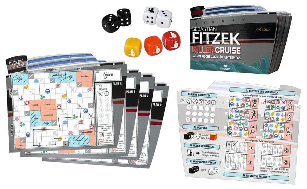 Die spannende Suche nach dem Psychopathen als kompaktes Roll&Write!Die kooperative Würfel-Variante von Sebastian Fitzek Killercruise bringt die Atmosphäre und den Thrill des großen Bestseller-Brettspiels auf Papier. Ein besonderes Spielerlebnis voller Teamwork, Spannung und kniffeligen Entscheidungen. Dabei sorgen vier unterschiedlich anspruchsvolle Deckpläne für viel Abwechslung in diesem einzigartigen Roll&Write. Die Aufgabe der Spieler*innen: Den versteckten Psychopathen finden und die Passagiere retten. Doch dabei sollte schnell gehandelt werden, denn die Zeit läuft – und das sorgt für extra viel Nervenkitzel, denn die Gefahr durch den Killer nimmt stetig zu…So wird’s gespielt:- Die schwarzen und weißen Würfel geben in jeder Runde vor, wie die Spieler*innen sich auf dem Schiff bewegen können.- Jede*r bewegt sich auf dem eigenen Deckplan, um Hinweise zu finden und Passagiere zu retten.- Doch Vorsicht: Man darf den eigenen Weg nichtkreuzen!- Die farbigen Bedrohungswürfel bestimmen, ob der Killer zuschlägt.- Ihren Fortschritt halten die Spieler*innen auf dem gemeinsamen Aufgabenblatt fest.- Nur, wenn der Psychopath schnell genugGefunden wird, kann das Spiel gewonnen werden.Inhalt: 1 Würfelblock (mit 200 Blättern in Schiffsform), 7 Würfel, 1 SpielanleitungSpieldauer: ca. 30 Min