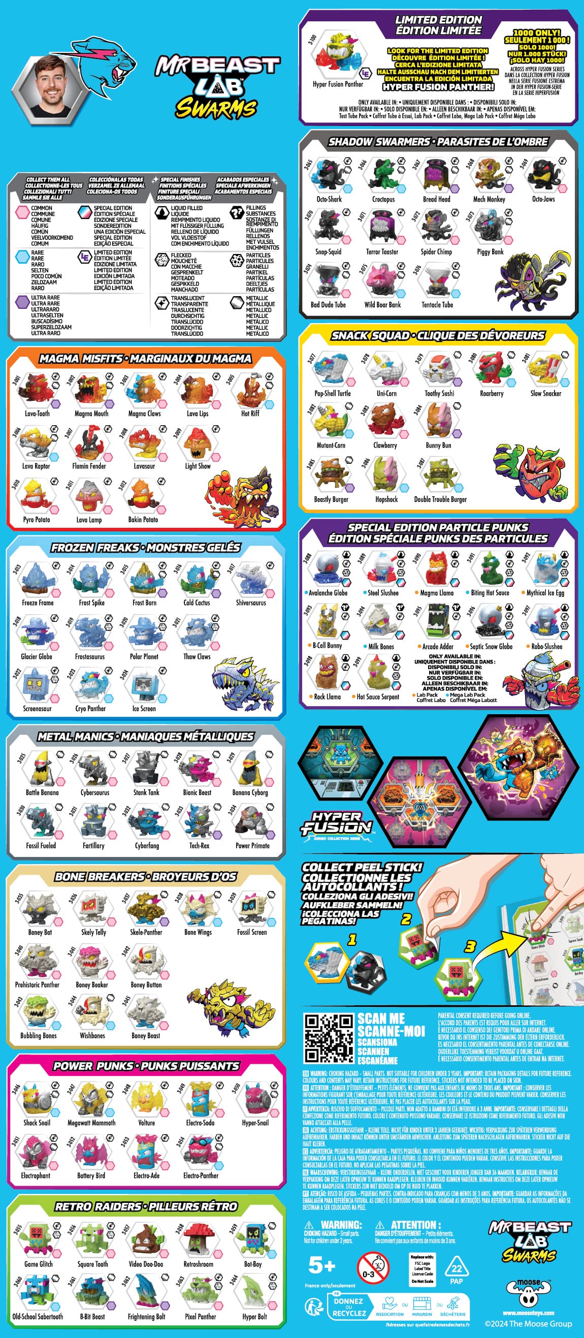 MrBeast Lab Swarms wurden „hyperfusioniert“, um die bisher wildesten Kreationen zu erschaffen. Verrückte Lava-, Eis- und Metallkombinationen sorgen im Labor für Chaos und warten darauf, entdeckt zu werden! Es gibt über 100 epische und einzigartige Hyper Fusion Swarms (2,5 cm) zum Sammeln, inklusive seltener und ultraseltener Editionen, Sondereditionen sowie der Limited Edition mit dem begehrten Hyper Fusion Panther, der aus drei verschiedenen Elementen besteht! Du musst allerdings schnell sein, denn es sind nur 1.000 Hyper Fusion Panther in der NEUEN MrBeast Lab-Serie erhältlich! Mit dabei in der Hyper Fusion-Serie sind die neuen EPISCHEN Hyper Fusion-Sticker! Jede Laborpackung enthält 6 einzigartige Swarm-Sticker, die du in der Sammelanleitung einkleben kannst. Schaffst du es, alle Sticker zu sammeln und deine Sammlung zu vervollständigen? Die Laborpackung enthält 6 mysteriöse Mini-Monster, inklusive einer Sonderedition sowie 6 Hyper Fusion-Sticker! In der Hyper Fusion-Serie findest du auch Fusions-Kapseln. Diese Kapseln können zusammengesteckt werden, um deine Sammlung zu präsentieren und dein eigenes MrBeast Lab aufzubauen. Die Laborpackung enthält 2 Fusions-Kapseln. Mit weiteren MrBeast Swarms-Packungen kannst du deine Sammlung jederzeit erweitern. Verbreite das Hyper Fusion-Chaos und baue deine MrBeast Lab Hyper Fusion-Sammlung noch heute auf! Erlebe die Swarms mit brandneuen animierten MrBeast Lab-Inhalten auf YouTube in Action und sieh zu, wie die Swarms auch online für Chaos sorgen!