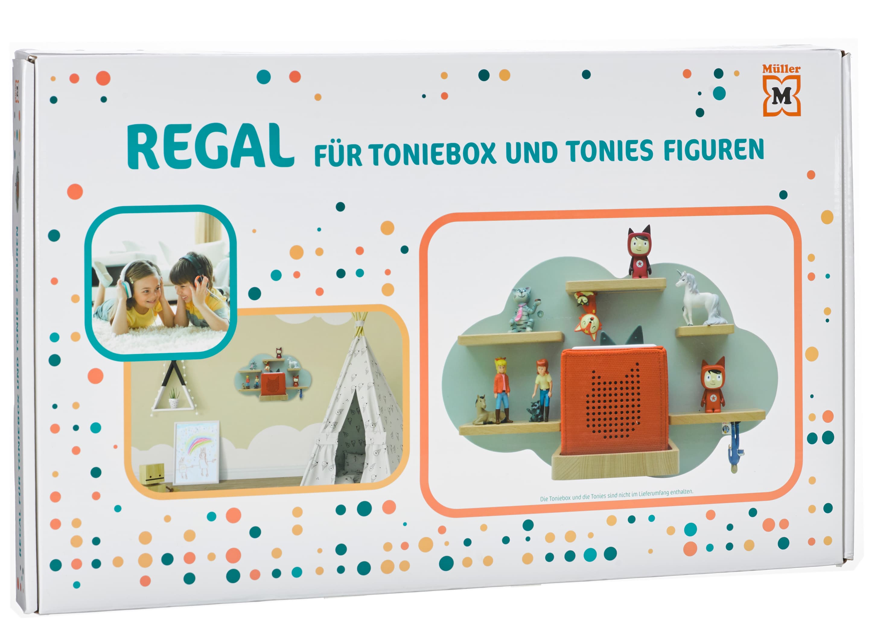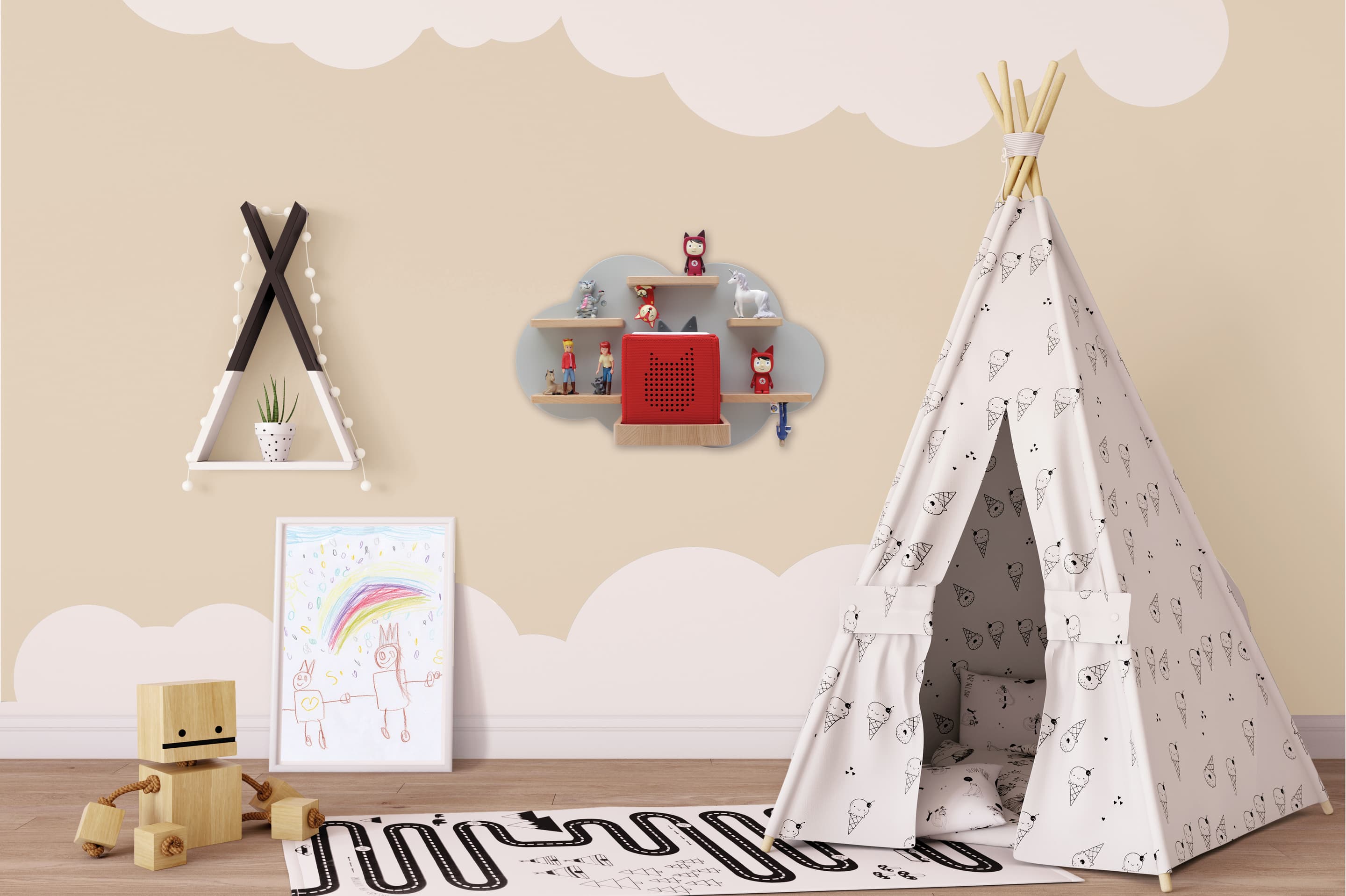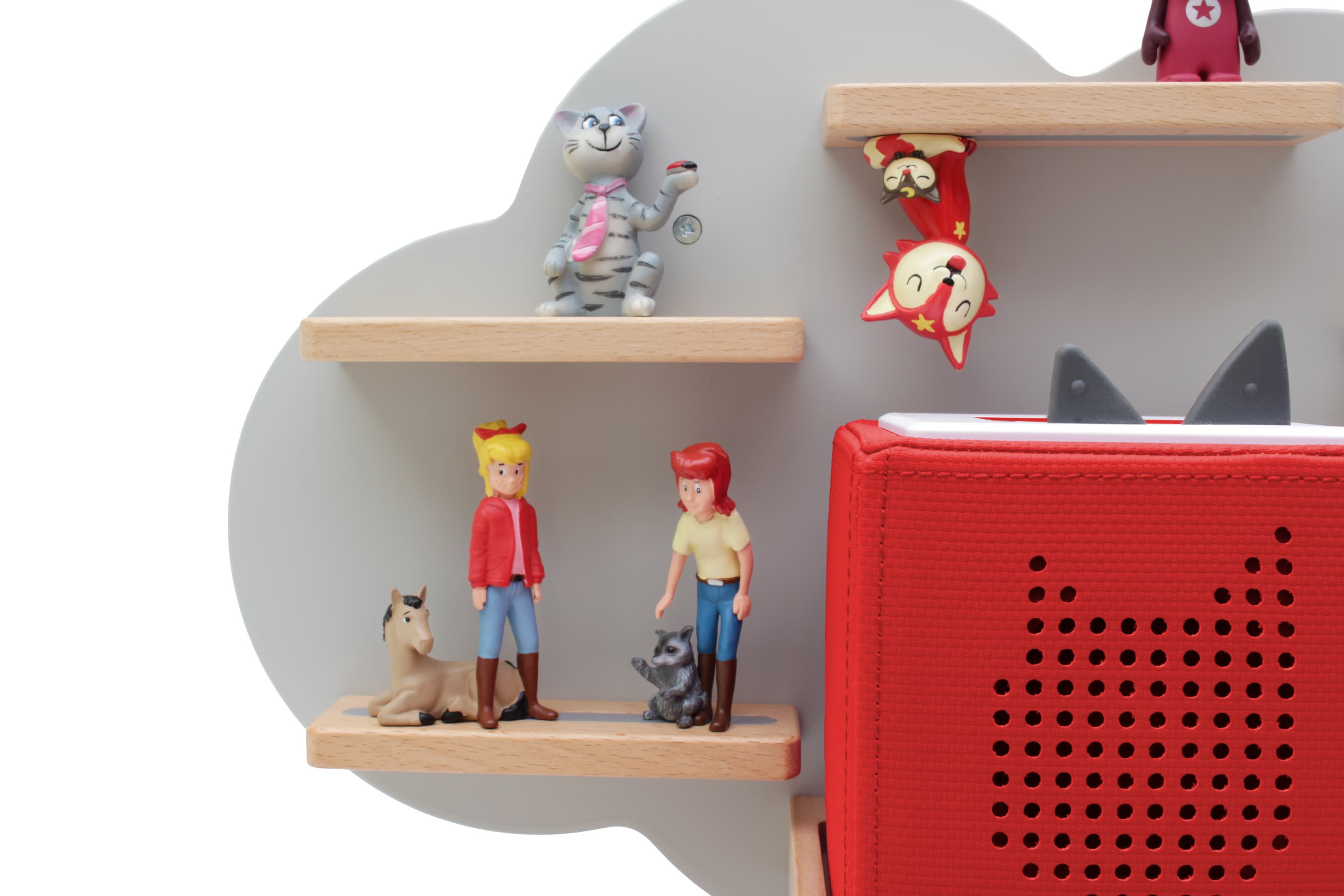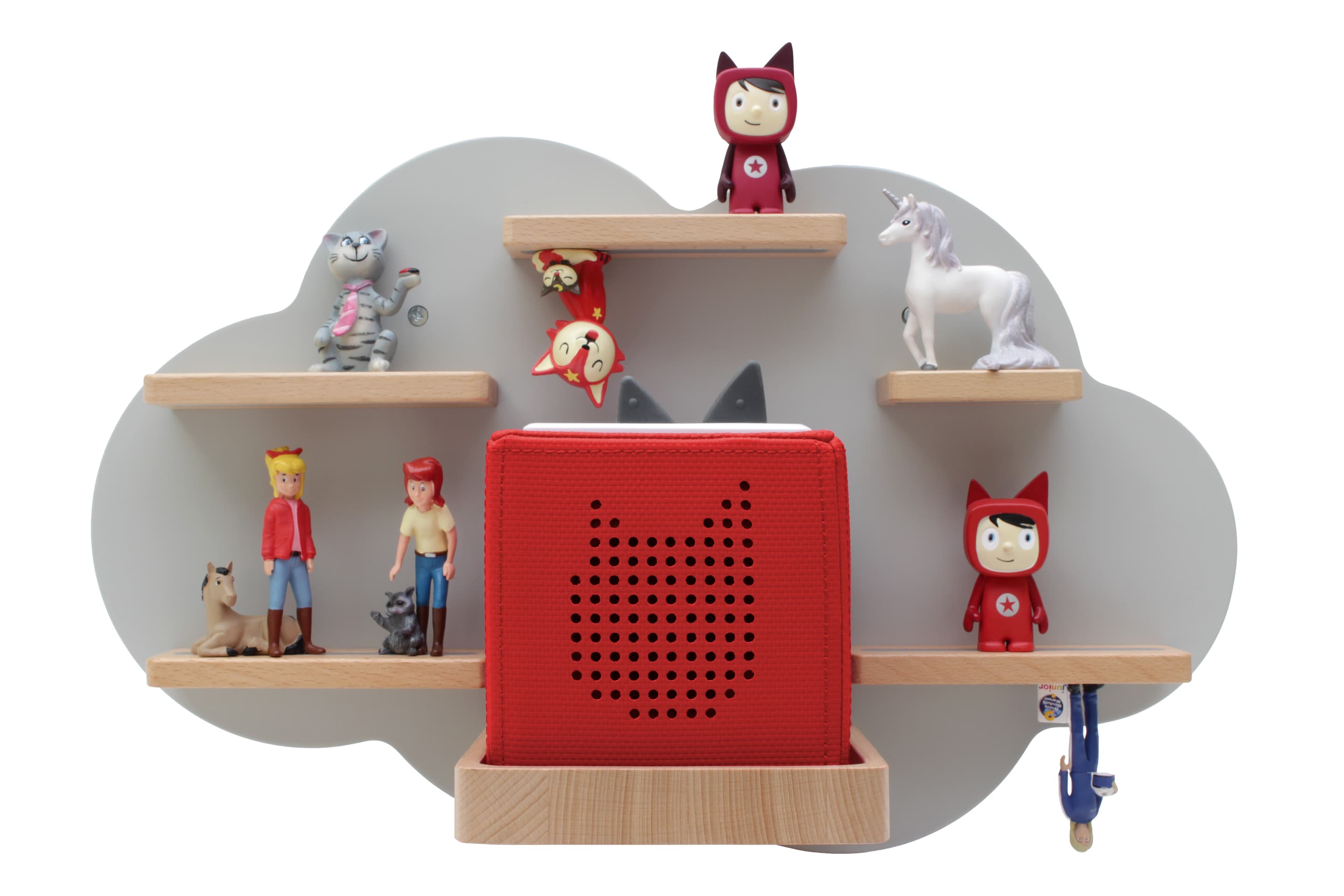 Regal für Toniebox und Tonies Figuren Mit diesem tollen Regal in Form einer Wolke kommt endlich Ordnung in das Kinderzimmer und ein langes Suchen der Figuren wird nicht mehr nötig sein! Die Regalböden sind an der Ober- und Unterseite mit einem Magnetstreifen versehen, dadurch können alle Tonies sowohl stehend, als auch hängend im Regal aufbewahrt werden. Das Regal bietet Platz für die Toniebox inklusive der Ladestation und für ca. 26 Tonies. Durch die vorgebohrten Löcher, mitgelieferten Schrauben und Dübel, kann das Regal einfach und schnell an der Wand angebracht werden. Maße: 30 x 48 x 17 cm (H x B x T), Gewicht: 1,4 kg. Die Toniebox, die Ladestation und die Tonies sind nicht im Lieferumfang enthalten. Für alle Tonieboxen geeignet.