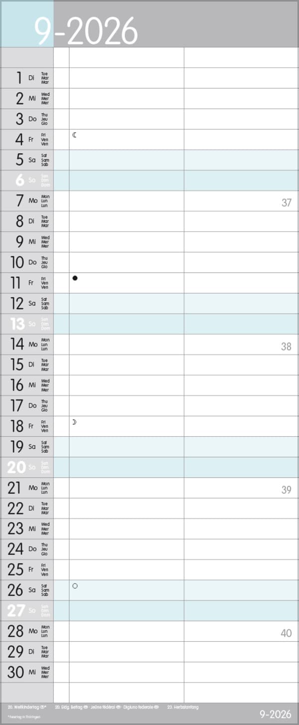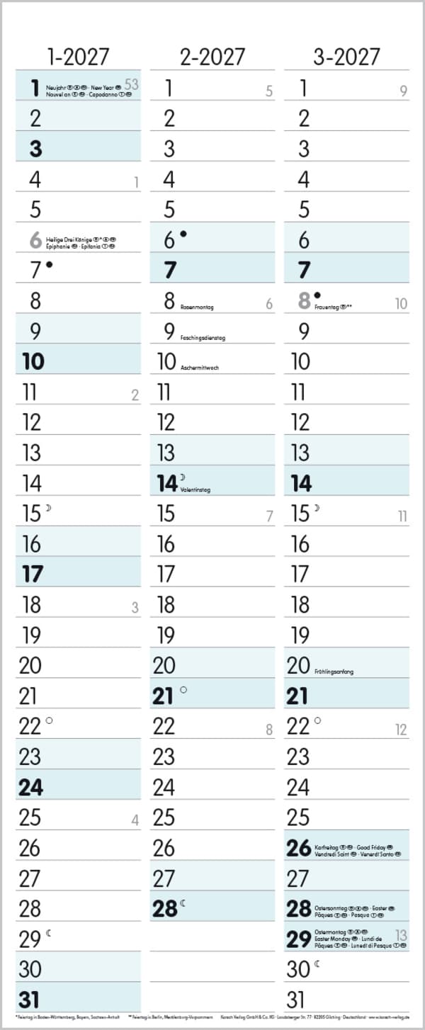 Korsch Familienkalender - Produktmerkmale Übersichtlicher Familienplaner für bis zu 2 Personen; sehr stabile Rückwand; 19 x 46 cm Terminkalender mit viel Platz für Eintragungen, ohne störende Bilder in den Spalten leichte Beschreibbarkeit, auch mit Bunt- und Bleistiften Mehrsprachiges Kalendarium (d,e,f,i) mit regionalen Feiertagen für Deutschland, Österreich und Schweiz Farblich hervorgehobene Sonn- und Feiertage, sowie Anzeige der Zeitumstellung Gedruckt auf dickem und umweltfreundlichem FSC Papier Korsch Familien - Jahreskalender Dieser Wandkalender hilft Ihnen dabei alle wichtigen Termine stets im Blick zu haben. Mit zwei Spalten zum Eintragen von Geburtstagen, Terminen und Erinnerungen bietet dieser Jahreskalender viel Platz für Notizen. Dadurch ist es auch möglich mehrere Termine in einen Tag zu schreiben. Er eignet sich perfekt für die Organisation des Single- oder Ehelebens. Neben dem gesamten Kalenderjahr enthält der Wandplaner auch eine Vorschau bis März des Folgejahres. Weitere Informationen wie Mondphasen, Ferientermine und Feiertage (auch regionale) sowie deutlich lesbare Kalenderwochen runden den Kalender ab und sorgen für einen vollständigen Überblick Ihres Jahres.