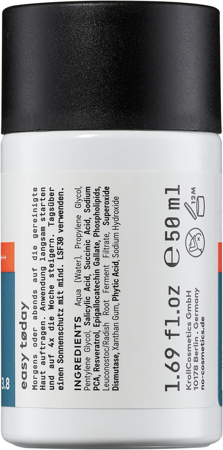 | Inhaltsstoffe | Aqua (Water), Propylene Glycol, Pentylene Glycol, Salicylic Acid, Succinic Acid, Sodium PCA, Resveratrol, Epigallocatechin Gallate, Phospholipids, Leuconostoc/Radish Root Ferment Filtrate, Superoxide Dismutase, Xanthan Gum, Phytic Acid, Sodium Hydroxide |