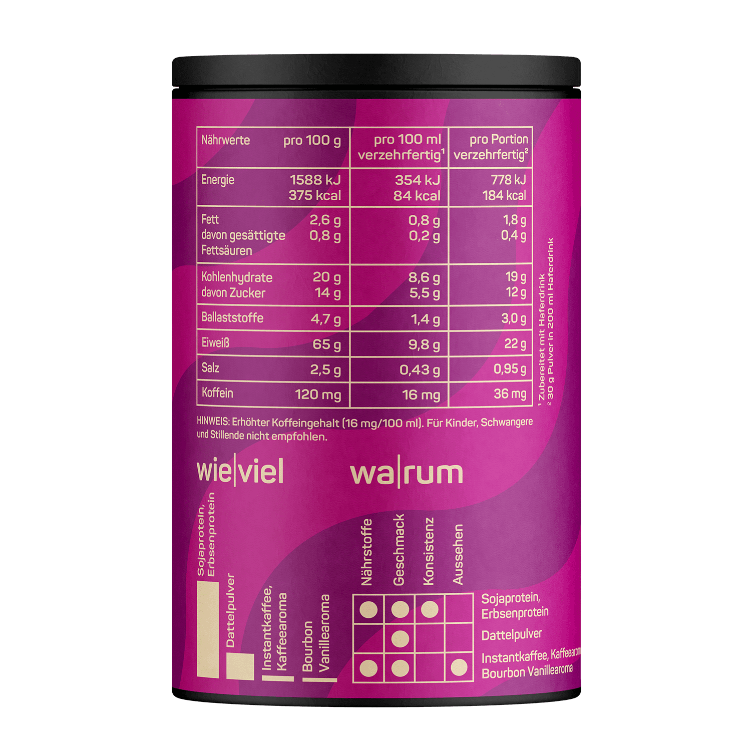 Zutaten73% Vegane Proteinpulvermischung* (SOJAproteinisolat*, Erbsenproteinisolat*), 20% Dattelpulver*, 3% Instantkaffeepulver*, 3% natürliches Bourbon Vanillearoma*, 1% natürliches Kaffeearoma*. * aus biologischer Landwirtschaft