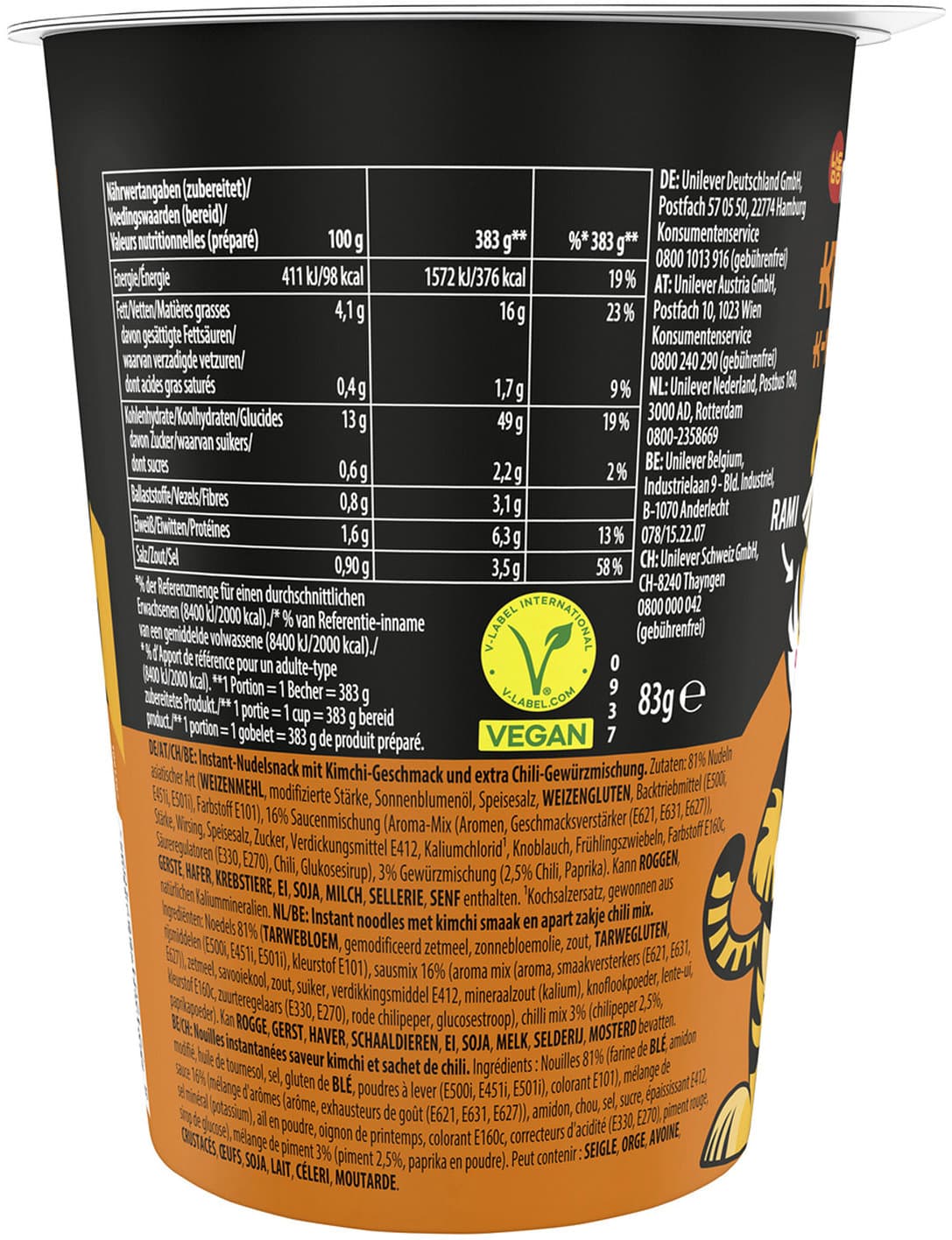 | Zutaten | 81% Nudeln asiatischer Art (WEIZENMEHL, modifizierte Stärke, Sonnenblumenöl, Speisesalz, WEIZENGLUTEN, Backtriebmittel (E500i, E451i, E501i), Farbstoff E101), 16% Saucenmischung (Aroma-Mix (Aromen, Geschmacksverstärker (E621, E631, E627)), Stärke, Wirsing, Speisesalz, Zucker, Verdickungsmittel E412, Kaliumchlorid*, Knoblauch, Frühlingszwiebeln, Farbstoff E160c, Säureregulatoren (E330, E270), Chili, Glukosesirup), 3% Gewürzmischung (2,5% Chili, Paprika). *Kochsalzersatz, gewonnen aus natürlichen Kaliummineralien. |