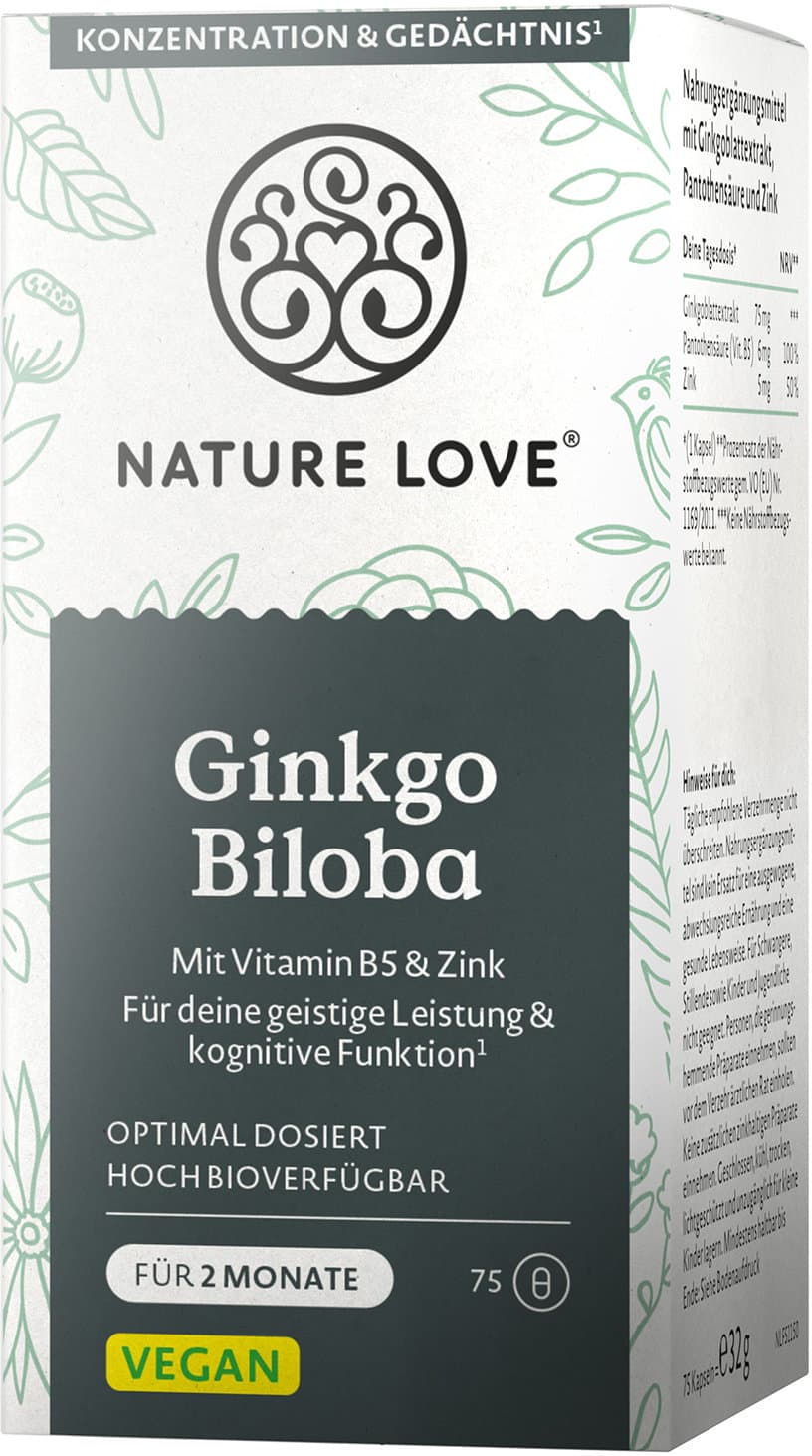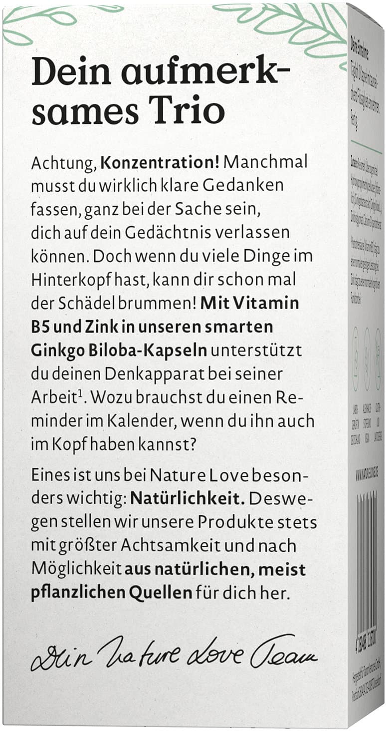 Achtung, Konzentration! Manchmal musst du wirklich klare Gedanken fassen, ganz bei der Sache sein, dich auf dein Gedächtnis verlassen können. Doch wenn du viele Dinge im Hinterkopf hast, kann dir schon mal der Schädel brummen! Dann denk doch an etwas Gutes – so wie den Ginkgo. Unser optimal dosiertes Extrakt gewinnen wir nämlich direkt aus den Blättern des Baumes und deren wertvolle sekundäre Pflanzenstoffe würden wir nicht vergessen – sie sind immerhin seit Jahrtausenden in der chinesischen Pflanzenkunde von Bedeutung. Noch mehr clevere Ideen gefällig? Mit Vitamin B5 und Zink in unseren veganen Ginkgo Biloba-Kapseln unterstützt du deinen Denkapparat bei seiner Arbeit.¹ Wozu brauchst du einen Reminder im Kalender, wenn du alles auch im Kopf haben kannst?