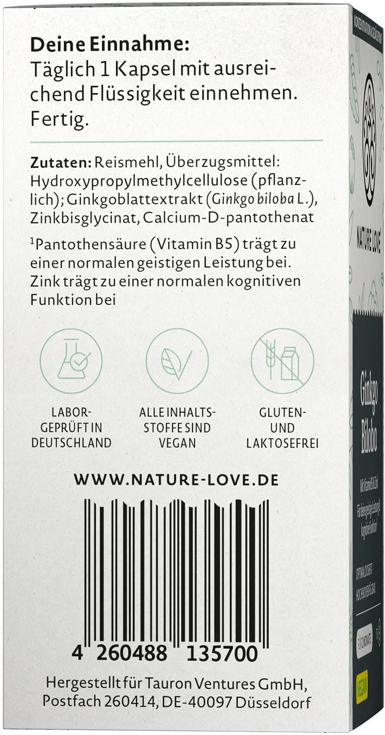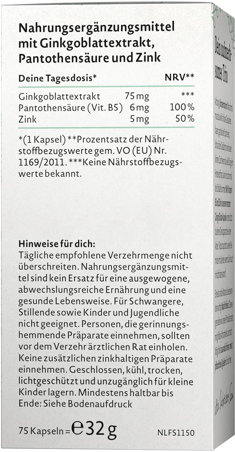 | Inhaltsstoffe | Reismehl, Ginkgo biloba Extrakt, Überzugsmittel: Hydroxypropylmethylcellulose (pflanzlich); Zinkbisglycinat, Calcium-D-Pantothenat |