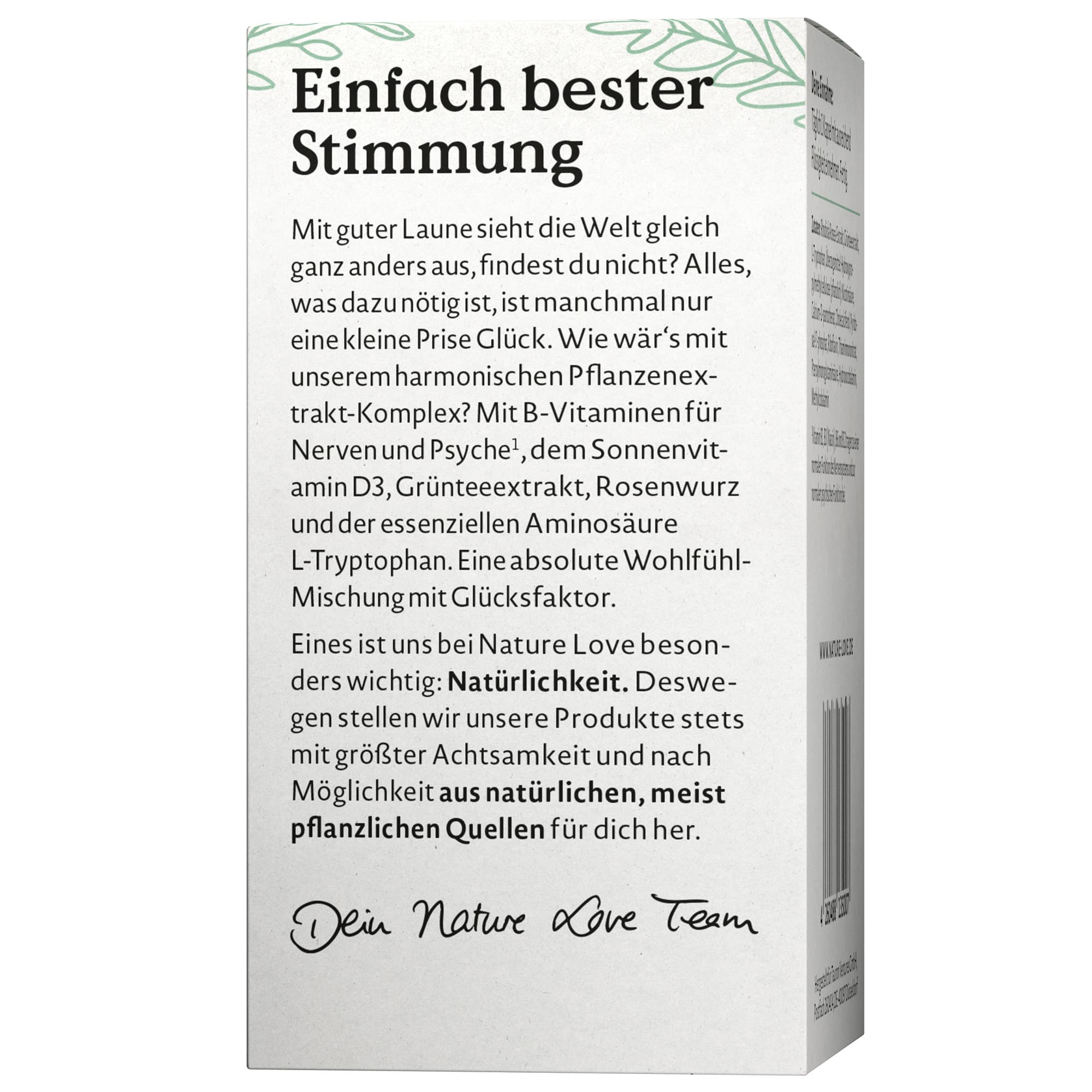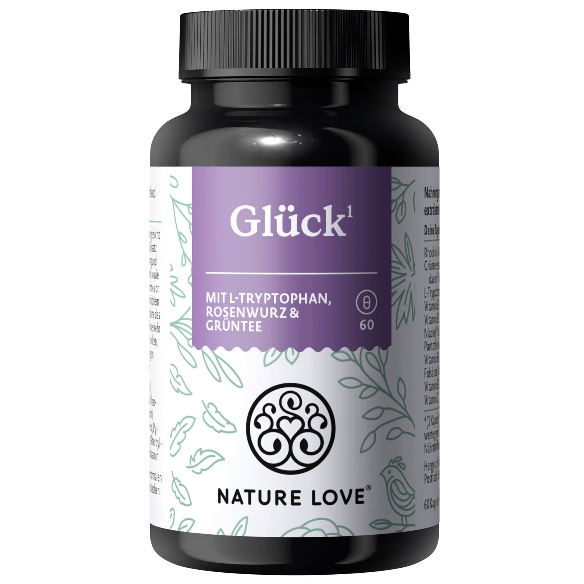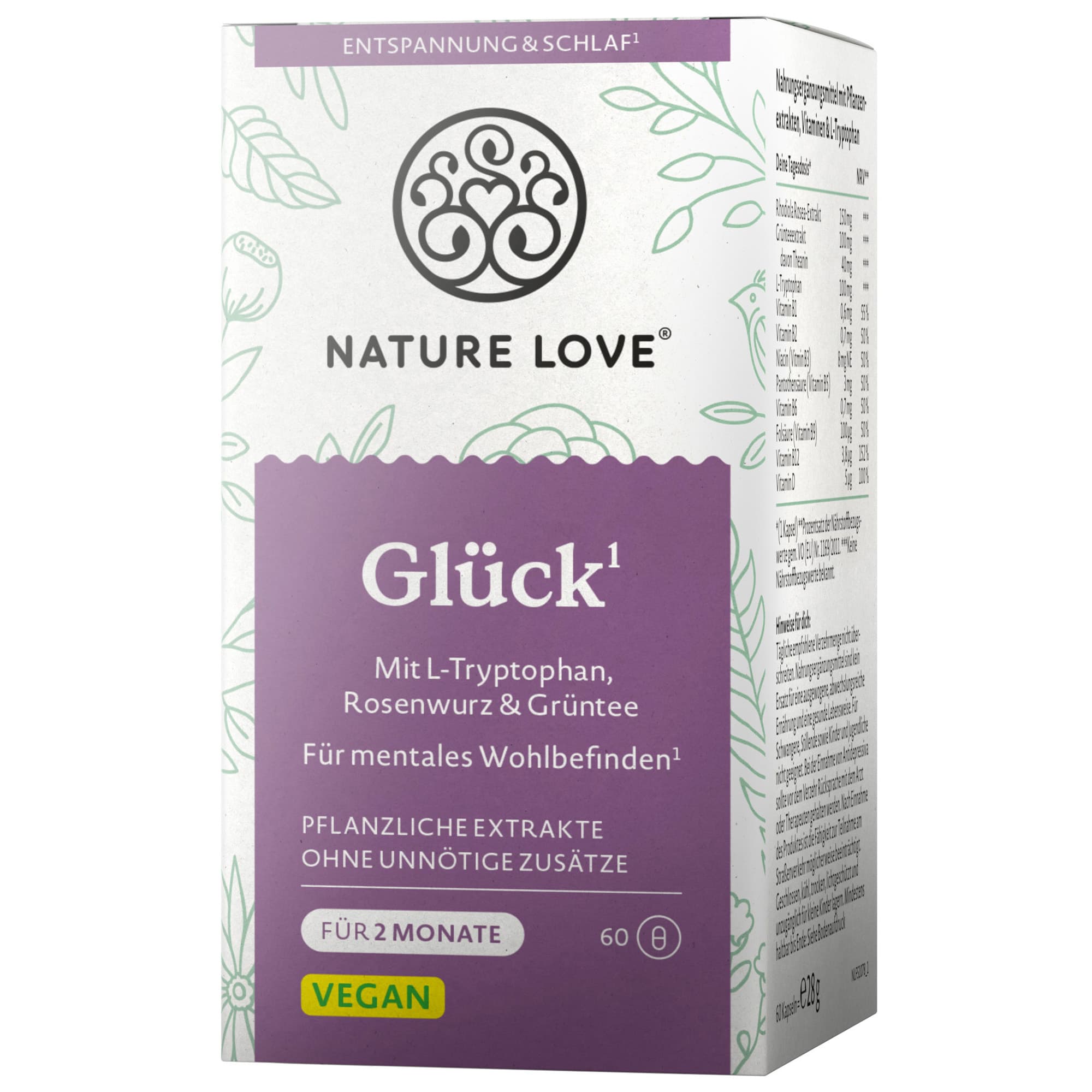 Das Nahrungsergänzungsmittel Glück von NATURE LOVE enthält eine Kombination aus ausgewählten Pflanzenextrakten, Vitaminen und L-Tryptophan.