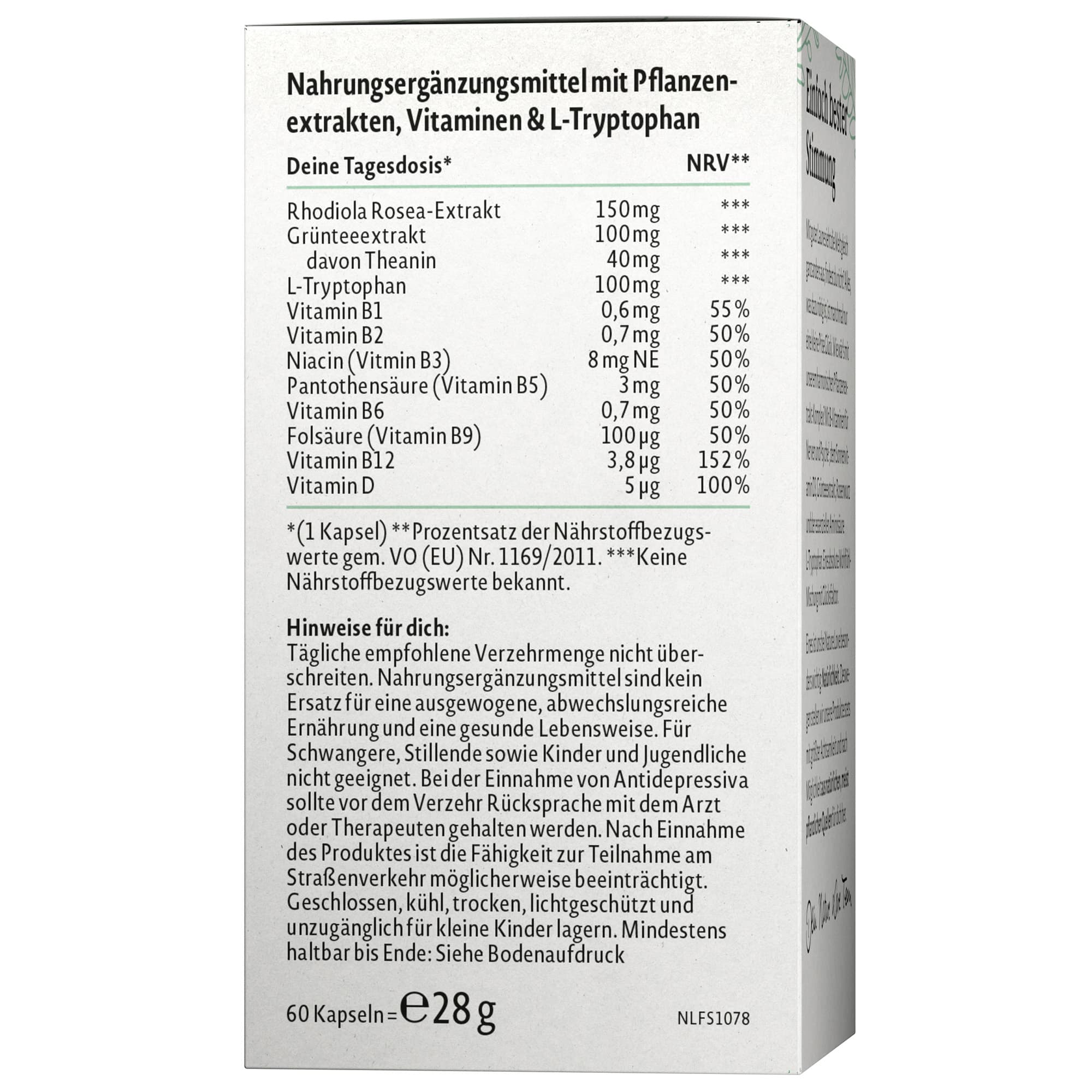 | Zutaten | Rhodiola Rosea-Extrakt, Grünteeextrakt, Griffonia Simplicifolia-Extrakt, Überzugsmittel: Hydroxypropylmethylcellulose (pflanzlich); Nicotinsäure, Calcium-D-pantothenat, Cholecalciferol, Pyridoxal-5'-phosphat, Riboflavin, Thiaminmononitrat, Pteroylmonoglutaminsäure, Hydroxocobalamin, Methylcobalamin |
