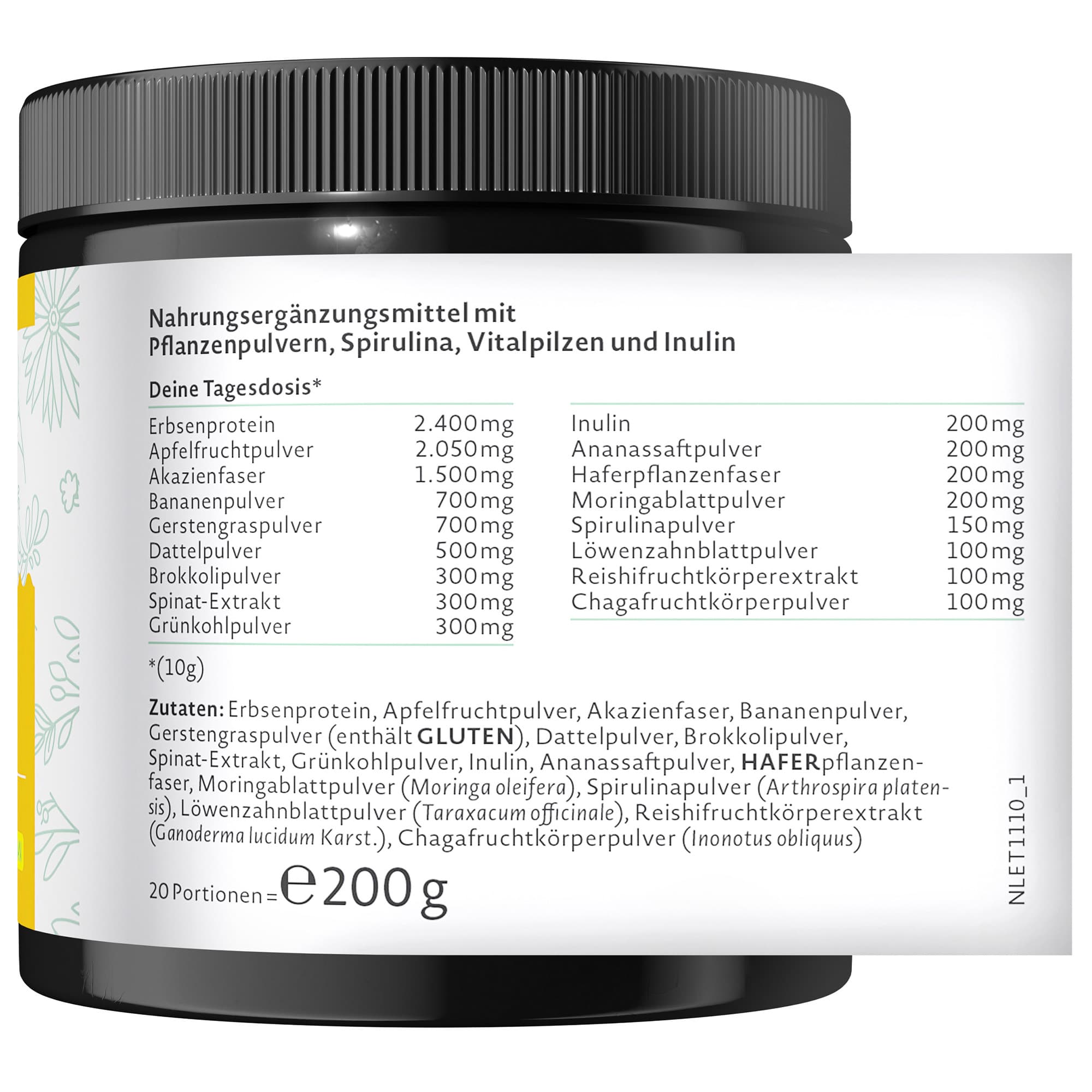 | Zutaten | Erbsenprotein, Apfelfruchtpulver, Akazienfaser, Bananenpulver, Gerstengraspulver (enthält GLUTEN), Dattelpulver, Brokkolipulver, Spinat-Extrakt, Gemüsekohlpulver, Inulin, Ananassaftpulver, Haferfaser, Moringablattpulver, Spirulinapulver, Löwenzahnblattpulver, Reishi-Extrakt, Chagapulver |