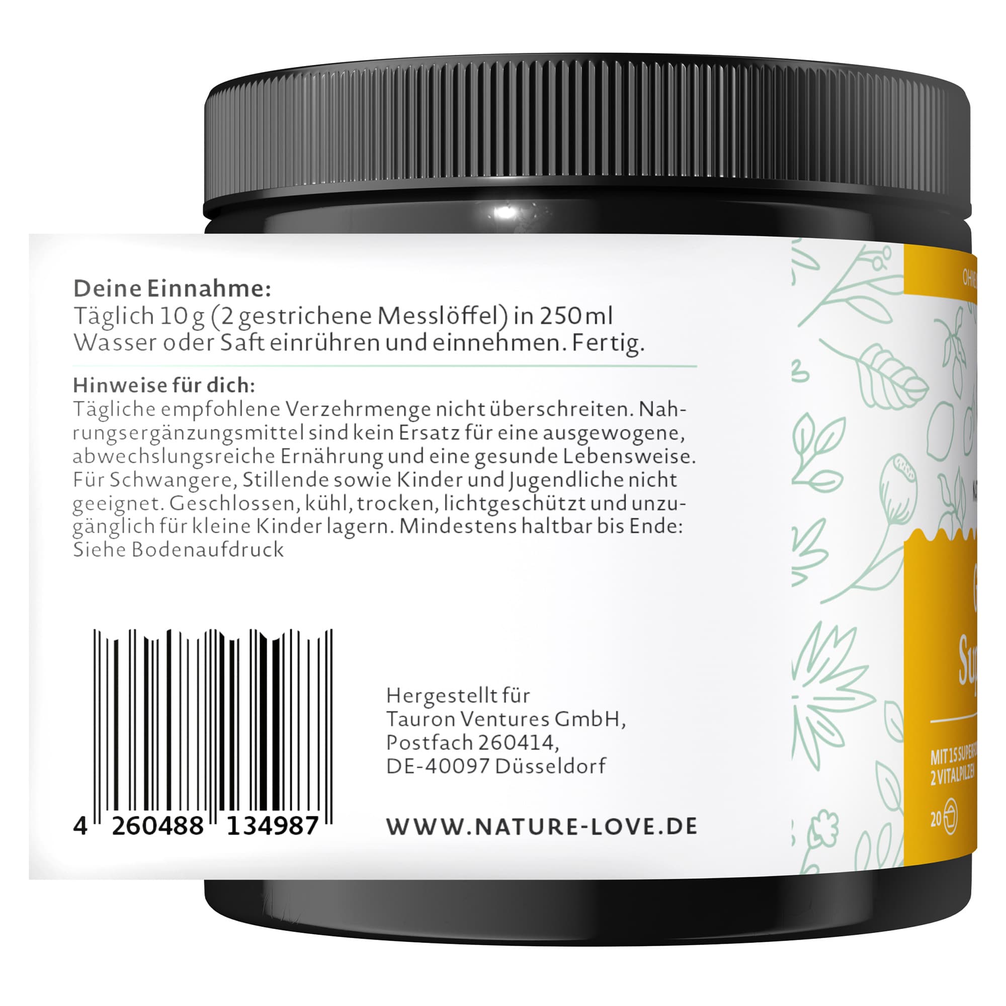 | Anwendungshinweis | Täglich 10g (2 gestrichene Messlöffel) in 250 ml Wasser oder Saft einrühren und einnehmen. Fertig. |