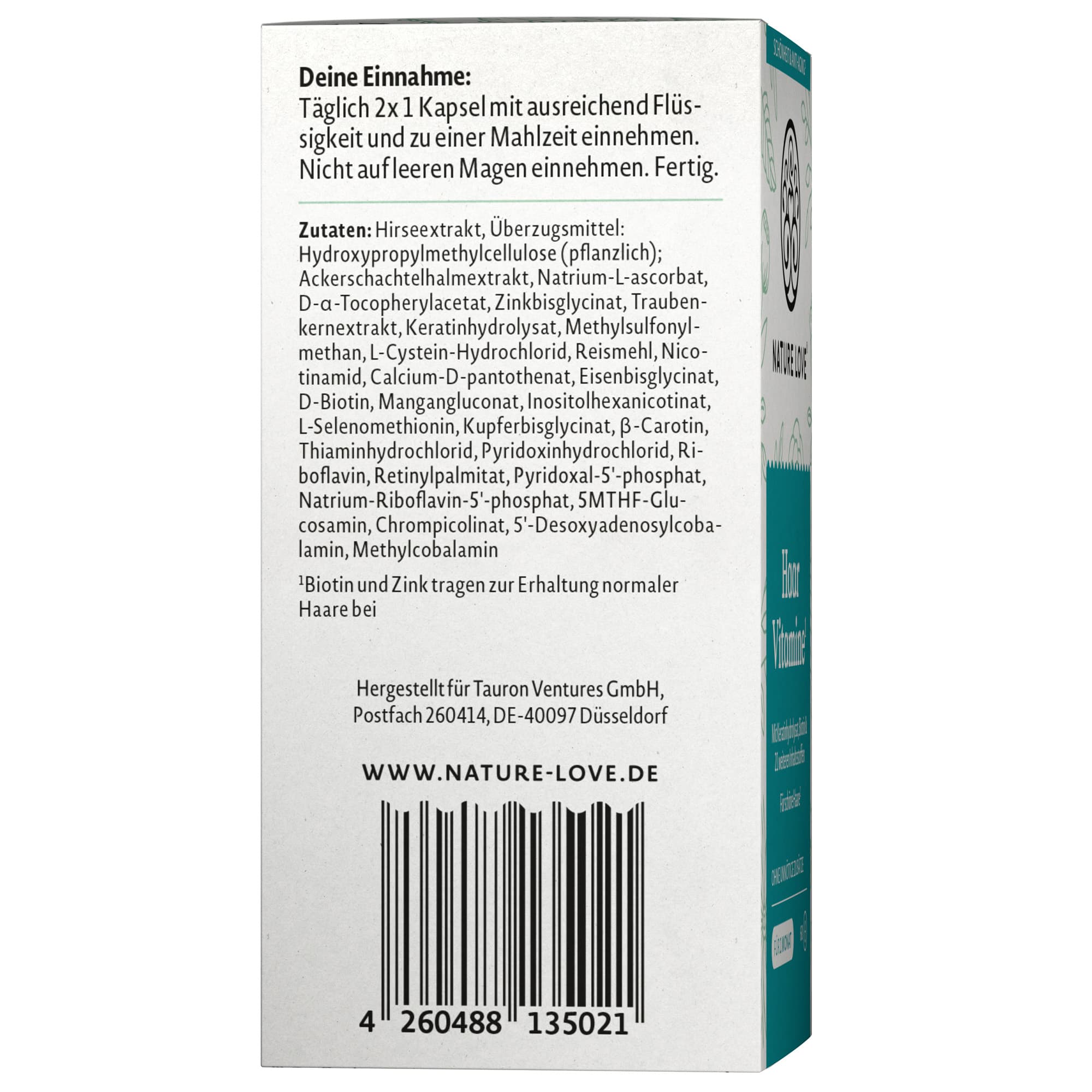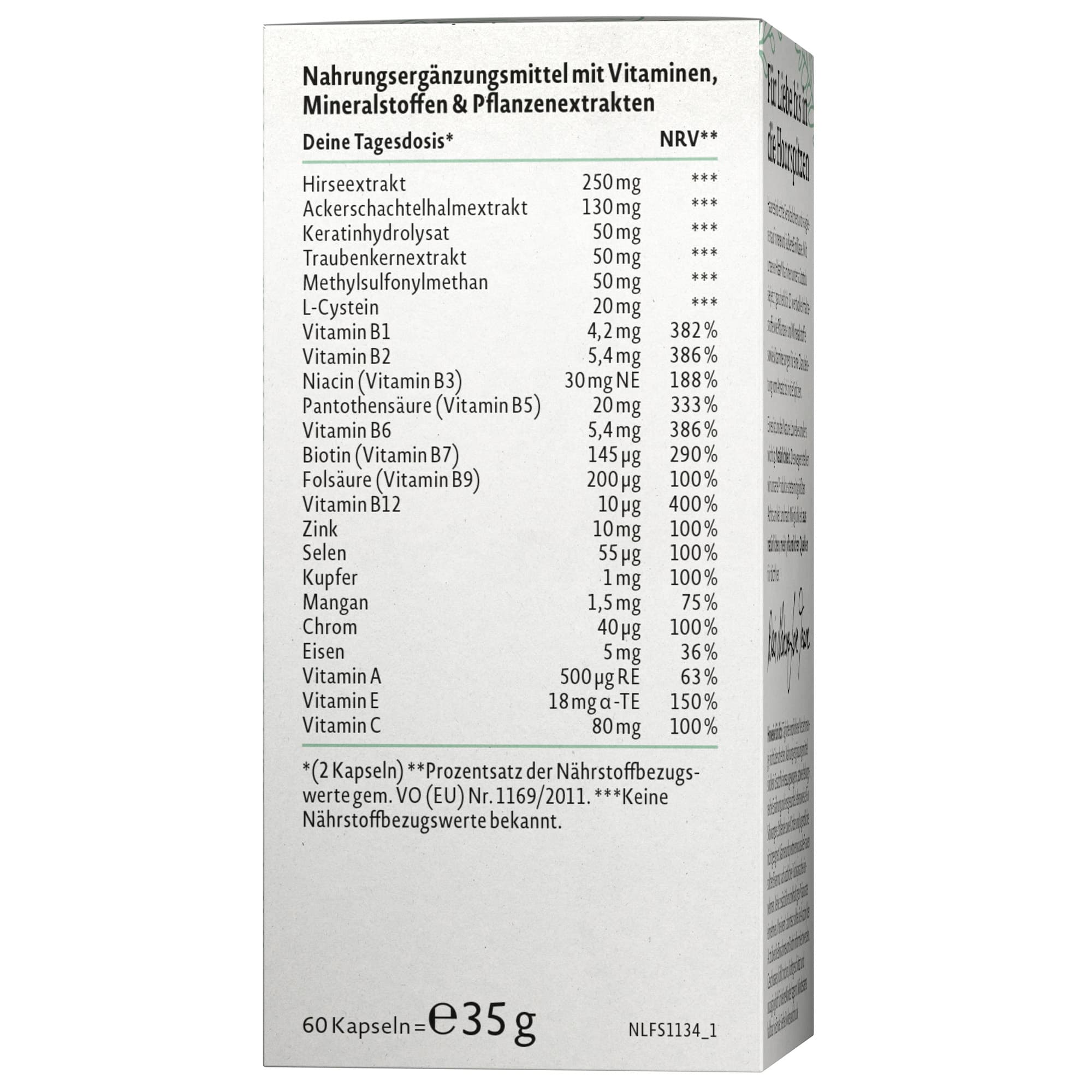 | Zutaten | Hirseextrakt, Überzugsmittel: Hydroxypropylmethylcellulose (pflanzlich); Ackerschachtelhalmextrakt, Natrium-L-Ascorbat, Reismehl, D-α-Tocopherylacetat, Traubenkernextrakt, Methylsulfonylmethan, Keratinhydrosylat, Zinkbisglycinat, L-Cystein-Hydrochlorid, Eisenbisglycinat, Calcium-D-Pantothenat, Nicotinamid, D-Biotin, Mangangluconat, L-Selenmethionin, Kupferbisglycinat, Inosithexanicotinat, Beta-Carotin, Thiaminhydrochlorid, Pyridoxinhydrochlorid, Riboflavin, Retinylpalmitat, Riboflavin-5'-Natrium-Phosphat, Pyridoxal-5'-Phosphat, Methylcobalamin, Chrompicolinat, (6S)-5-Methyltetrahydrofolsäure, Glucosaminsalz, 5′-Desoxyadenosylcobalamin |