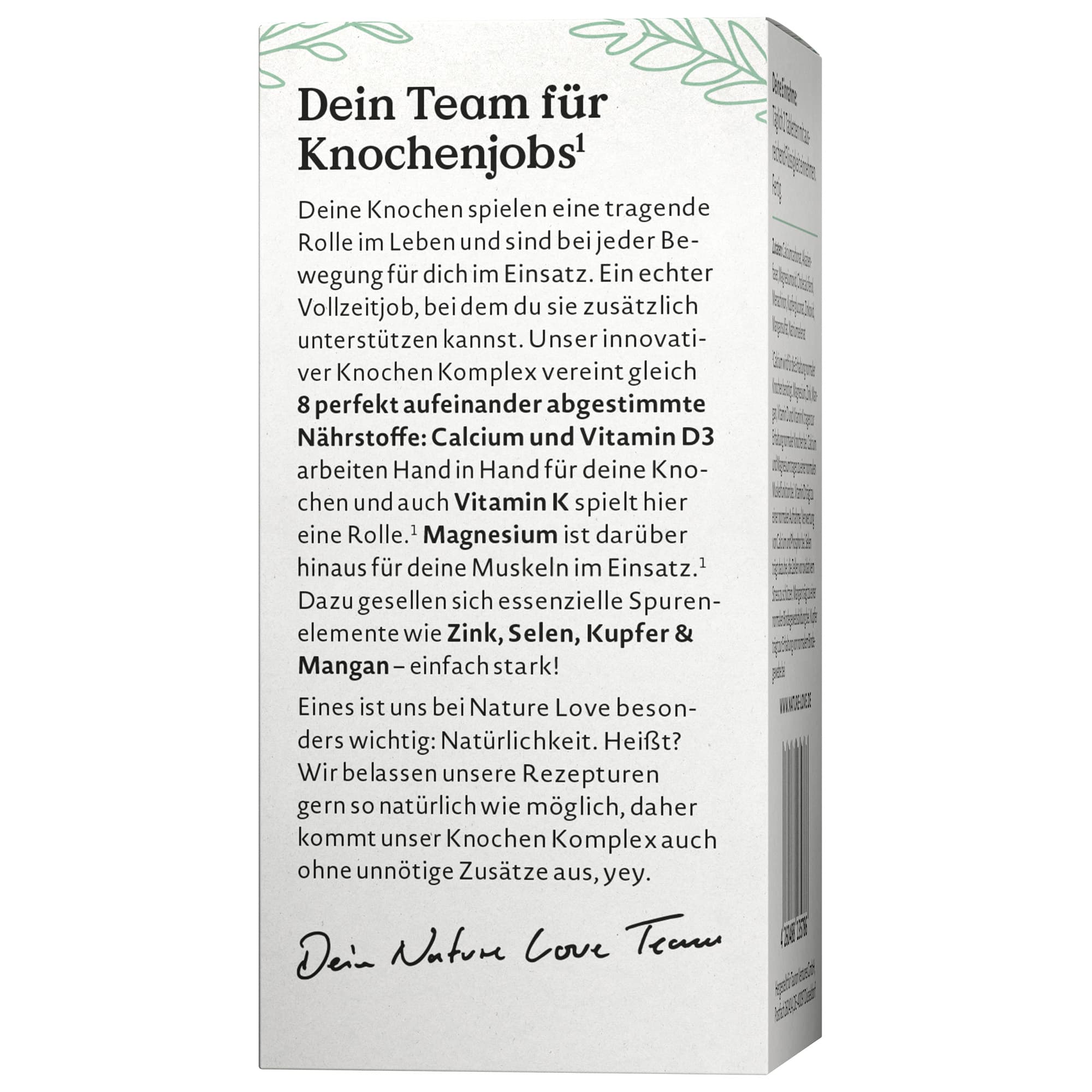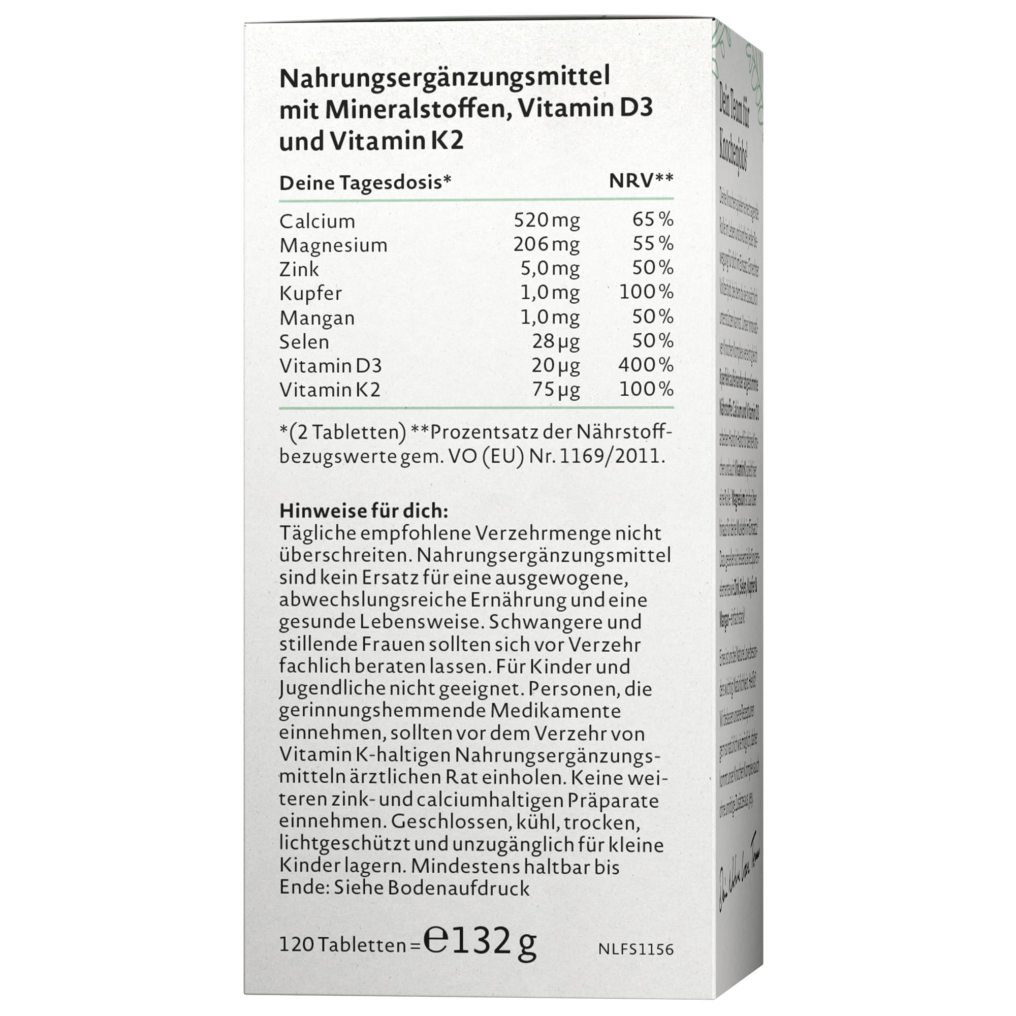 ¹Calcium wird für die Erhaltung normaler Knochen benötigt. Magnesium, Zink, Mangan, Vitamin D und Vitamin K tragen zur Erhaltung normaler Knochen bei. Calcium und Magnesium tragen zu einer normalen Muskelfunktion bei. Vitamin D trägt zu einer normalen Aufnahme/Verwertung von Calcium und Phosphor bei. Selen trägt dazu bei, die Zellen vor oxidativem Stress zu schützen. Mangan trägt zu einer normalen Bindegewebsbildung bei. Kupfer trägt zur Erhaltung von normalem Bindegewebe bei.