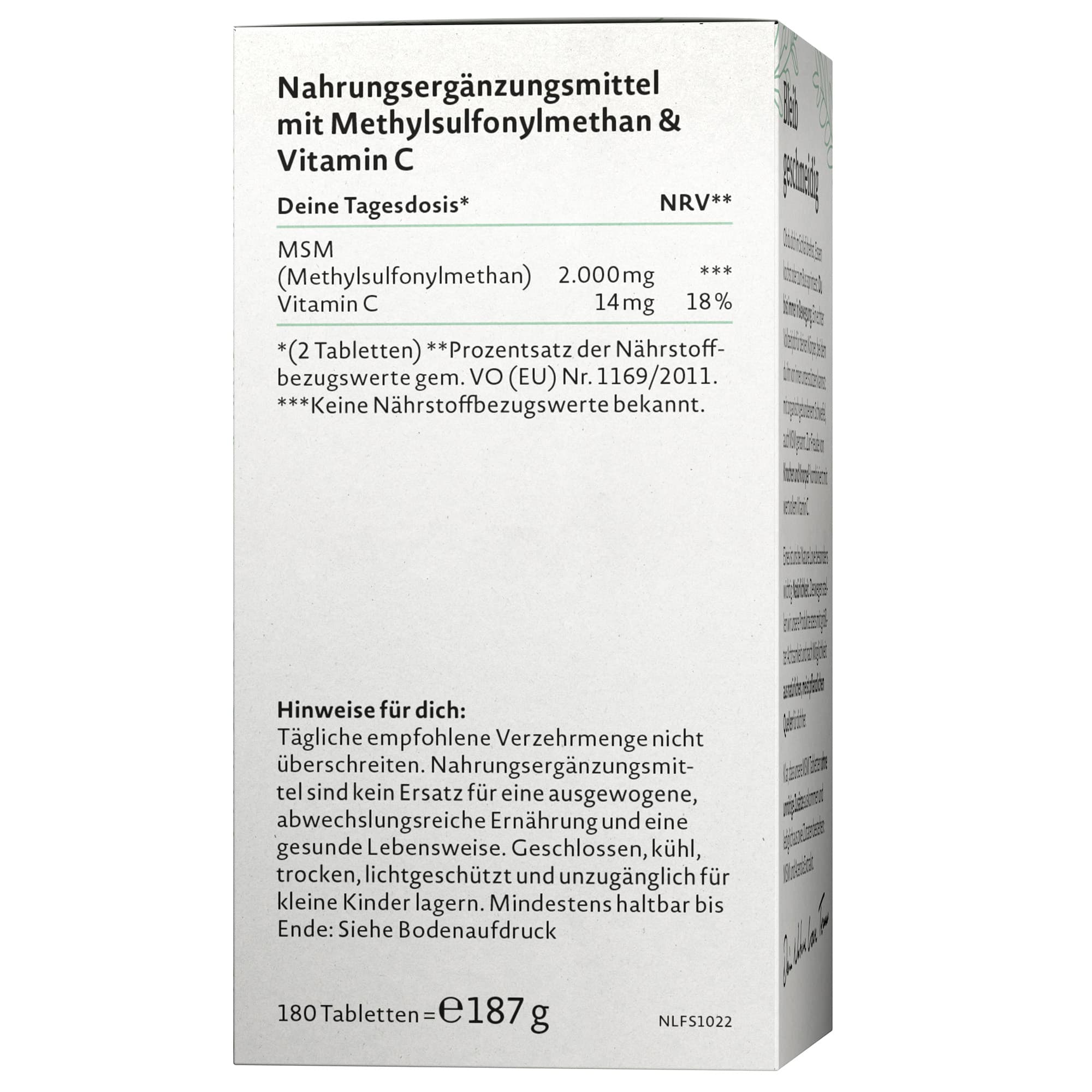 Die Rezeptur dieses Nahrungsergänzungsmittels von NATURE LOVE kombiniert hochdosiertes Methylsulfonylmethan, eine organische Schwefelverbindung, mit Vitamin C. Die Packung enthält 180 Einheiten und ist für eine Anwendungsdauer von drei Monaten ausgelegt. Das Produkt wird ohne den Einsatz von Füllstoffen oder anderen unnötigen Zusätzen gefertigt, um eine hohe Reinheit zu gewährleisten.