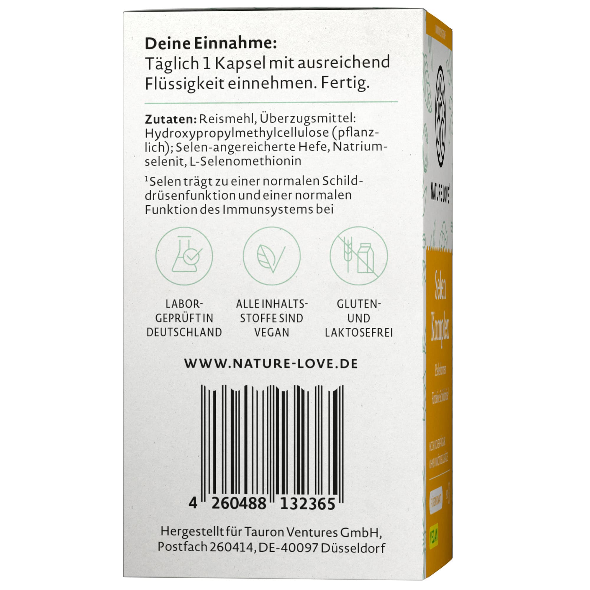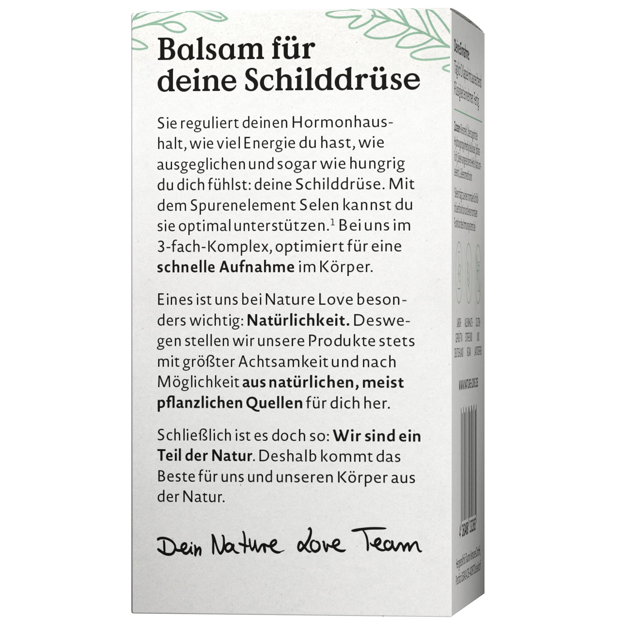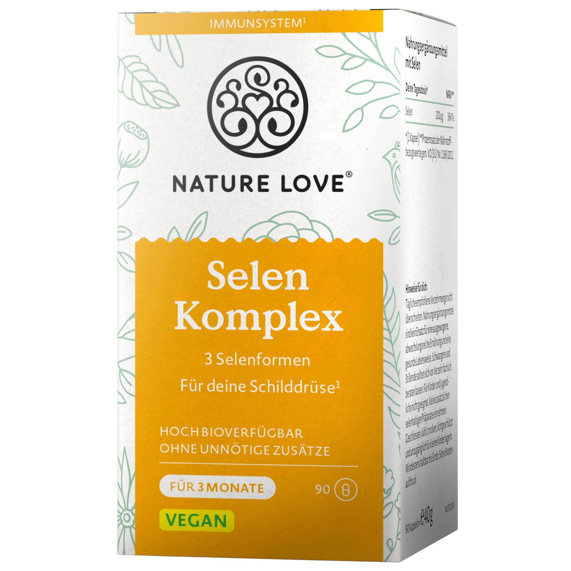 Der NATURE LOVE Selen Komplex ist ein Nahrungsergänzungsmittel, das zur Unterstützung einer normalen Schilddrüsenfunktion dient. Die Kapseln kombinieren drei verschiedene Selenformen für eine hohe Bioverfügbarkeit.