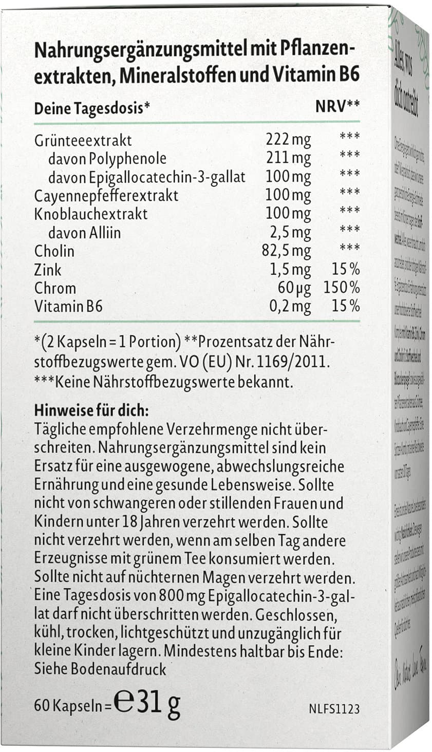 | Inhaltsstoffe | Erbsenfaser, Grünteeextrakt (Camellia sinensis), Cholinbitartrat, Überzugsmittel: Hydroxypropylmethylcellullose (pflanzlich); Cayennepfefferextrakt (Capsicum frutescens), Knoblauchextrakt (Allium sativum), Zinkbisglycinat, Chrompicolinat, Pyridoxal-5'-phosphat |