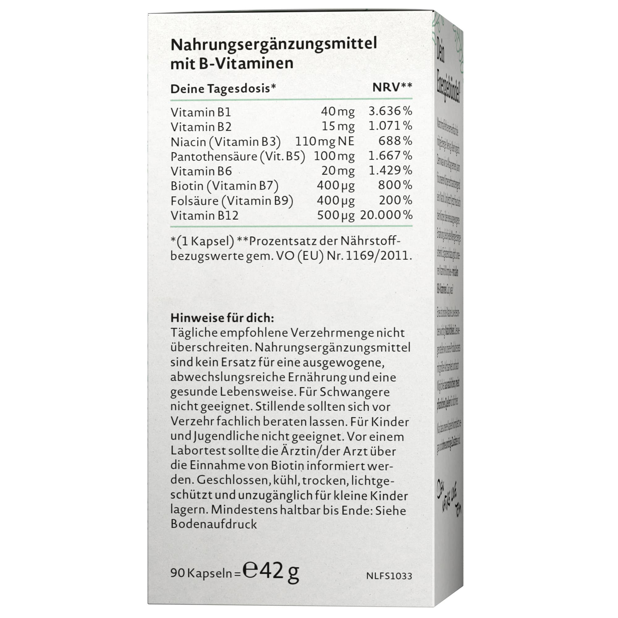 | Zutaten | Calcium-D-pantothenat, Nicotinamid, Überzugsmittel: Hydroxypropylmethylcellulose (pflanzlich); Thiaminhydrochlorid, Reismehl, Pyridoxal-5'-phosphat, Natrium-Riboflavin-5'-phosphat, Inositolniacinat, (6S)-5-Methyltetrahydrofolsäure, Glucosaminsalz;* D- Biotin, Methylcobalamin, 5'-Desoxyadenosylcobalamin, Hydroxocobalamin *Markenrohstoff: Quatrefolic® |