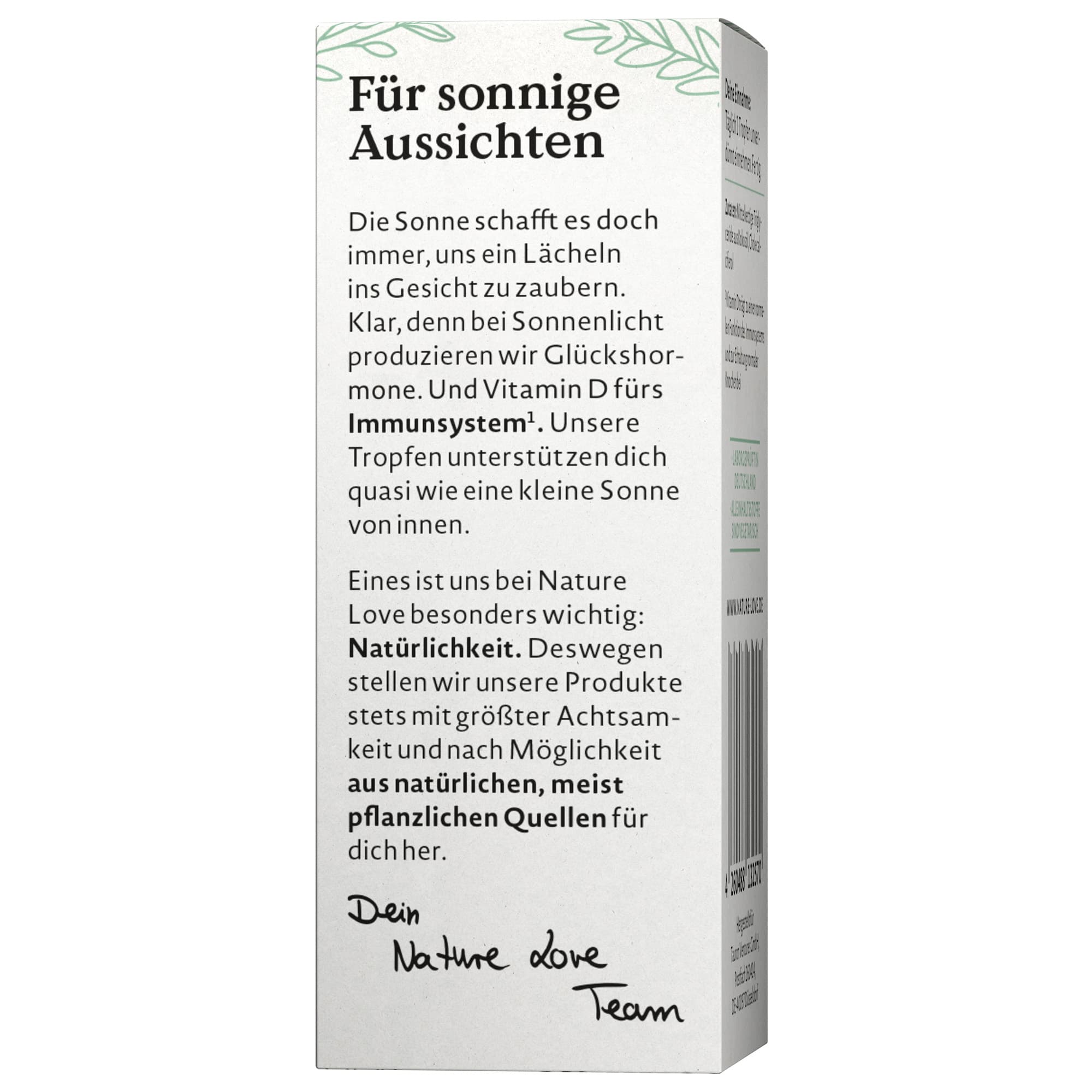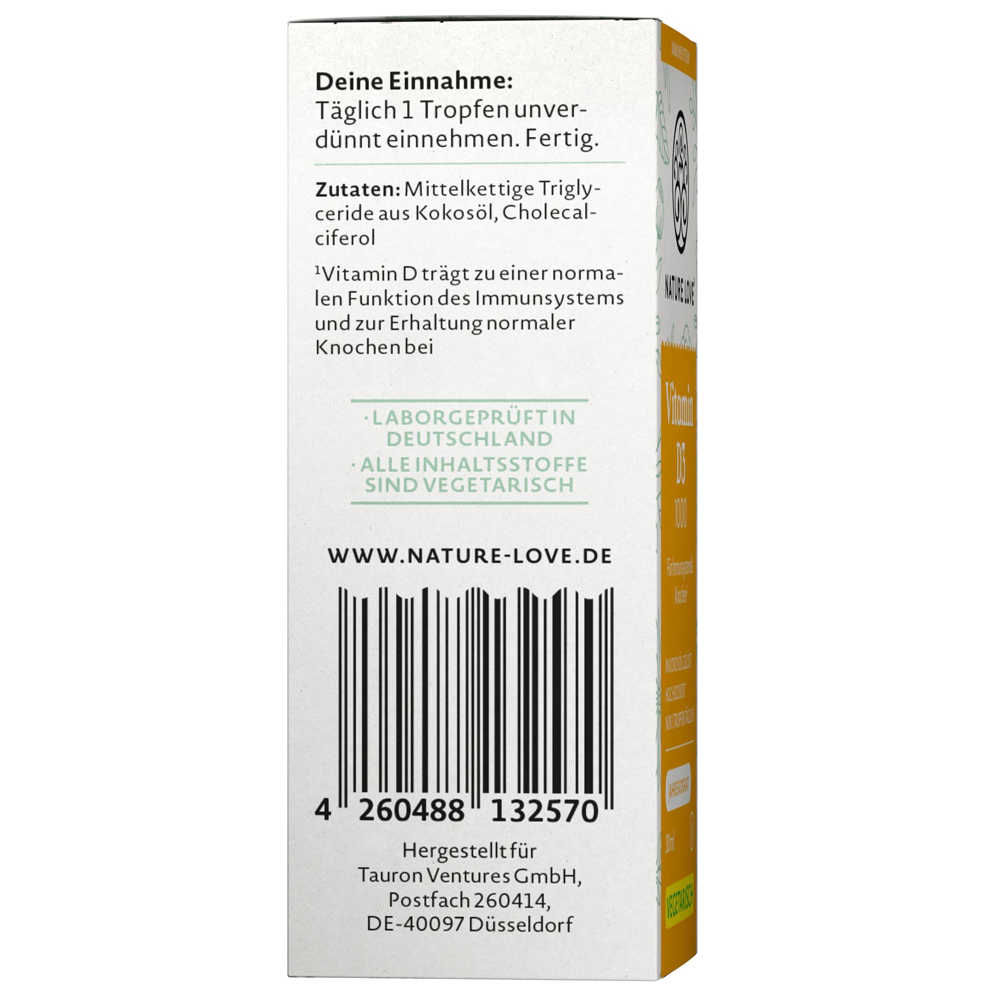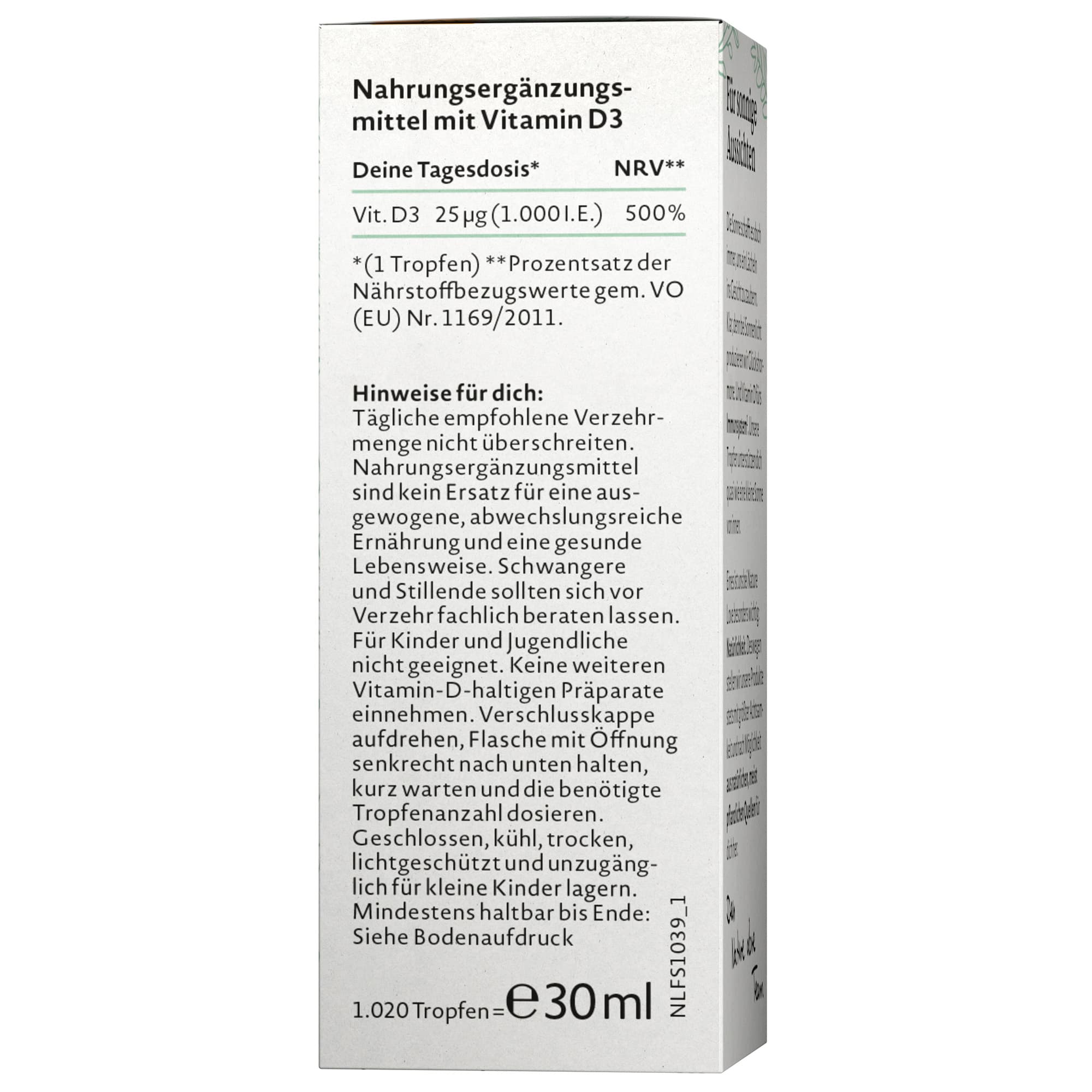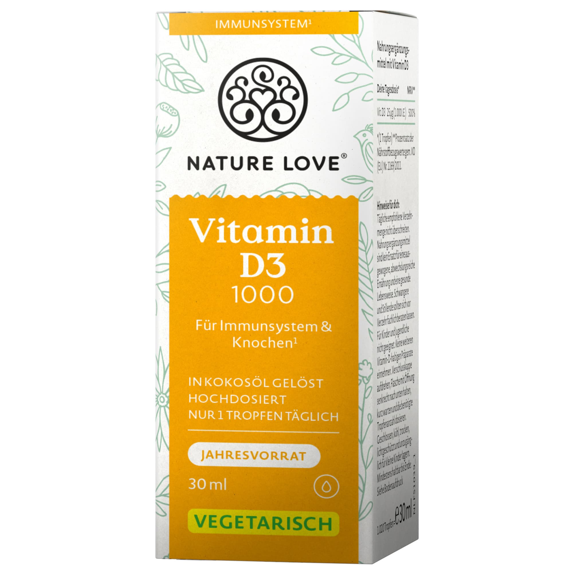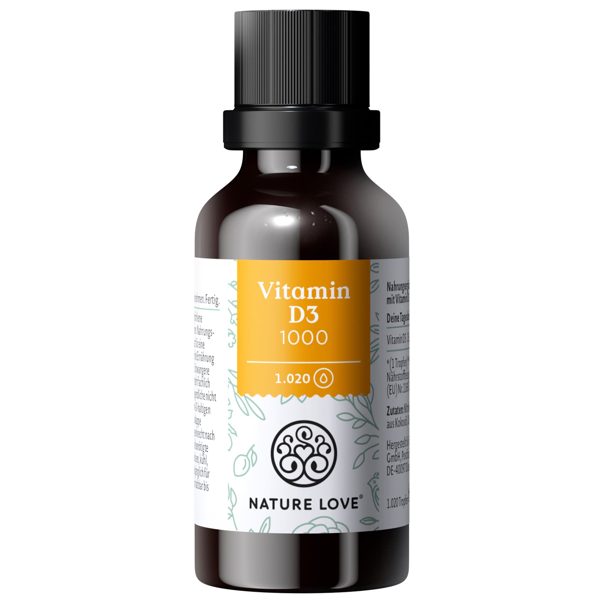 Die Vitamin D3 Tropfen von NATURE LOVE sind ein Nahrungsergänzungsmittel, das zur Unterstützung des Körpers dient. Die praktische Darreichungsform in Tropfen ermöglicht eine einfache und genaue Dosierung.