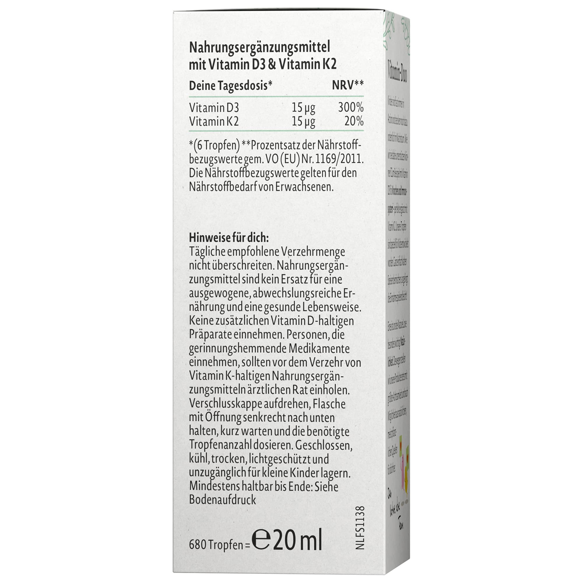 | Inhaltsstoffe | Mittelkettige Triglyceride aus Kokos, Cholecalciferol, Menachinon¹ ¹Markenrohstoff: MenaQ7® |