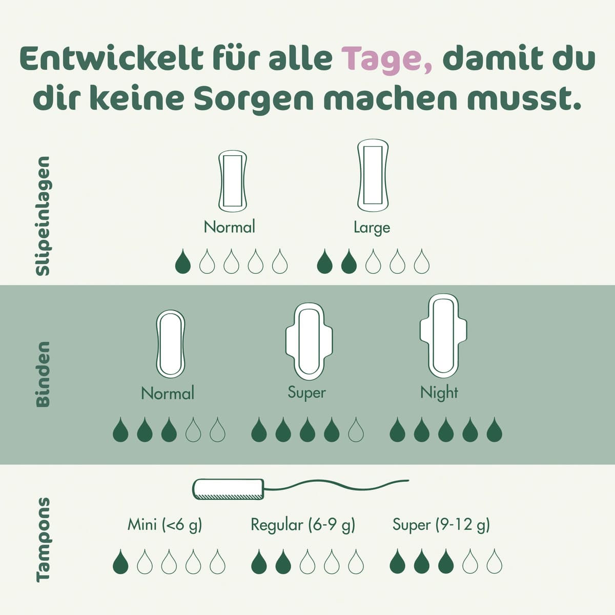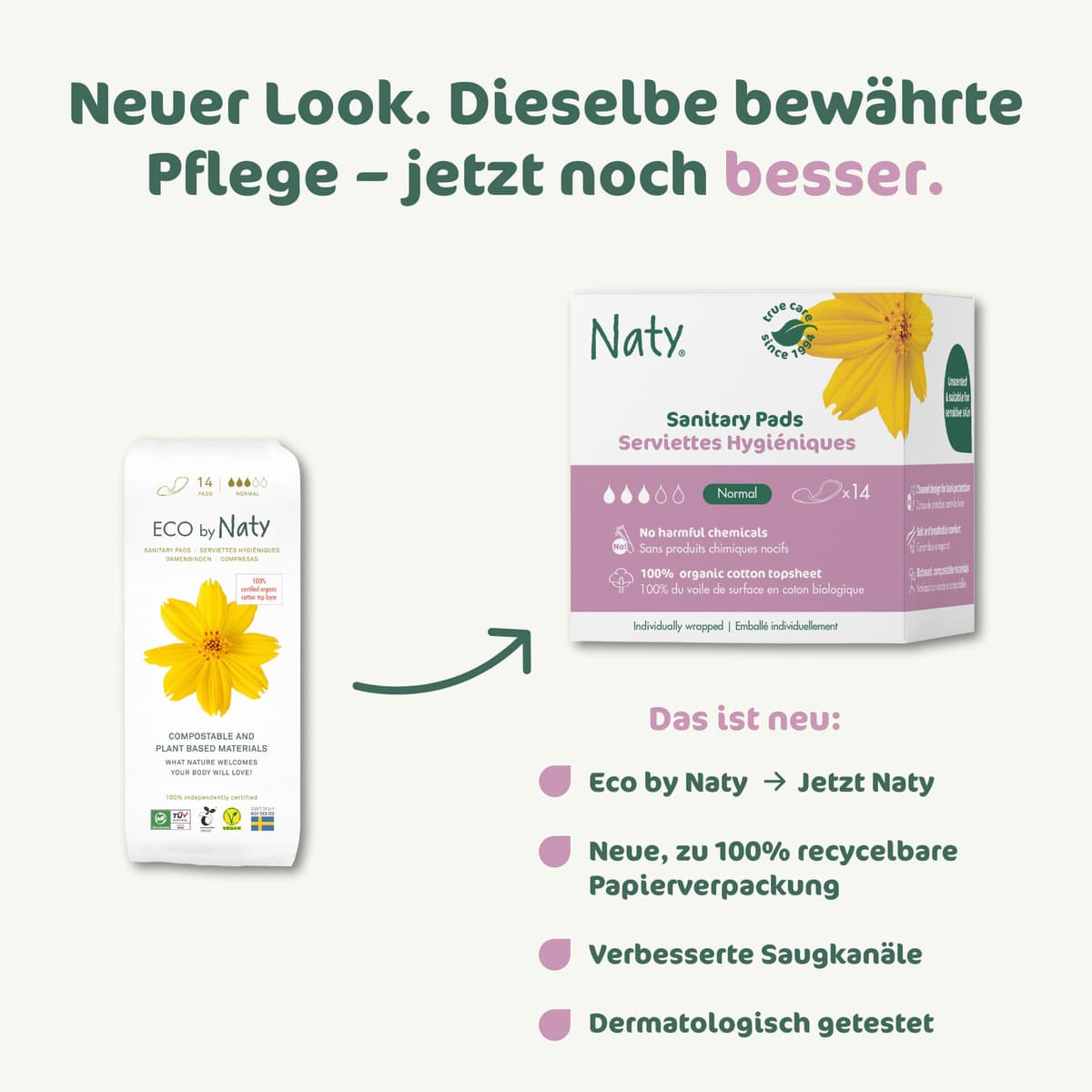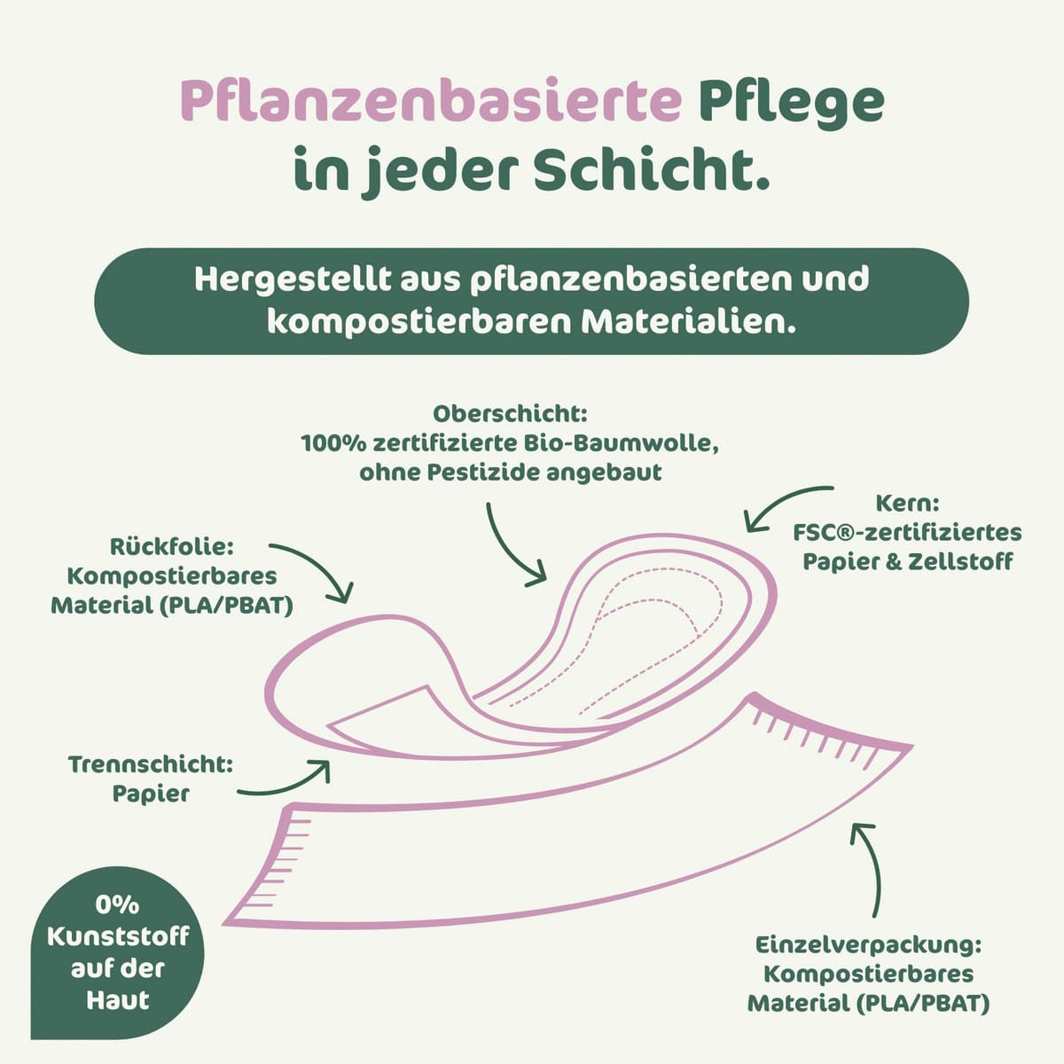 • Jede Damenbinde einzeln in kompostierbarem Material verpackt