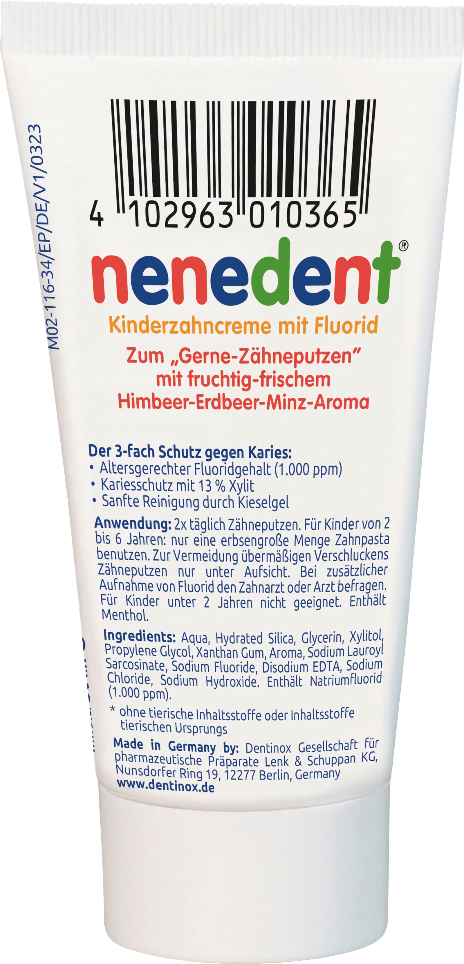 Die Zahncreme hat ein fruchtiges Himbeer-Erdbeer-Minz-Aroma und ist mit 500 ppm Fluorid angereichert, um in kindgerechter Dosierung den Zahnschmelz der Milchzähne zu härten. Der milchzahngerechte Abriebwert (RDA) von ca. 40 wird durch Kieselgel erreicht. So wird der empfindliche Zahnschmelz der Milchzähne optimal geschont. Das Signet"zahnfreundlich", durch das Zahnmännchen mit Schirm dargestellt, zeigt, dass die Kinderzahncreme nenedent durch unabhängige zahnmedizinische Prüfung als zahnfreundlich eingestuft wurde.
