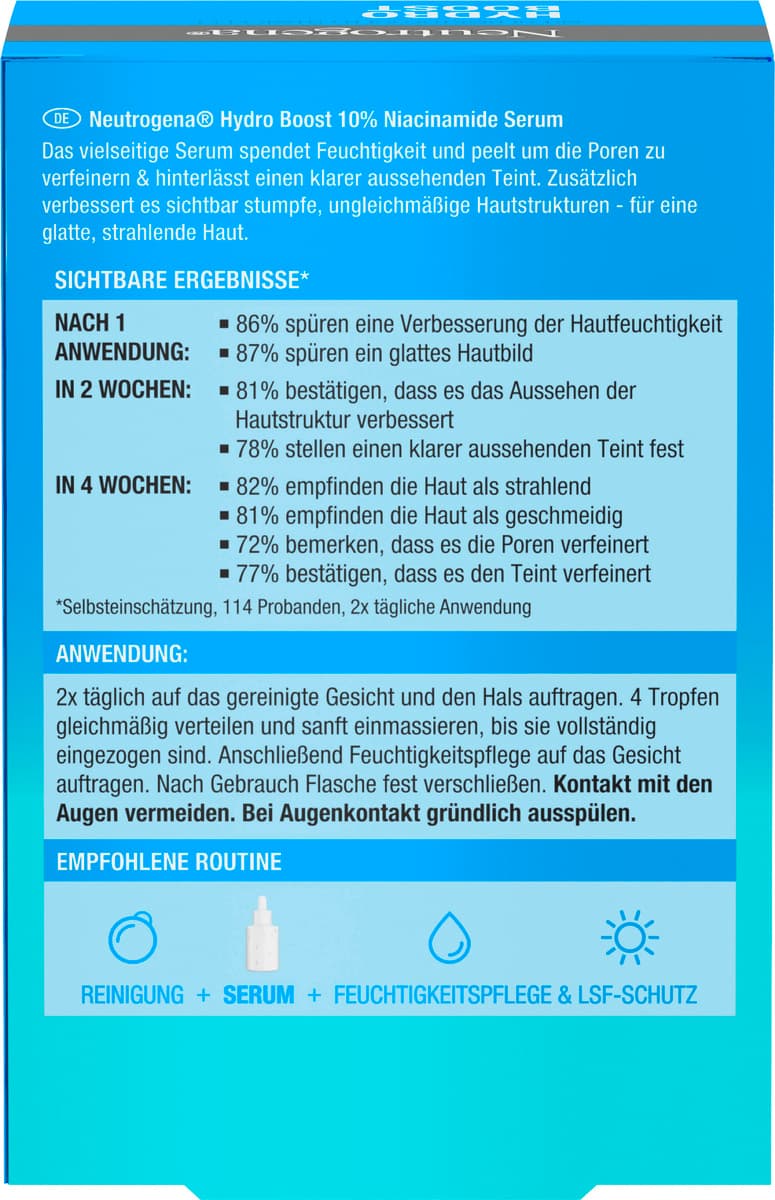 • Das parfümfreie Neutrogena Hydro Boost 10% Niacinamide Serum zieht besonders leicht & schnell ein, spendet bereits nach 1 Anwendung wichtige Feuchtigkeit und verleiht glatte & strahlende Haut
