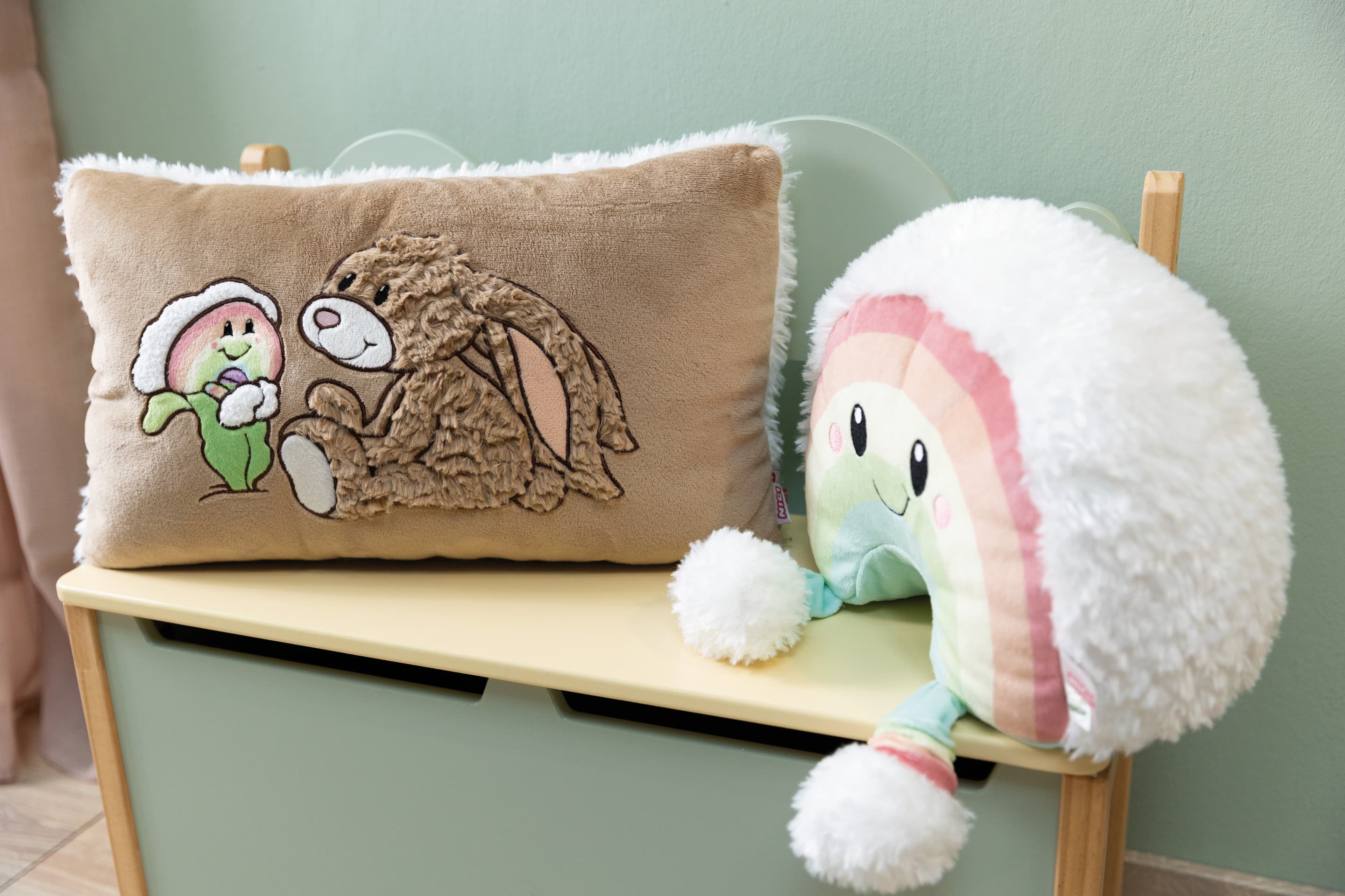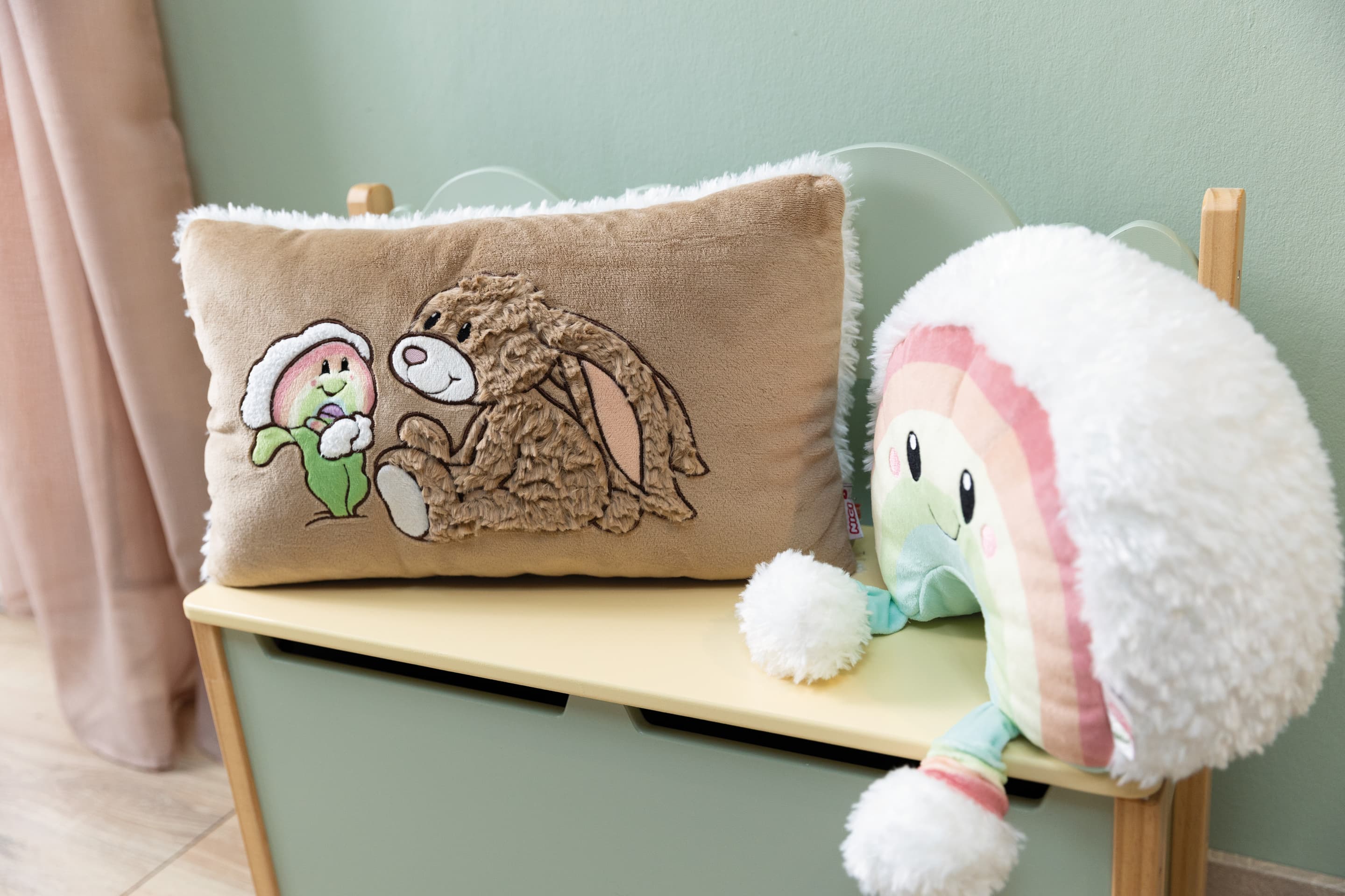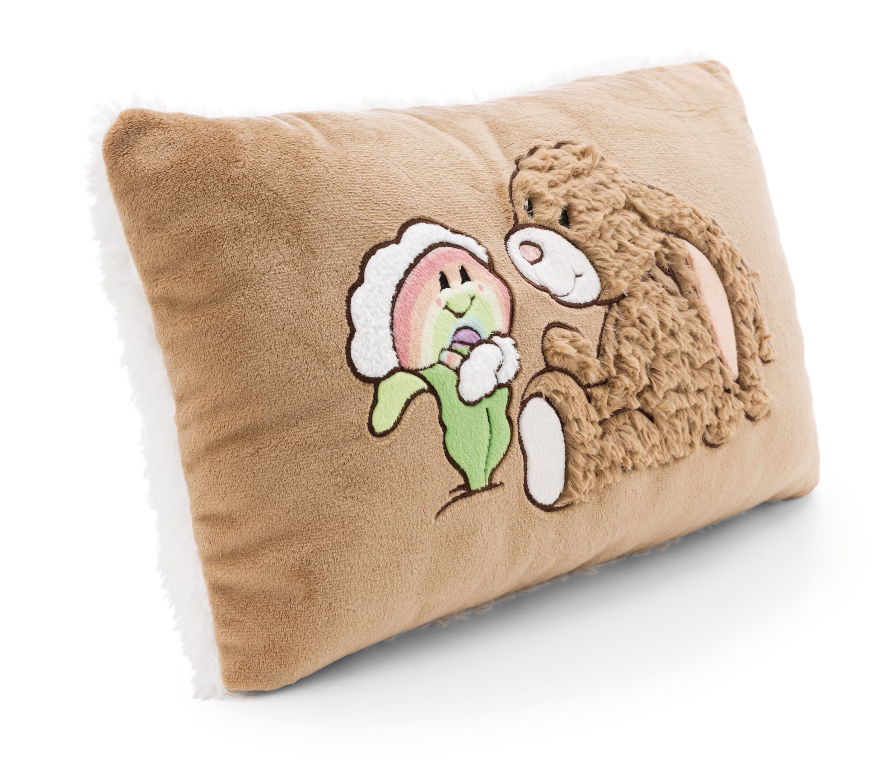 Mach es dir gemütlich mit dem trendigen Plüschkissen aus der Bears & Friends Kollektion von NICI in einem angesagtem Braunton! Das rechteckige Kissen ist nicht nur ein echter Hingucker, sondern auch ein wahres Kuschelparadies. Die Vorderseite zieren aufwändige Plüschapplikationen von Hase Lopino und dem fröhlichen Regenbogen Nibsi, die jedem Raum einen Hauch von Magie verleihen. Die Rückseite des Kissens besteht aus weißem, gelocktem Plüsch und lädt zum Verweilen und Entspannen ein. Ob als dekoratives Element in der Wohnung, zum Kuscheln auf der Couch oder als treuer Begleiter für süße Träume im Bett - dieses Kissen ist vielseitig einsetzbar! Ein Muss für alle, die das Besondere lieben! Das Kissen ist Teil der NICI GREEN Produktwelt. Für NICI GREEN Produkte verwenden wir fast ausschließlich Plüsch- und Füllstoffe, die aus recycelten Materialien bestehen. Hierfür werden vor allem alte PET-Flaschen zu RPET verarbeitet.