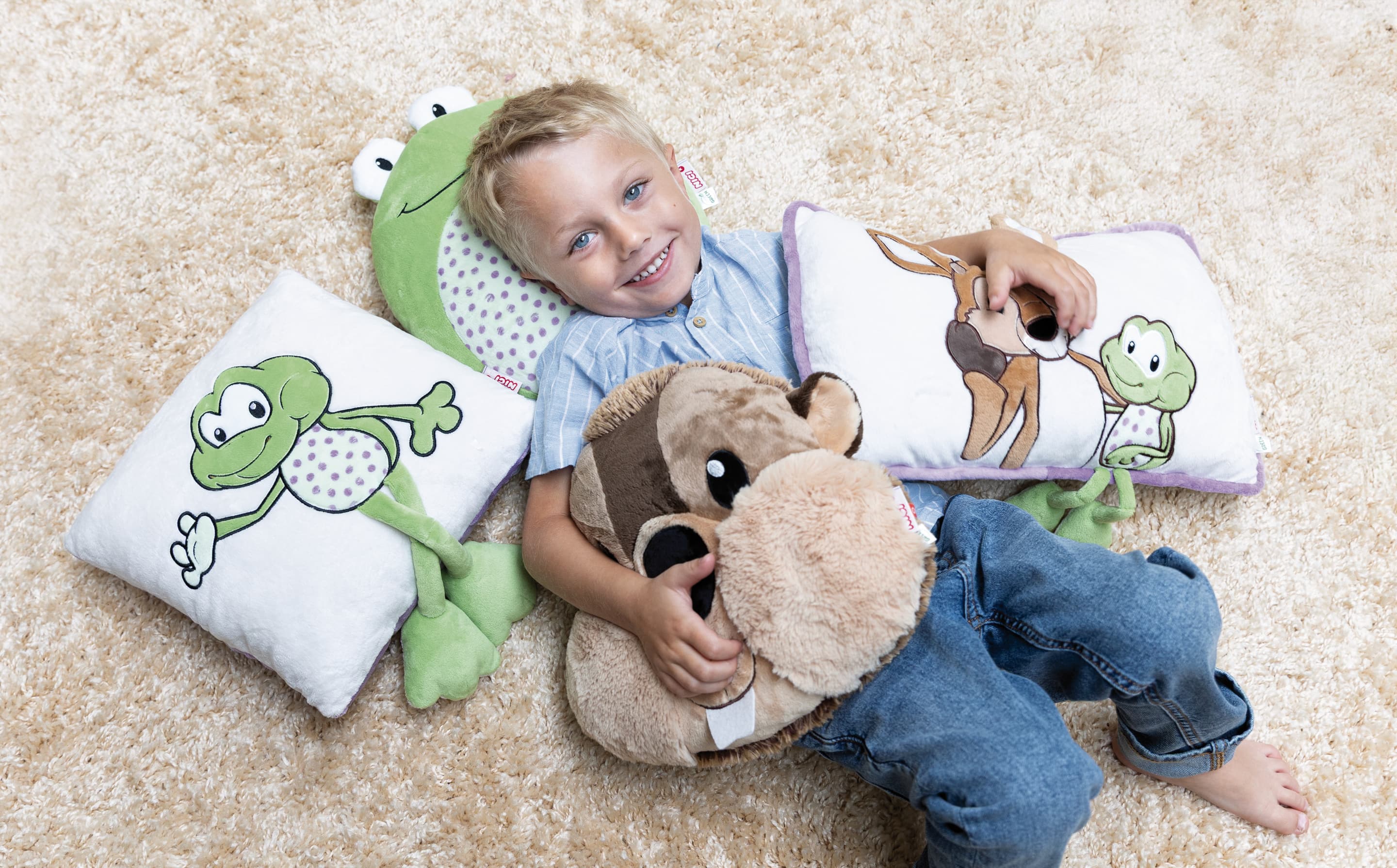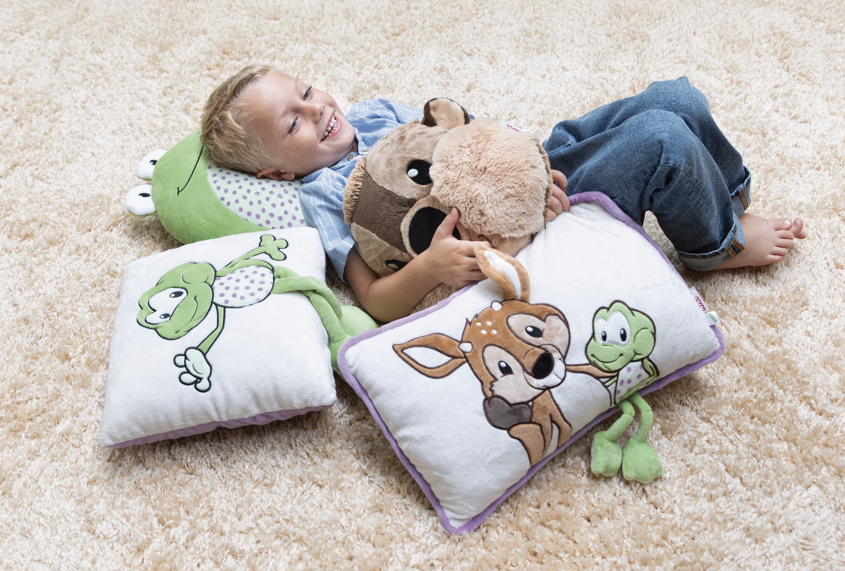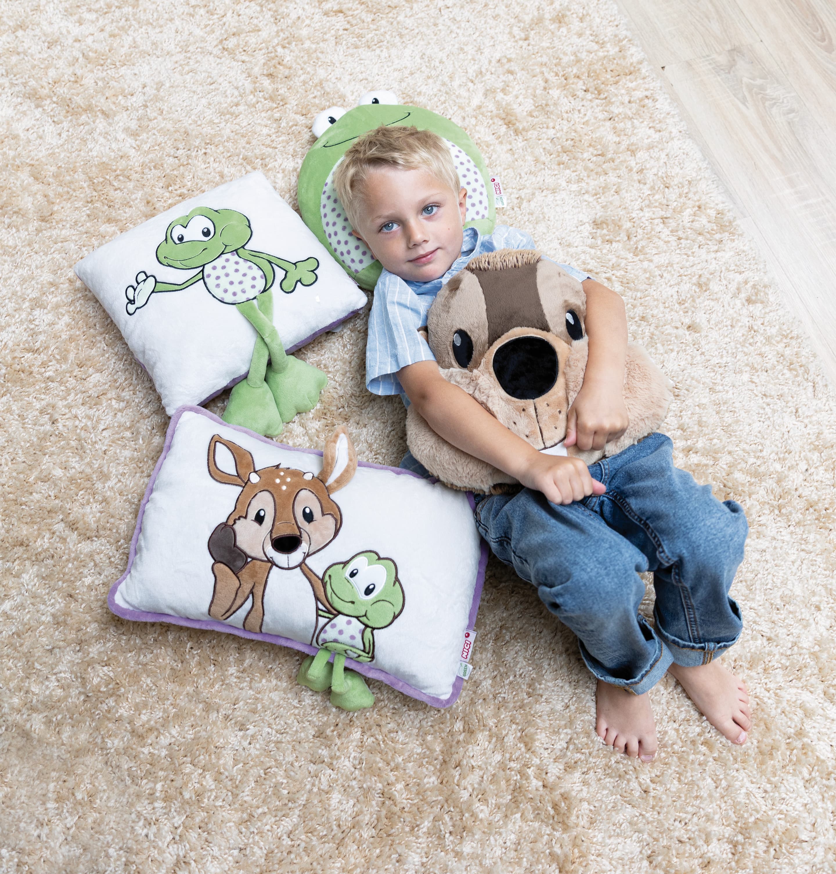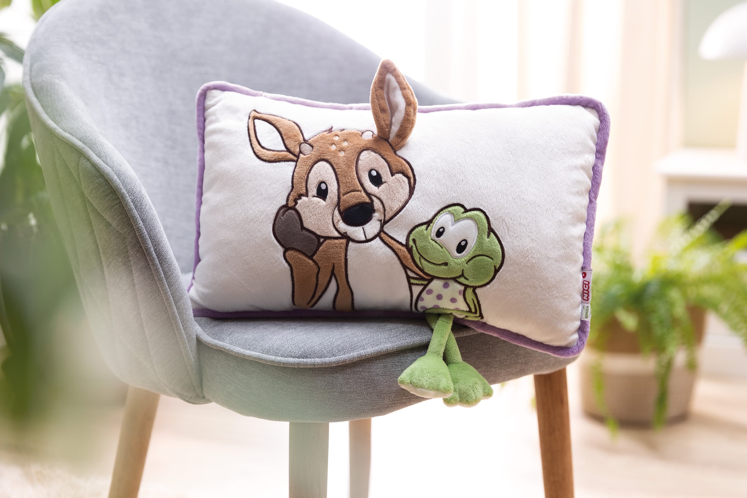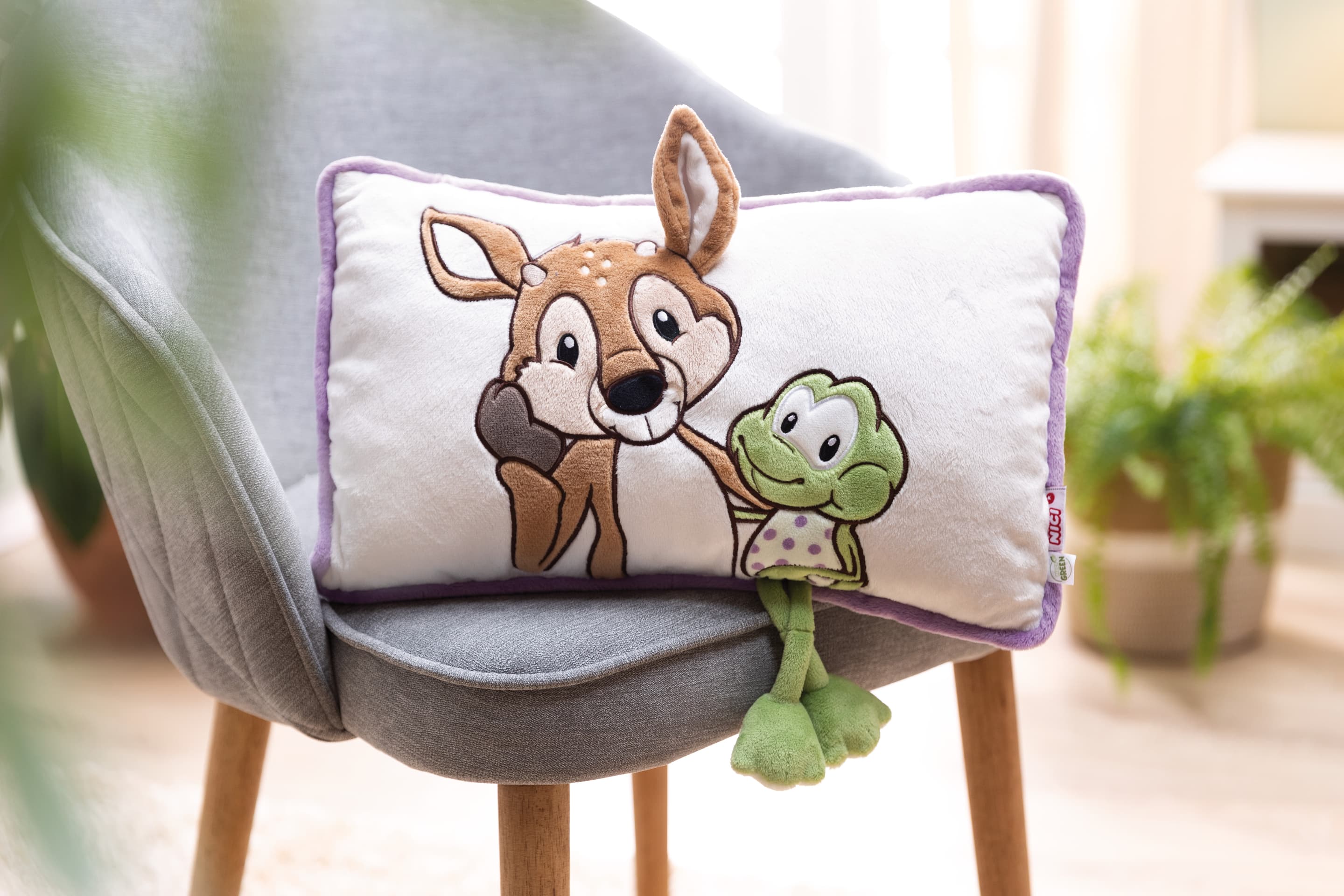 Das zauberhafte rechteckige Kuschelkissen aus flauschig weichem NICI Plüsch ist der perfekte Begleiter für gemütliche Stunden! Mit seiner hochwertigen Plüschapplikation von NICIs Forest Friends Fridolin Frog und René Roebuck bringt das Kissen nicht nur Farbe, sondern auch jede Menge Freude in jedes Zuhause. Das Besondere an diesem Kissen? René, der pfiffige Rehbock, hat ein Ohr, das als 3D-Plüschteil fröhlich über den Kissenrand ragt und zum Kuscheln einlädt! Und die langen, lustigen 3D-Froschbeine von Fridolin sorgen für zusätzlichen Spielspaß- ideal für kleine Abenteurer und große Träumer! Die lilafarbene Paspelierung verleiht dem Kissen einen fröhlichen Akzent, während die beige Rückseite mit den lilafarbenen Punkten für einen verspielten Look sorgt. Ob zum Relaxen auf dem Sofa, als Deko-Element im Kinderzimmer oder als treuer Begleiter auf Reisen - dieses Kuschelkissen ist ein Muss für alle, die das Leben bunt und kuschelig lieben! Das Kissen ist Teil der NICI GREEN Produktwelt. Für NICI GREEN Produkte verwenden wir fast ausschließlich Plüsch- und Füllstoffe, die aus recycelten Materialien bestehen. Hierfür werden vor allem alte PET-Flaschen zu RPET verarbeitet.