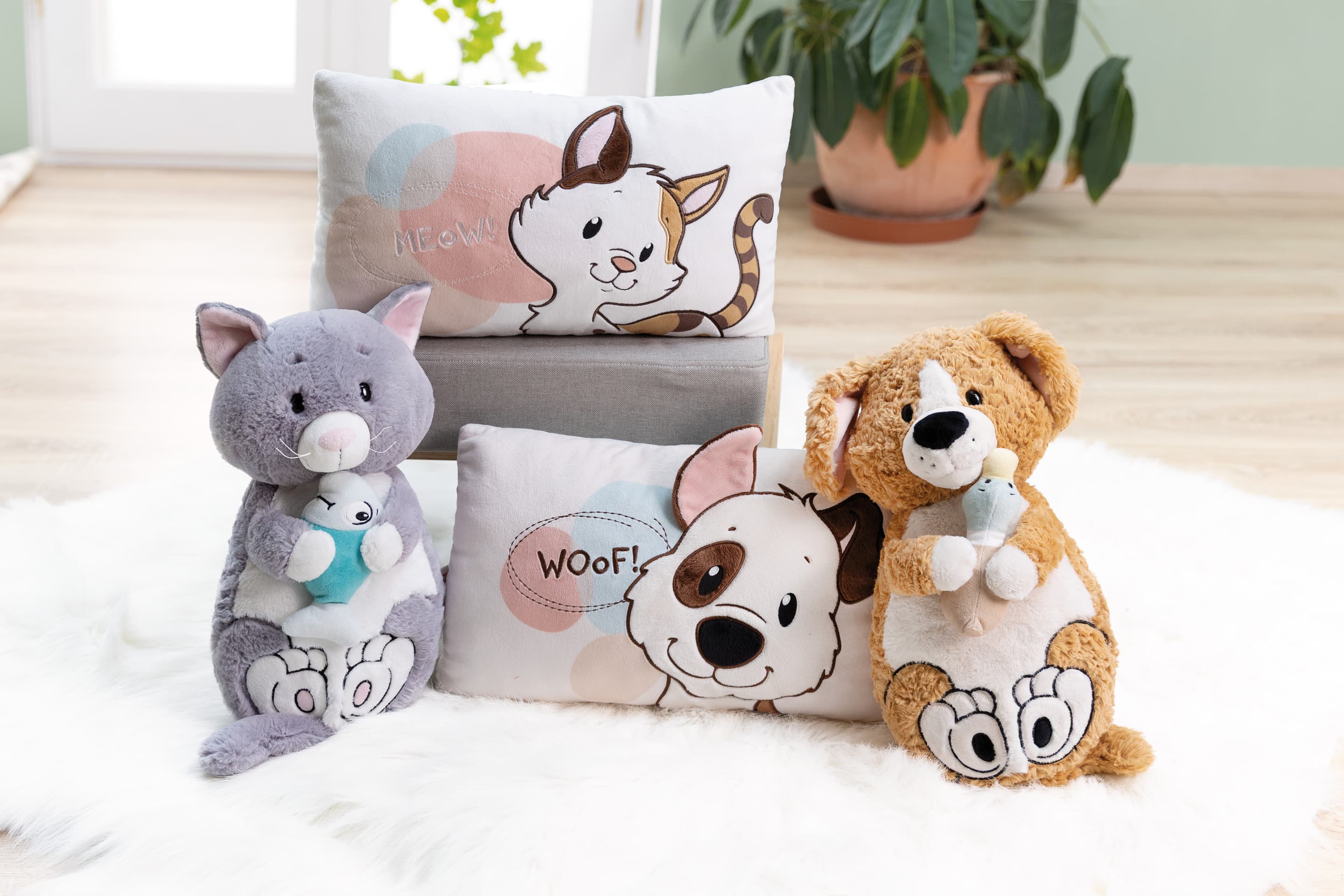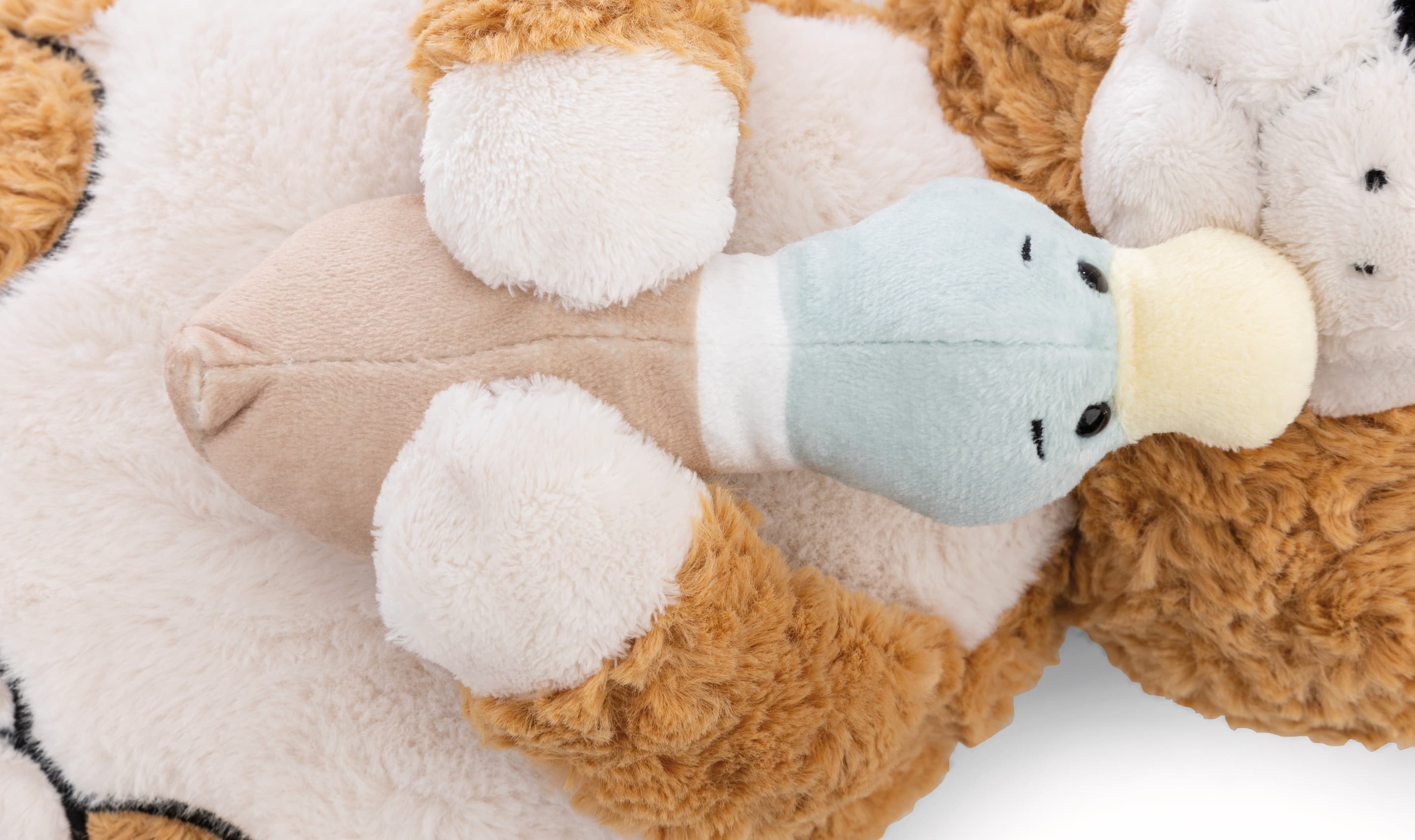 Wäre es nicht schön, wenn das geliebte Kuscheltier gleichzeitig auch ein flauschiges Kissen ist? Der fluffige, braune Hund aus der Homies Kollektion von NICI vereint mit seiner figürlichen, flächigen Form alle Eigenschaften eines Kuscheltierkissens. Ob zum Schlafen, Lesen, Kuscheln oder Spielen, der niedliche Hund aus hochwertigem NICI-Plüsch, der seine Freundin, eine kleine süße Plüschente zwischen den Pfoten hält, macht alles gerne mit. Ein zauberhaftes Geschenk für kleine und große Hundefreunde! Der Hund ist Teil der NICI GREEN Produktwelt. Für NICI GREEN Produkte verwenden wir fast ausschließlich Plüsch- und Füllstoffe, die aus recycelten Materialien bestehen. Hierfür werden vor allem alte PET-Flaschen zu RPET verarbeitet.