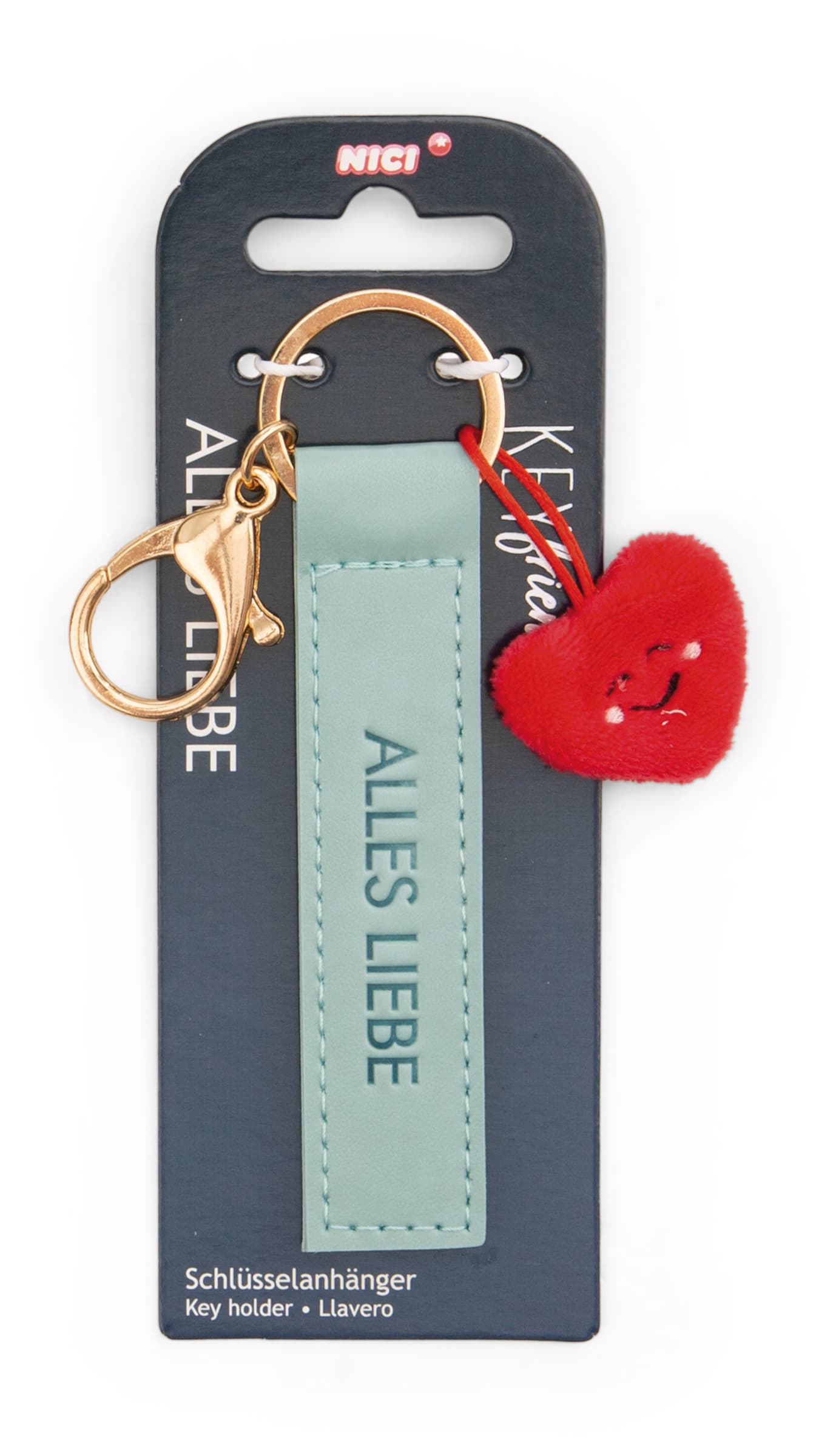 Als perfekter Begleiter für den Alltag zieht der türkisfarbene Schlüssel- und Taschenanhänger aus der Key Friends Kollektion von NICI alle Blicke auf sich! Der coole Anhänger mit Karabiner vereint Funktionalität mit modischem Design und ist ein echtes Fashion-Statement. Mit der geprägten Botschaft Alles Liebe auf einem hochwertigen Kunstlederband setzt der Anhänger einen echten Lifestyle-Trend. Ein kleines, rotes Herz aus Plüsch rundet das Gesamtbild ab und zaubert einen Hauch von Verspieltheit. Ob am Schlüsselbund, Rucksack, Koffer oder als modisches Accessoire – der Key Friends Schlüssel- und Taschenanhänger verleiht jedem Look das gewisse Etwas. Ideal als liebevolles Mitbringsel für Freunde und Familie!