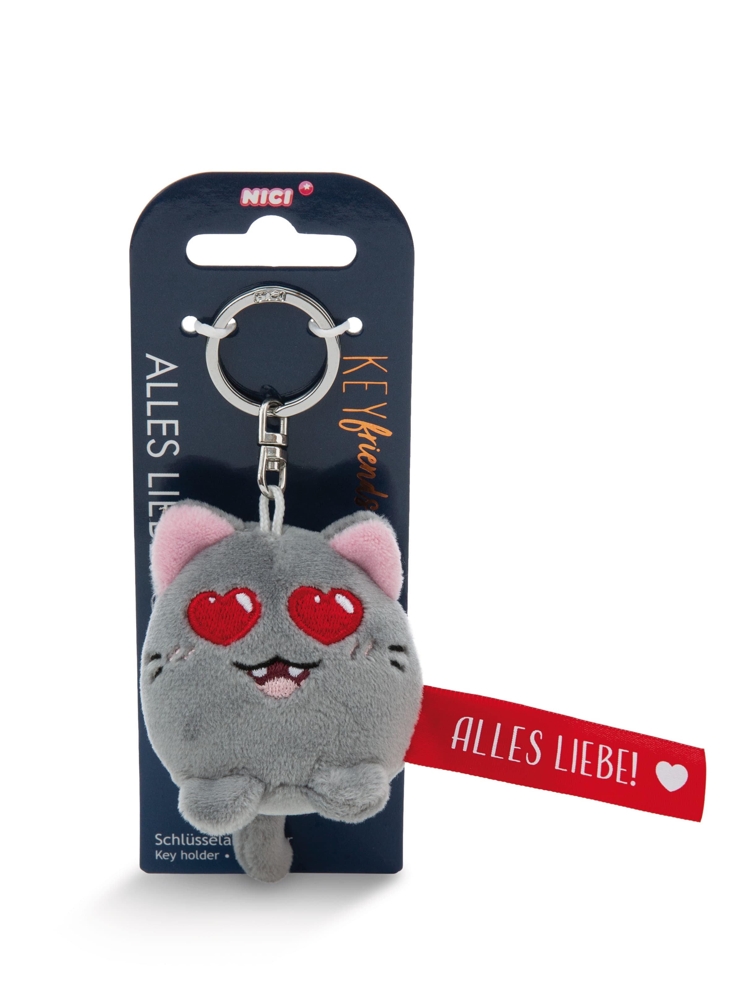 Zaubere Liebe und Freude in den Alltag mit der süßen NICI Katze aus flauschig weichem Plüsch! Dieser kleine, kuschelige Handschmeichler besticht durch seine feurig roten Herzaugen und das rote Spruchband mit der liebevollen Botschaft Alles Liebe! machen ihn zu einem perfekten Geschenk für deine Liebsten. Dank des stabilen Schlüsselrings aus Metall lässt sich die Plüschkatze ganz einfach an Taschen, Rucksäcken oder Schlüsseln befestigen. Als treue Begleiterin schenkt sie Wärme und Zuneigung und ist als kleiner Glücksbringer im Alltag oder als zauberhafte Überraschung zu besonderen Anlässen – eine wunderbare Möglichkeit, um Gefühle auszudrücken. Ein perfektes Accessoire für alle, die das Leben mit einem Hauch von Liebe und Kuscheligkeit bereichern möchten!