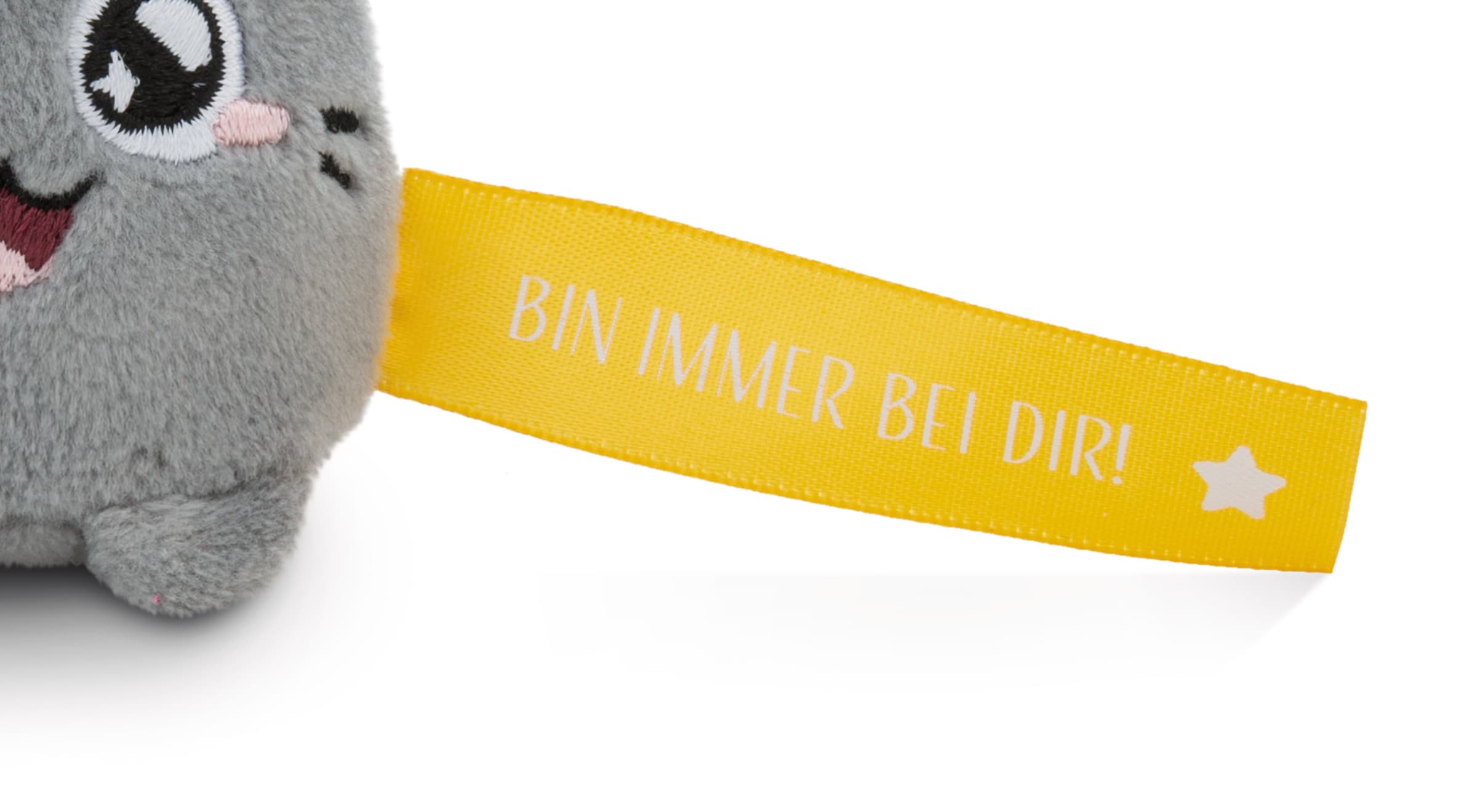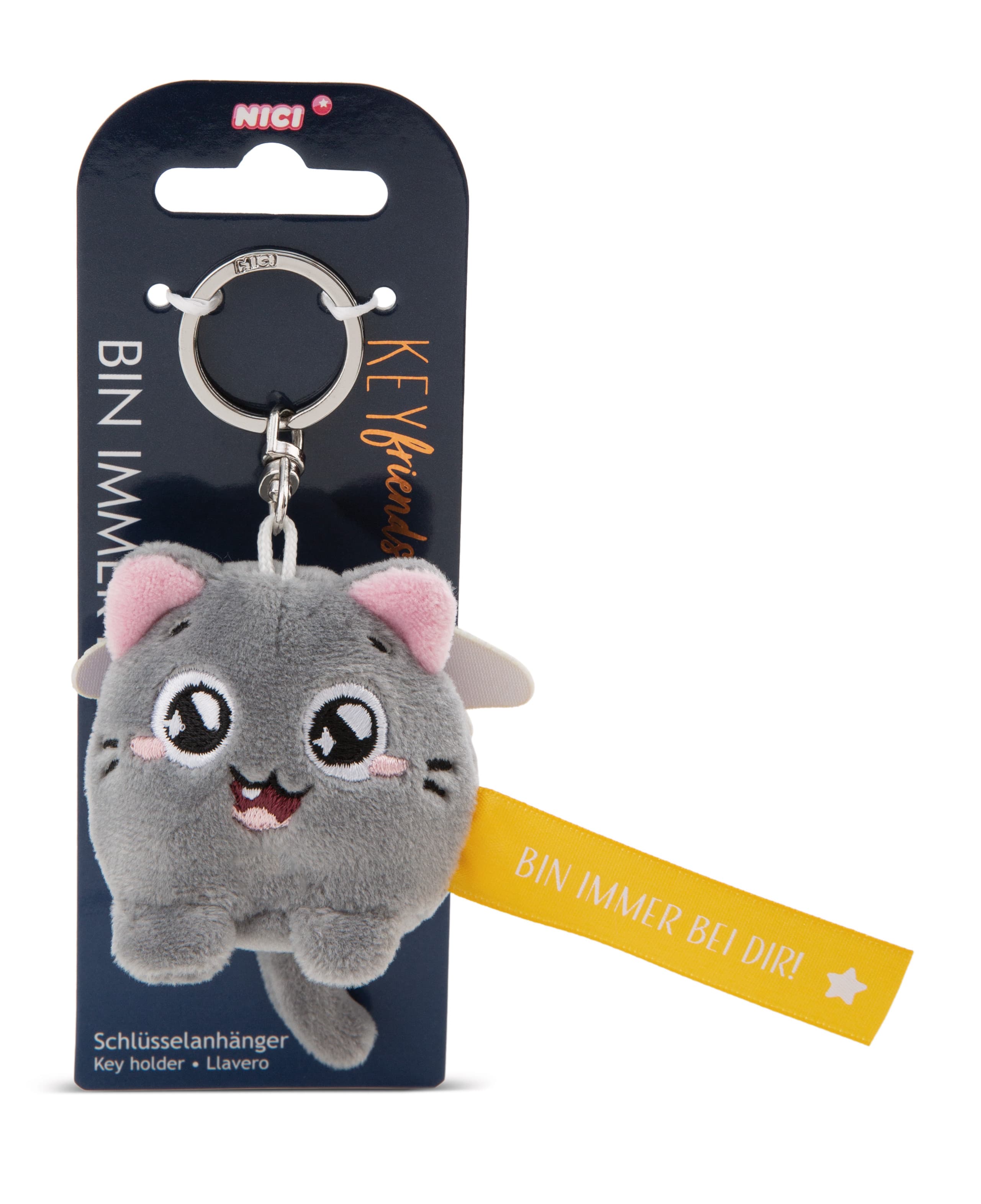 Das graue, kuschelige Plüschkätzchen mit kleinen Schutzengel-Flügelchen und großen Augen ist nicht nur ein echter Handschmeichler, sondern auch ein liebevoller Überbringer der Botschaft Bin immer bei dir!, die auf einem fröhlich gelben Spruchband vermerkt ist. Dank des stabilen Metall-Schlüsselrings lässt sich die Kuschelkatze mühelos an Taschen, Rucksäcken oder Schlüsseln befestigen. So hat man stets eine treue Begleiterin an der Seite, die ein Gefühl von Nähe und Geborgenheit vermittelt. Ob als kleiner Glücksbringer im Alltag oder als herzliche Überraschung zu besonderen Anlässen – dieser Plüsch-Anhänger ist das ideale Geschenk für Menschen jeden Alters, das signalisiert - du bist nicht allein.