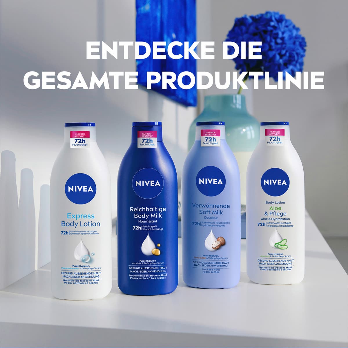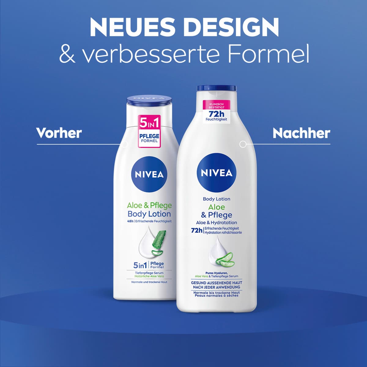 Für alle, die mehr als nur Feuchtigkeit von einer Body Lotion erwarten. Die verbesserte Formel der NIVEA® Aloe&Pflege Body Lotion ist angereichert mit purem Hyaluron, Aloe Vera und NIVEA Tiefenpflege Serum und spendet Ihrer Haut 72h intensive Feuchtigkeit. Für eine gesund aussehende Haut nach jeder Anwendung. Nicht-fettend und schnell einziehend. Für einen Effekt, den Sie nicht nur fühlen, sondern auch sehen können: NIVEA Aloe&Pflege Body Lotion. Hautverträglichkeit dermatologisch bestätigt.NIVEA aus Liebe zu Haut und Umwelt: Flasche aus 50% recyceltem Plastik (ohne Verschluss). Unser Pflegeversprechen: Wir nutzen unsere über 100-jährige Erfahrung in der Hautpflege zur sorgfältigen Auswahl aller Inhaltsstoffe nach unseren NIVEA Qualitätsstandards.