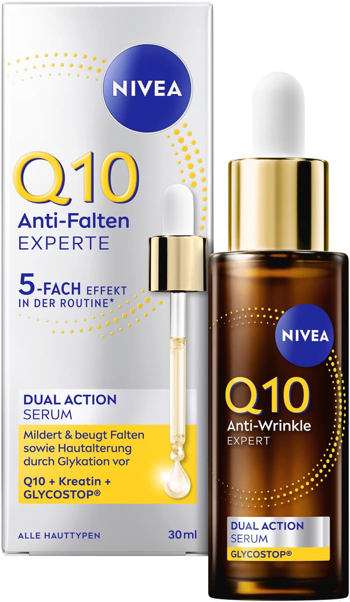Das NIVEA Q10 Anti-Falten EXPERTE Dual Action Serum ist eine Spezialpflege, die auf eine zweifache Weise zur Milderung von Falten beiträgt. Die Formel mit Anti-Glykationstechnologie zielt darauf ab, das Erscheinungsbild der Haut zu pflegen.
