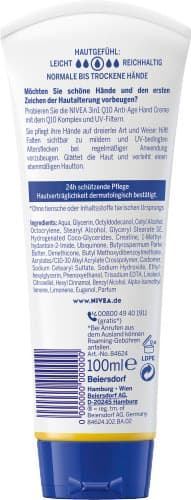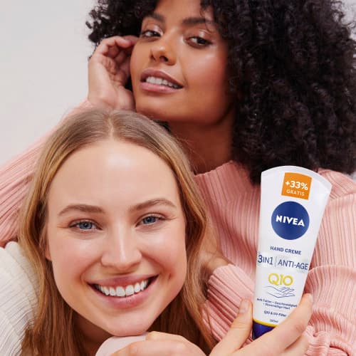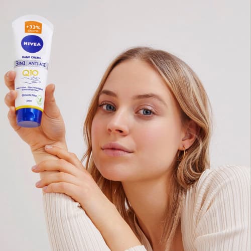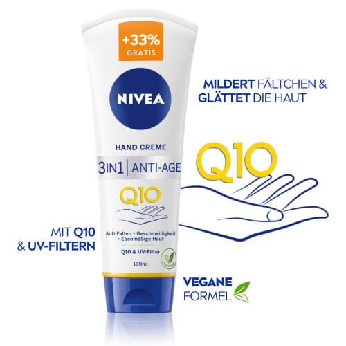 Wünschen Sie sich schöne, geschmeidige Hände und möchten den ersten Alterszeichen vorbeugen? Dann probieren Sie die NIVEA 3in1 Anti-Age Hand Creme mit veganer Formel. Sie beinhaltet hauteigenes Q10 und UV Filter. So wirkt sie gleich drei-fach: mildert Fältchen sichtbar, spendet Ihren Händen intensive Feuchtigkeit und schützt vor UV-bedingten Altersflecken. Für einen Effekt den Sie nicht nur fühlen, sondern auch sehen können: NIVEA 3in1 Anti-Age Care Q10 Hand Creme Vorteilsgröße.