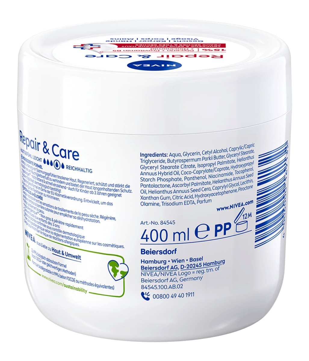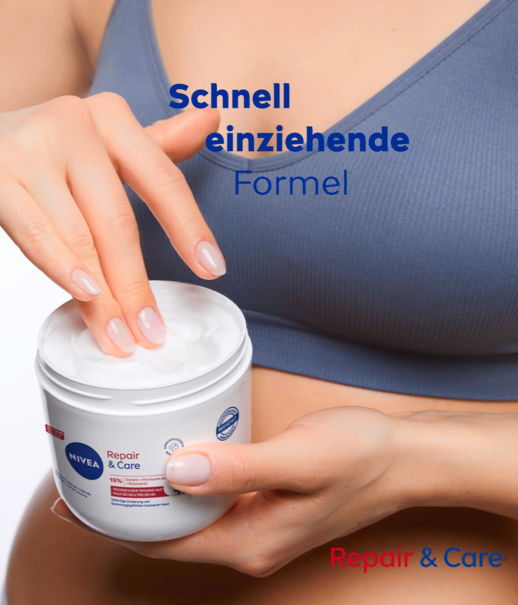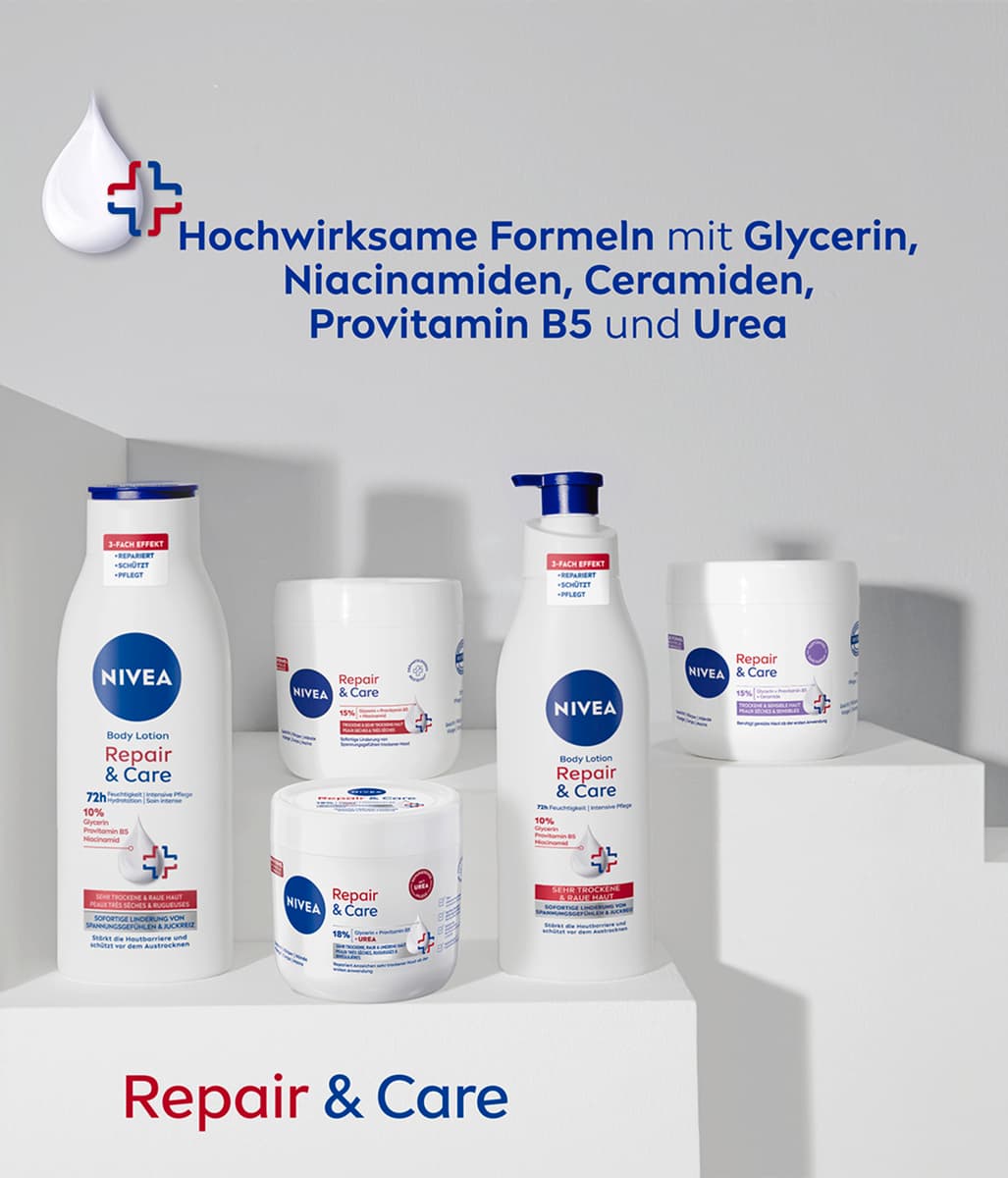 Die NIVEA Repair & Care Körpercreme ist eine Pflege, die speziell für die Bedürfnisse von sehr trockener und rauer Haut konzipiert wurde. Ihre Formel mit Vitamin E und 12 % Glycerin verleiht ein angenehmes Hautgefühl.