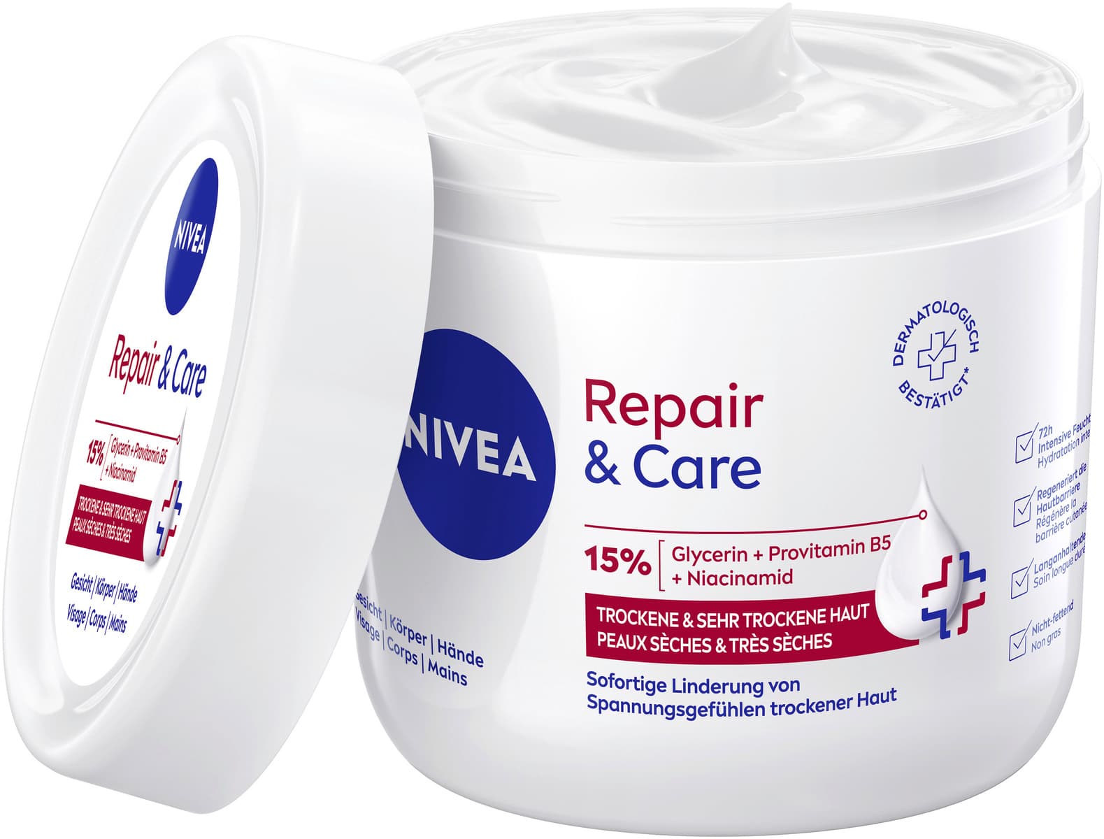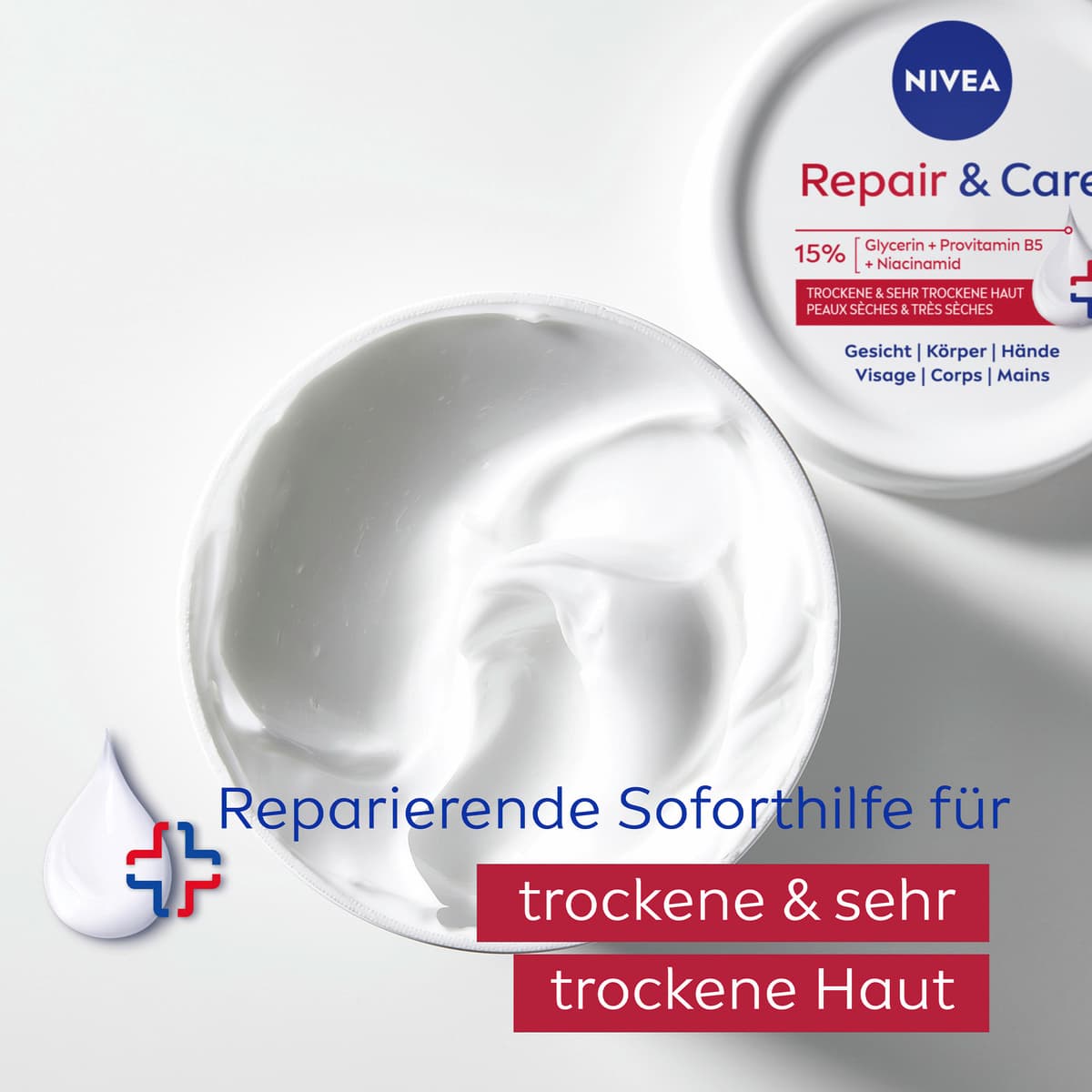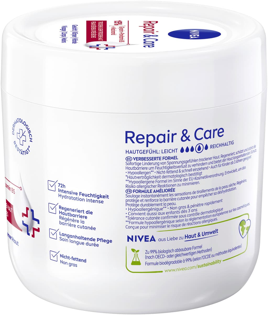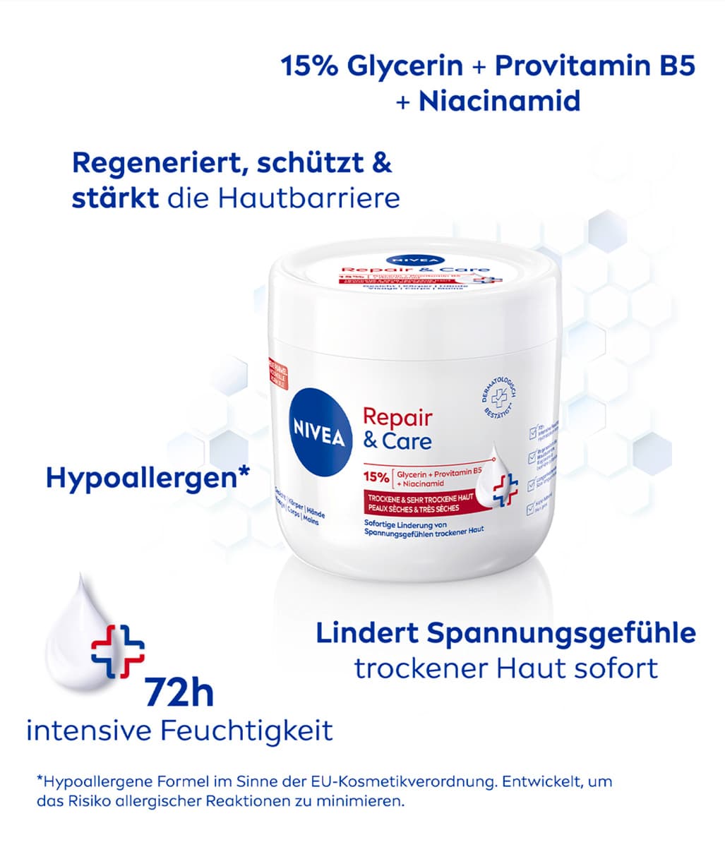 Die NIVEA Repair & Care Körpercreme ist eine Pflege, die speziell für die Bedürfnisse von sehr trockener und rauer Haut konzipiert wurde. Ihre Formel mit Vitamin E und 12 % Glycerin verleiht ein angenehmes Hautgefühl.