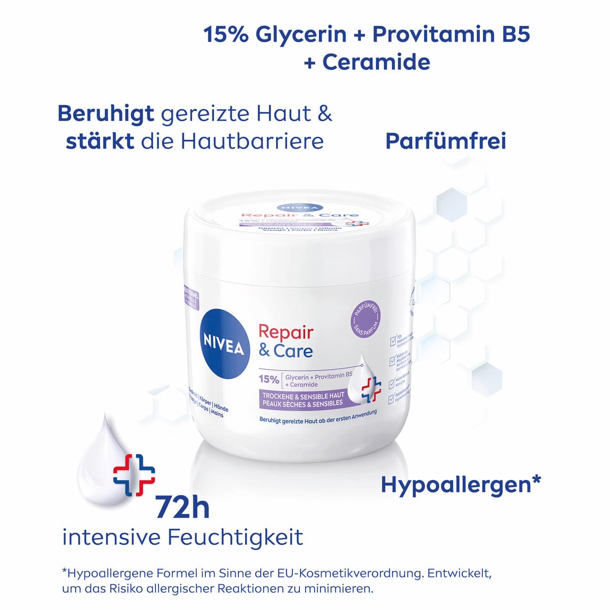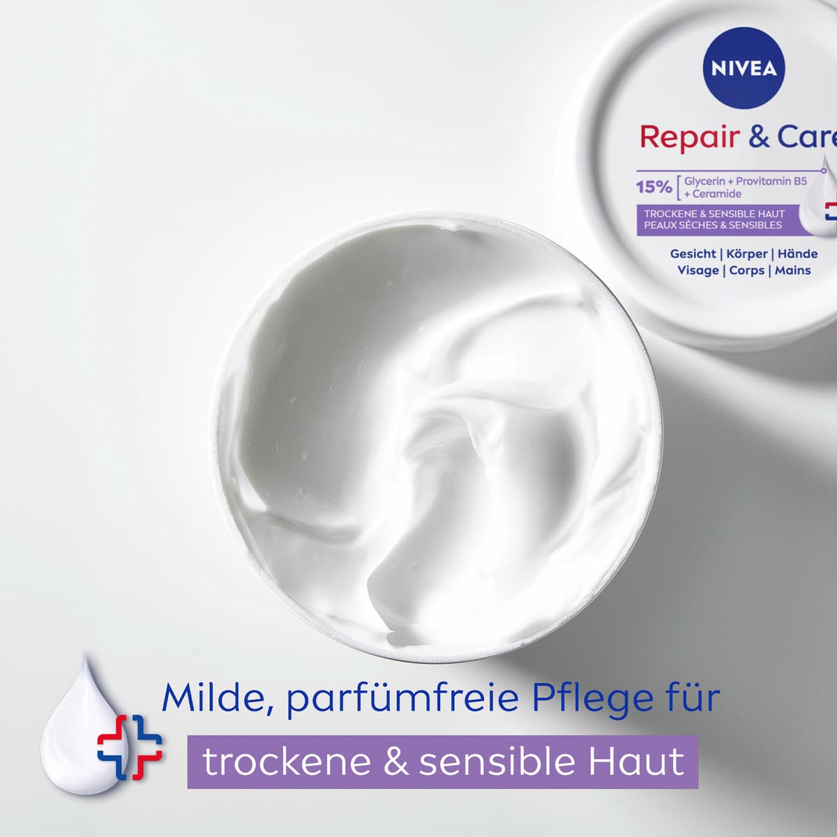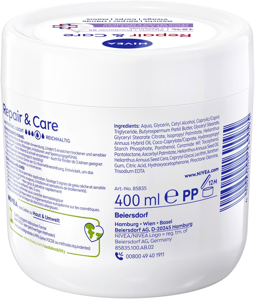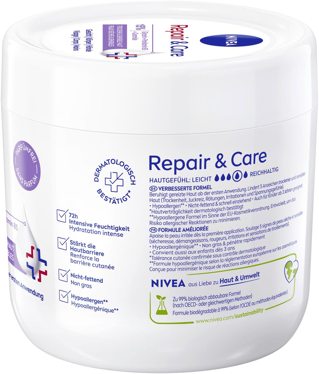 Die NIVEA Körpercreme Repair & Care ist eine Pflege, die speziell auf die Bedürfnisse sensibler Haut abgestimmt ist. Ihre Formel ohne Parfüm eignet sich zur Anwendung auf Gesicht, Körper und Händen.