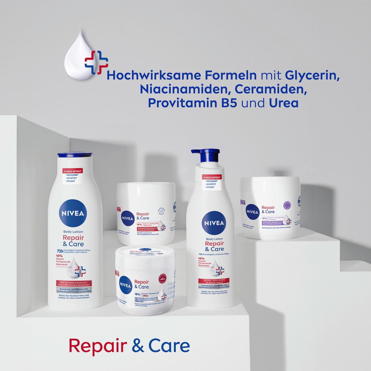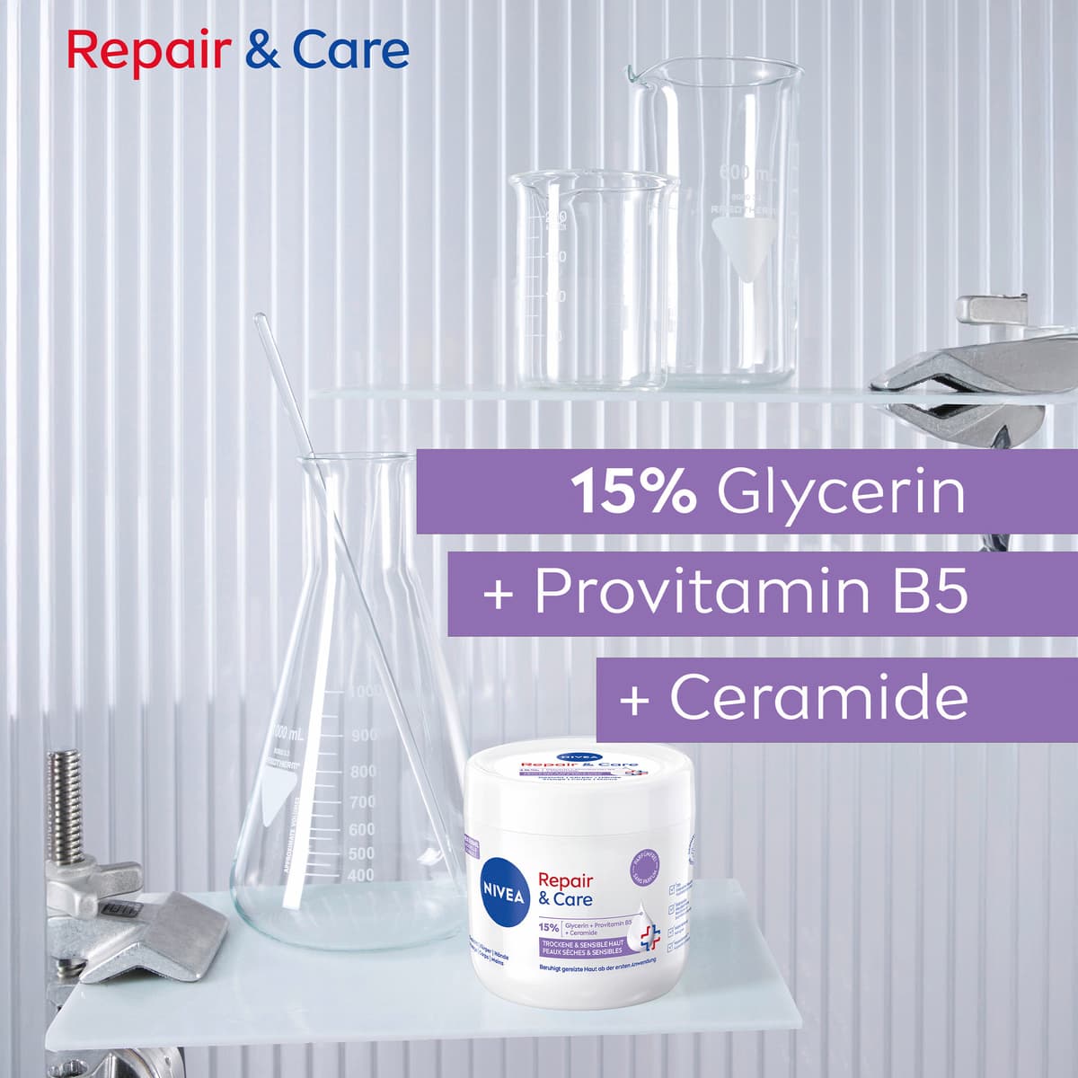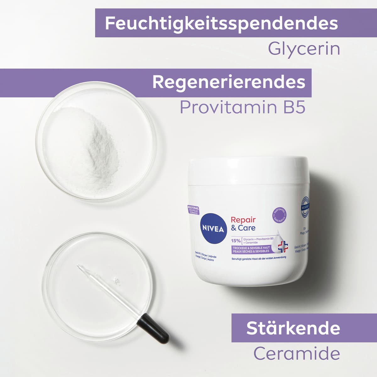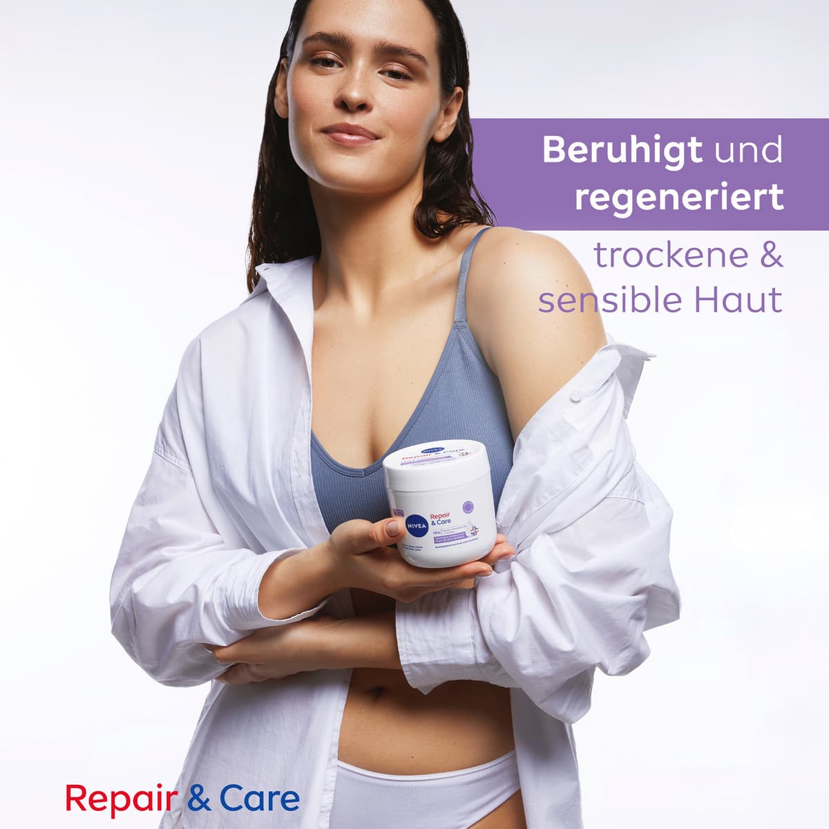 Die NIVEA Körpercreme Repair & Care ist eine Pflege, die speziell auf die Bedürfnisse sensibler Haut abgestimmt ist. Ihre Formel ohne Parfüm eignet sich zur Anwendung auf Gesicht, Körper und Händen.