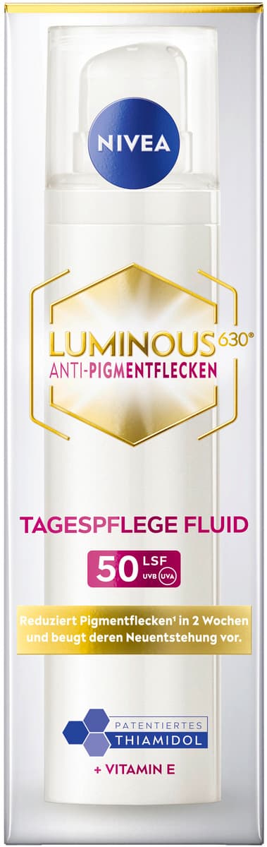 Das NIVEA Luminous 360 Anti-Pigmentflecken Tagespflege Fluid mit Lichtschutzfaktor 50 ist eine Gesichtspflege für den täglichen Gebrauch. Die Formel mit Thiamidol ist auf die Bedürfnisse von Haut mit Pigmentflecken abgestimmt.
