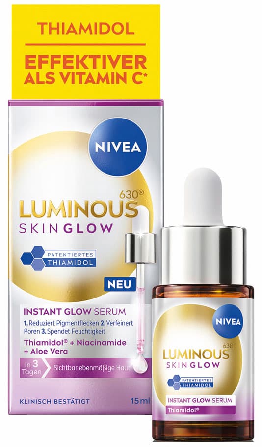 Das NIVEA LUMINOUS EVEN GLOW SERUM verleiht der Haut ein strahlendes Aussehen. Die leichte Formel mit Thiamidol®, Niacinamid und Aloe Vera ist für die tägliche Gesichtspflege konzipiert.