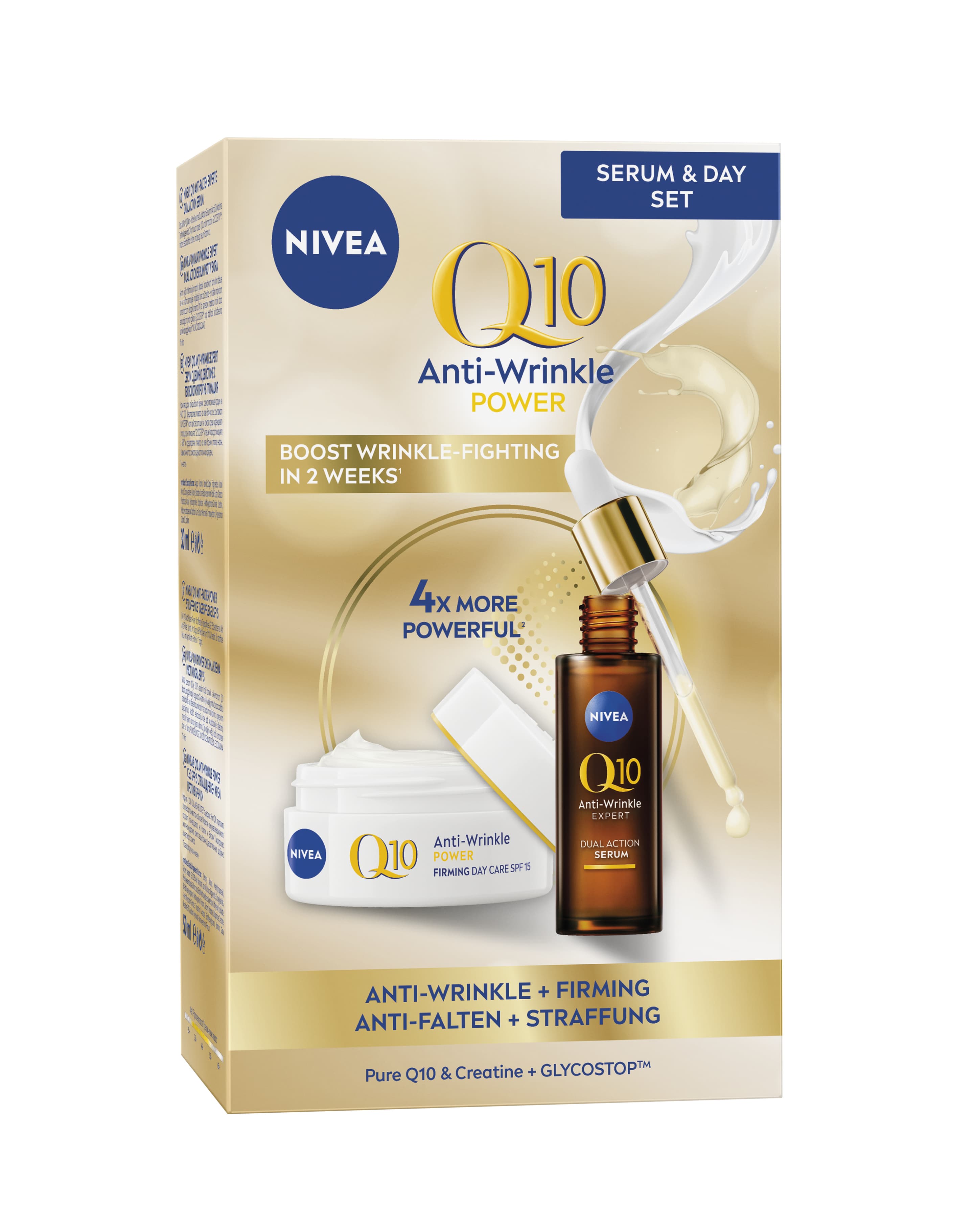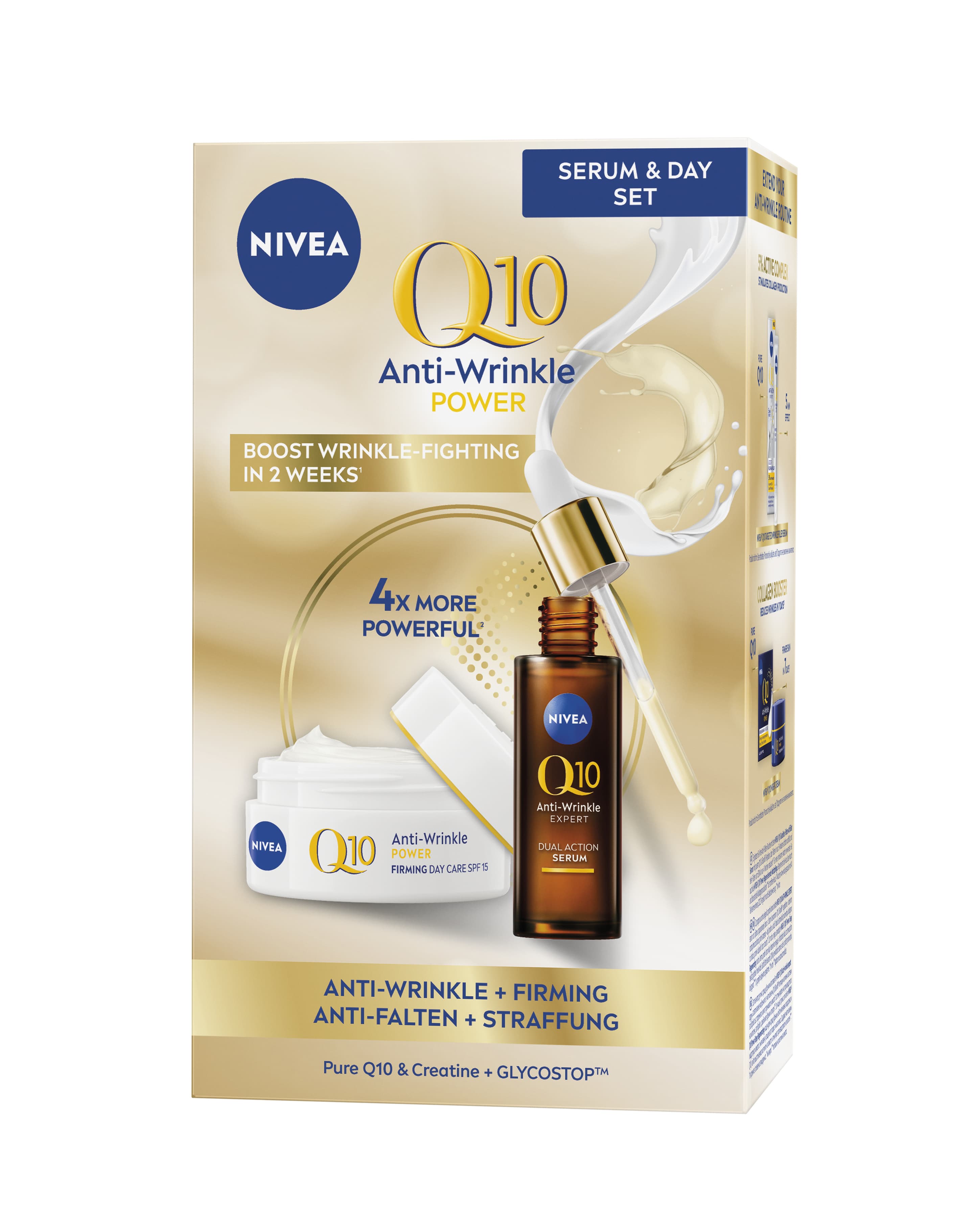 mit Anti-Glykations Technologie, das vor zuckerbedingten Schäden in der Haut schützt und so Falten vorbeugt und diese mildert, für eine 4x wirksamere Routine, als die Verwendung der Tagespflege allein.* *Pflegeroutine Serum + NIVEA Q10 ANTI-FALTEN Power straffende Tagespflege LSF 15 in vier Parametern wirksamer als die Tagespflege allein (Hautregeneration, Hautbefeuchtung, Tiefenfeuchtigkeit, Q10 Verfügbarkeit)
