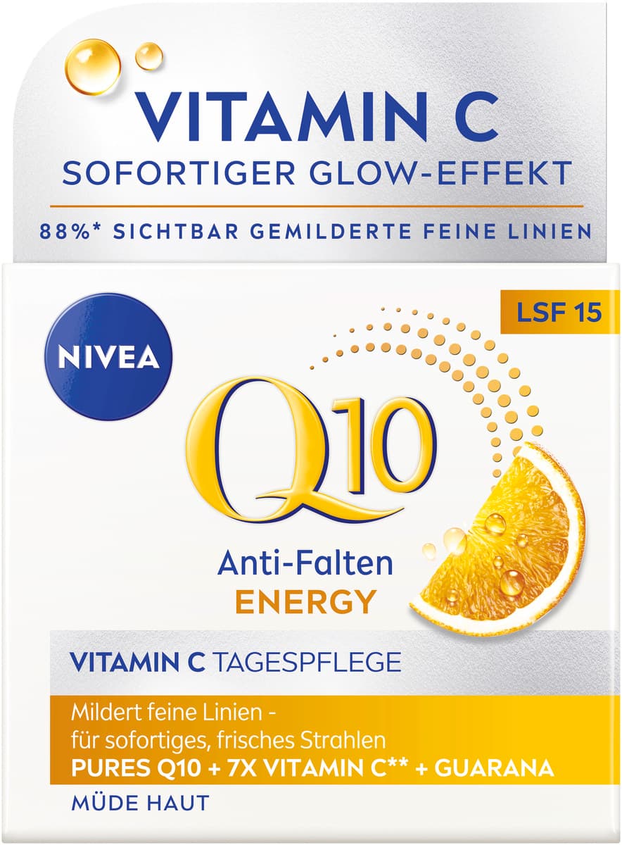 Die NIVEA Q10 Energy Anti-Falten Tagespflege mit Lichtschutzfaktor 15 verleiht der Haut ein gepflegtes Aussehen. Die Formel mit Orangenextrakt sorgt für einen angenehm frischen Duft.