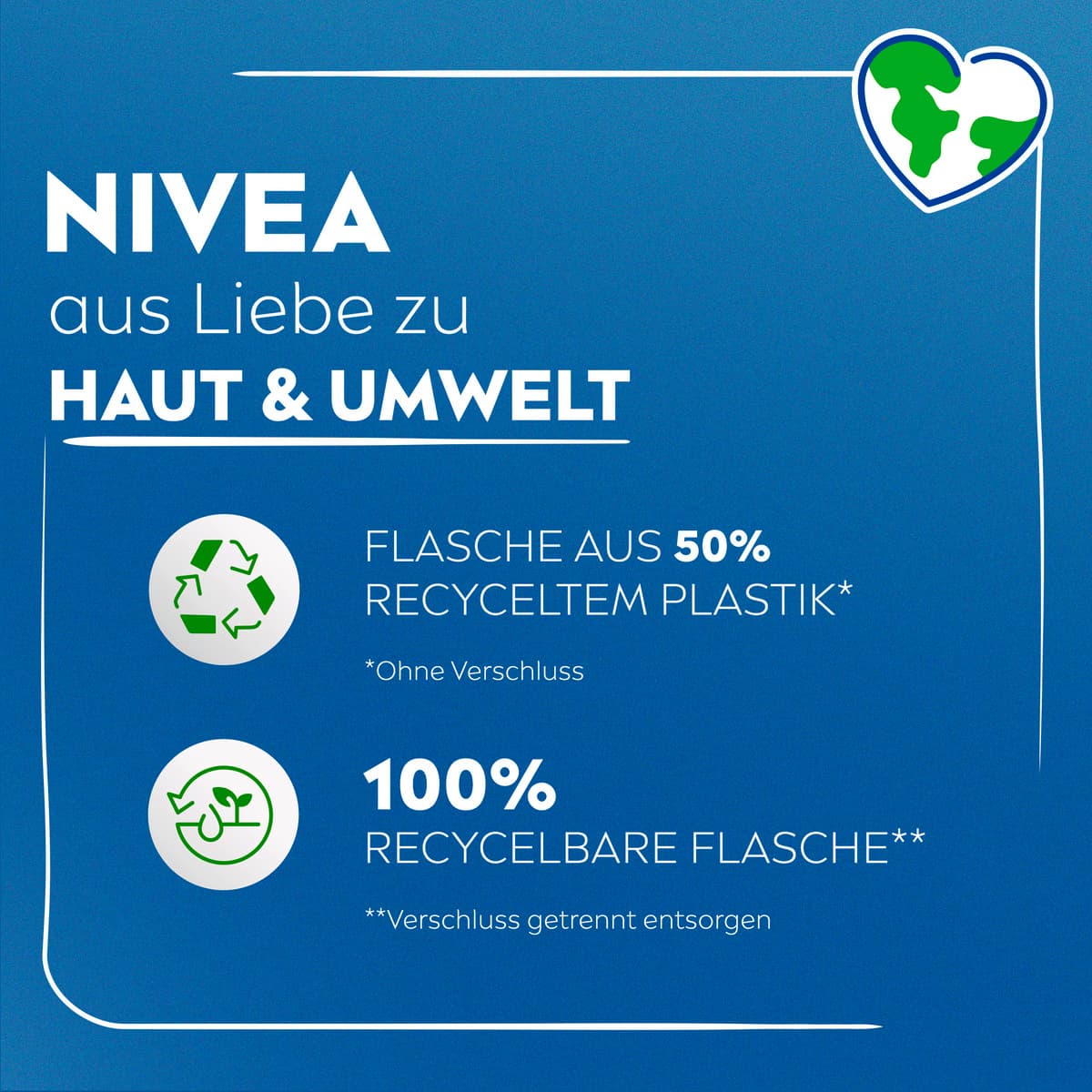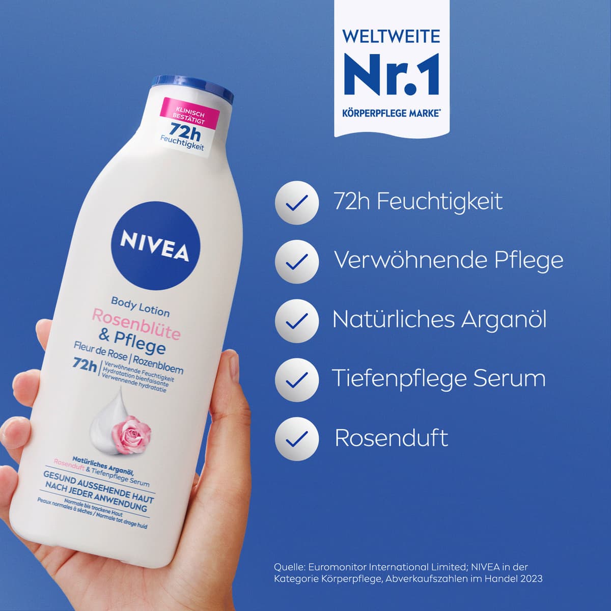 Die NIVEA® Rosenblüte&Pflege Body Lotion mit einem verwöhnenden Rosenduft spendet Ihrer Haut 72h intensive Feuchtigkeit. Die verbesserte Formel ist angereichert mit natürlichem Arganöl, Rosenduft und NIVEA Tiefenpflege Serum. Für eine gesund aussehende Haut nach jeder Anwendung. Nicht-fettend und schnell einziehend. Für einen Effekt, den Sie nicht nur fühlen, sondern auch sehen können: NIVEA Rosenblüte&Pflege Body Lotion 400ml. Hautverträglichkeit dermatologisch bestätigt.NIVEA aus Liebe zu Haut und Umwelt: Flasche aus 50% recyceltem Plastik (ohne Verschluss). Unser Pflegeversprechen: Wir nutzen unsere über 100-jährige Erfahrung in der Hautpflege zur sorgfältigen Auswahl aller Inhaltsstoffe nach unseren NIVEA Qualitätsstandards.