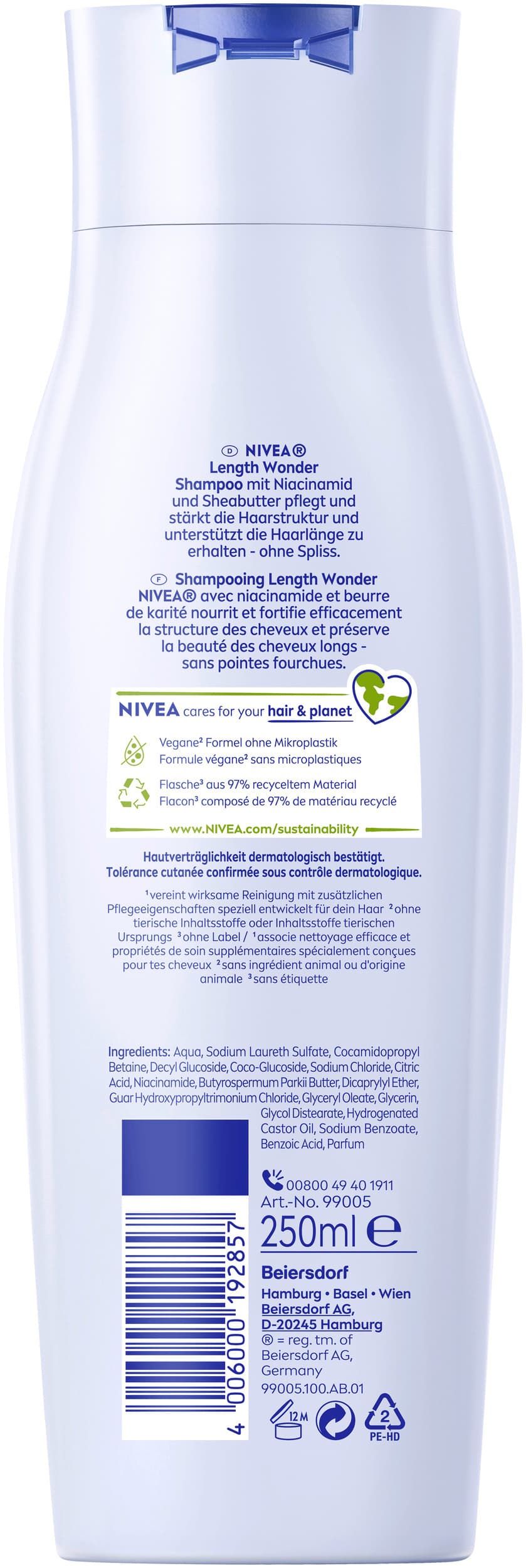 Silikone aus – für maximale Wirksamkeit (vereint wirksame Reinigung mit zusätzlichen Pflegeeigenschaften, speziell entwickelt für dein Haar). Aus Liebe zum Haar und zur Umwelt wurde die Formel des NIVEA Length Wonder stärkenden Shampoos nach höchsten Nachhaltigkeitsstandards entwickelt: