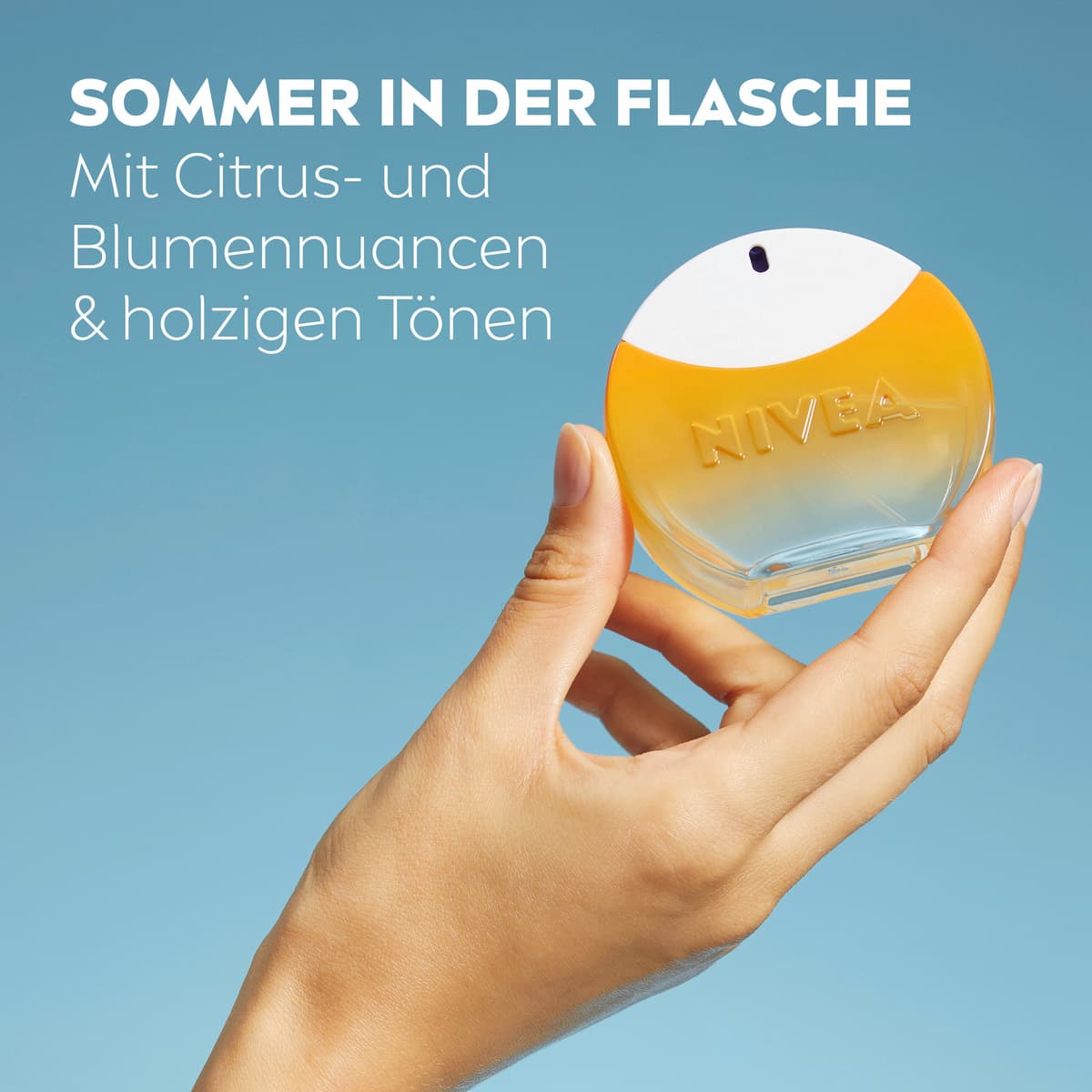 Das NIVEA SUN Eau de Toilette fängt die unbeschwerte Leichtigkeit des Sommers in einem Duft ein. Die Komposition erweckt Erinnerungen an sonnengeküsste Haut und eine frische Meeresbrise.