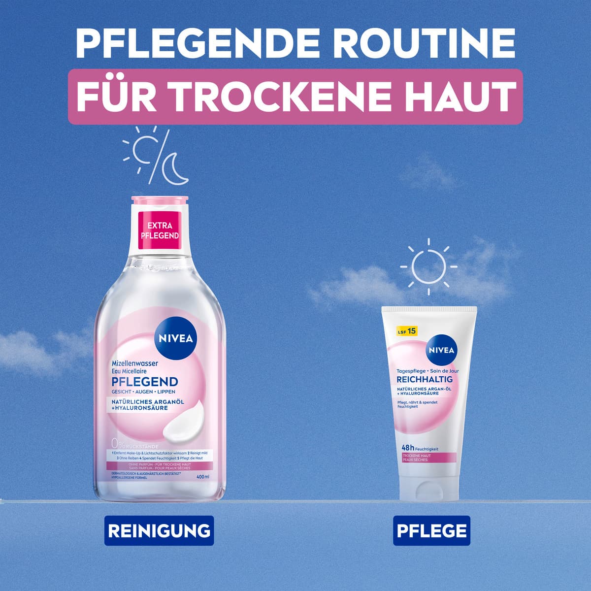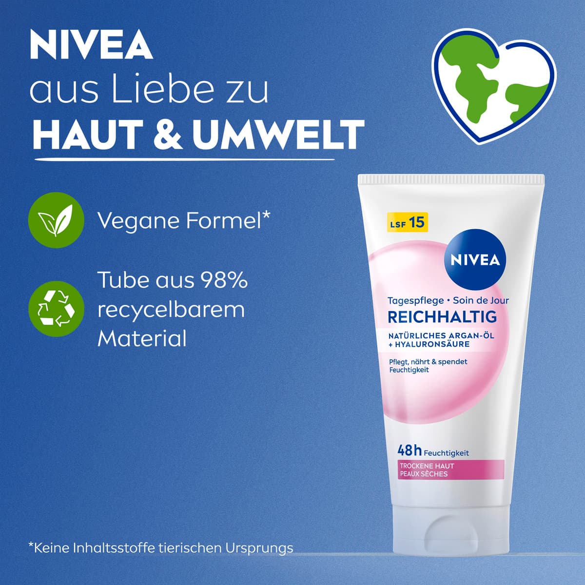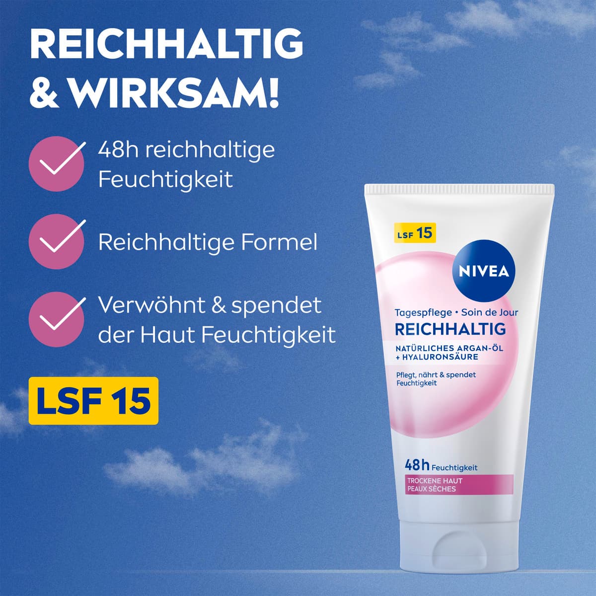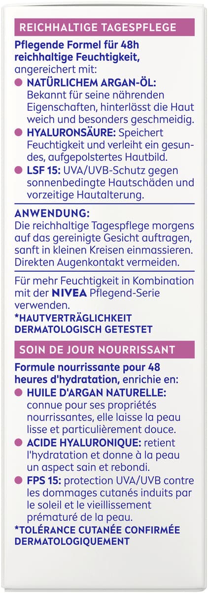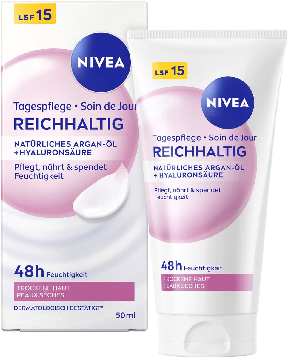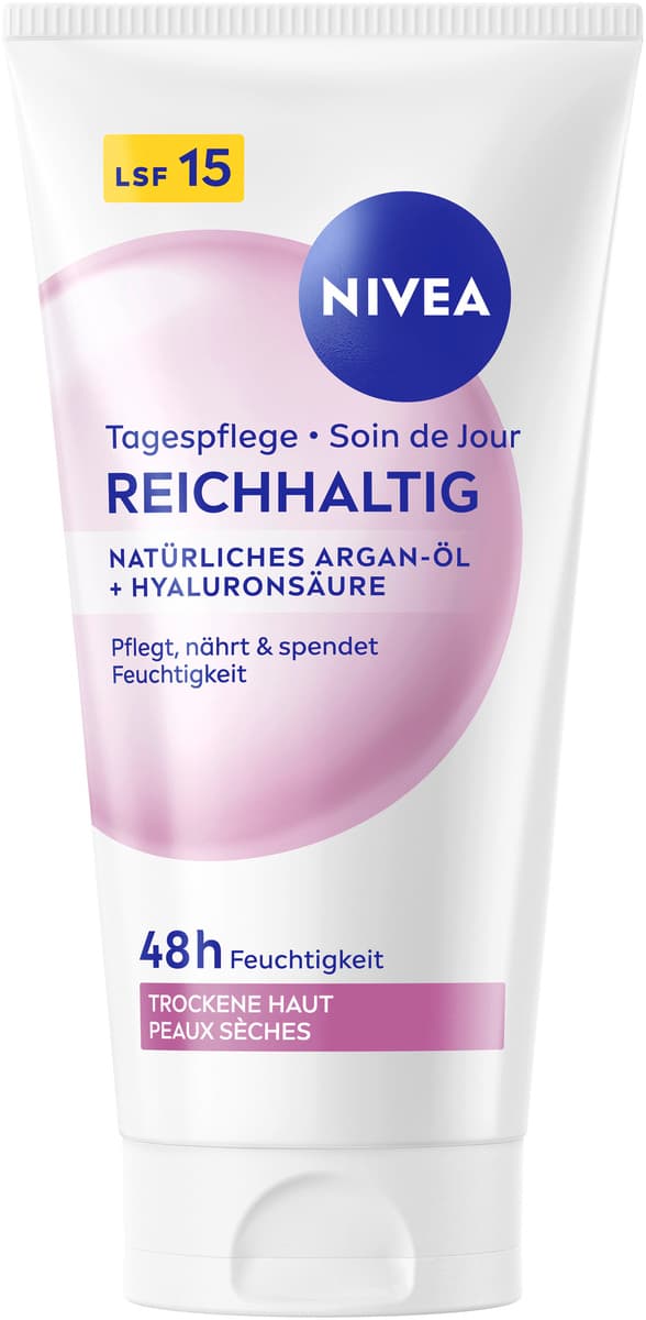 Die NIVEA reichhaltige Tagescreme ist mit natürlichem Argan-Öl und Hyaluronsäure angereichert. Diese verwöhnende und gut einziehende Formel versorgt die Haut 48 Stunden lang mit Feuchtigkeit und gleicht so den Feuchtigkeitshaushalt der Haut aus. Die Tagespflege pflegt, nährt und spendet Feuchtigkeit. Darüber hinaus bietet die Creme mit LSF 15 Schutz gegen sonnenbedingte Hautschäden und vorzeitige Hautalterung. Genießen Sie tief gepflegte und glatte Haut – den ganzen Tag, jeden Tag. Die Hautverträglichkeit dieser Tagespflege für trockene Haut ist dermatologisch bestätigt. NIVEA ist in über 160 Ländern präsent und gehört mit mehr als 140 Jahren Erfahrung zu den größten und vertrauenswürdigsten Hautpflegemarken der Welt. Als Marktführer in der globalen Hautpflegebranche arbeiten unsere Forscher intensiv daran, hochwertige, dermatologisch geprüfte Produkte für verschiedene Hauttypen und -bedürfnisse anzubieten.