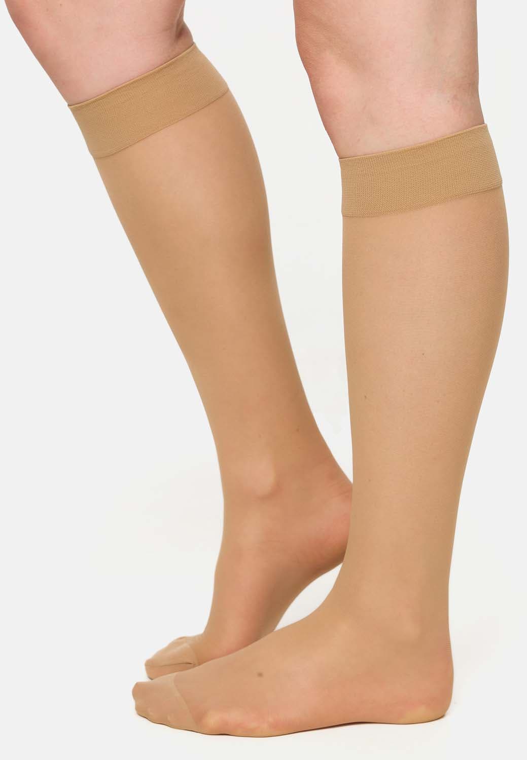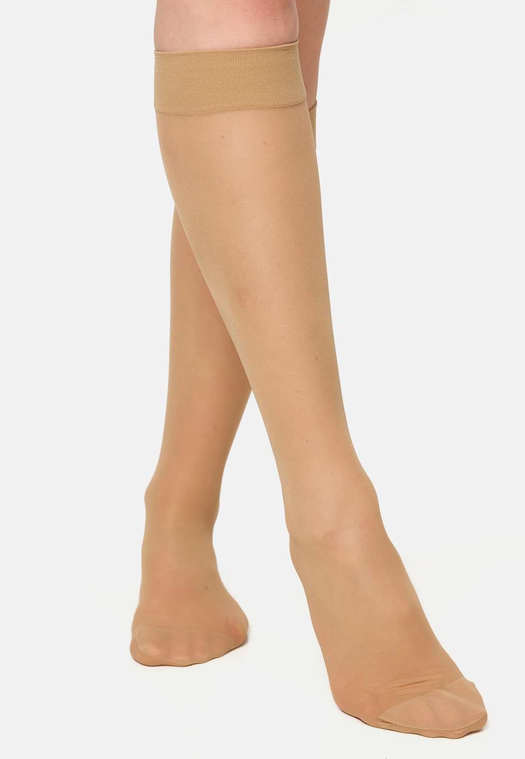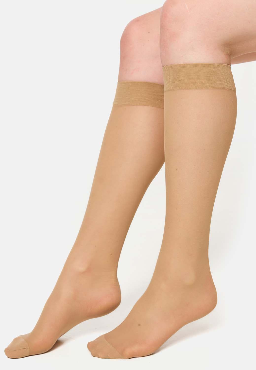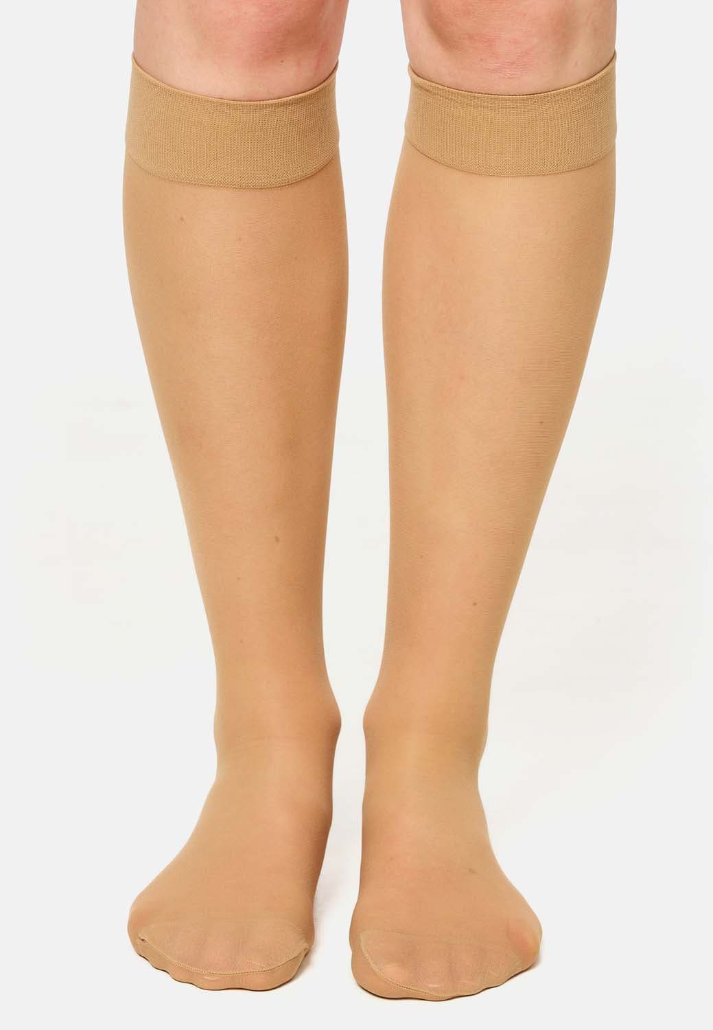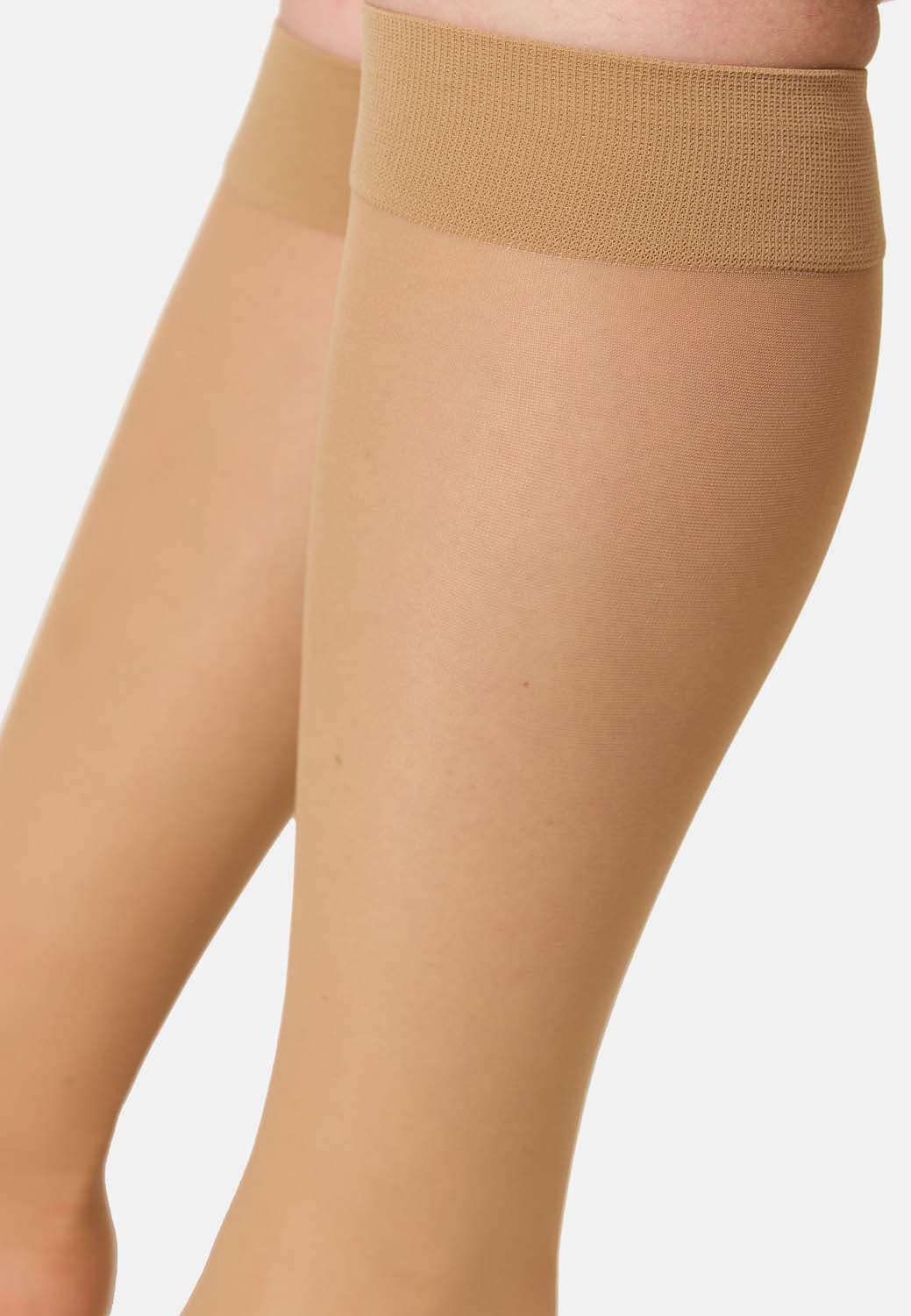 Semi-blickdichte Kniestrümpfe in matter Optik, starke Stützwirkung hilft die Beine zu entlasten –abgestufter Druckverlauf hilft der Blutzirkulation. Sitzen perfekt durch die Verarbeitung der Faser LYCRA®. Verstärkte Fußspitze und extra breiter Komfortbund.