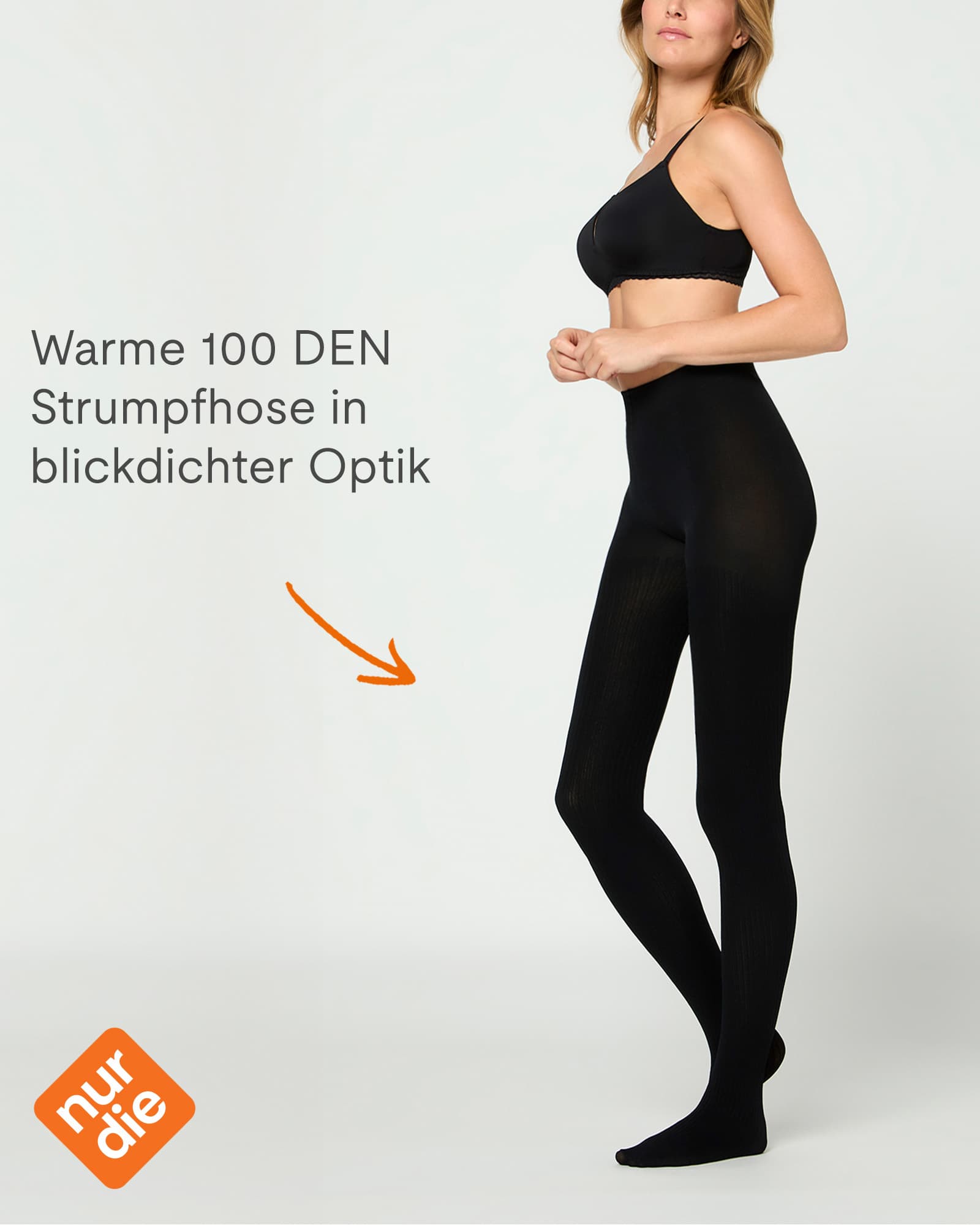 Die Wohlig Warm Strumpfhose von NUR DIE in seid matter, blickdichter 100 DEN - Optik hält die Beine auch bei kalten Temperaturen warm. Das weiche Innenfleece hält nicht nur warm, sondern bietet ein angenehmes Tragegefühl. Der verarbeitete Zwickel sorgt für zusätzlichen Tragekomfort und volle Bewegungsfreiheit. Die Thermo-Strumpfhose schmiegt sich dank hochwertigem Elasthan und breitem Bund eng an den Körper an und ohne zu verrutschen.