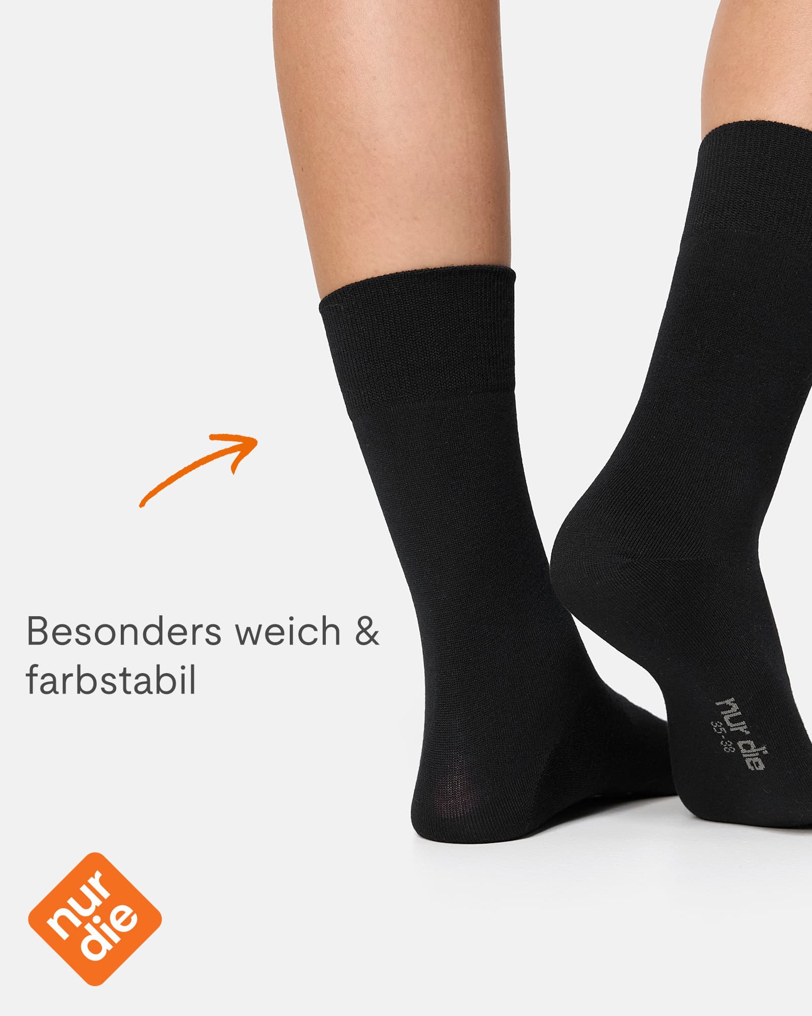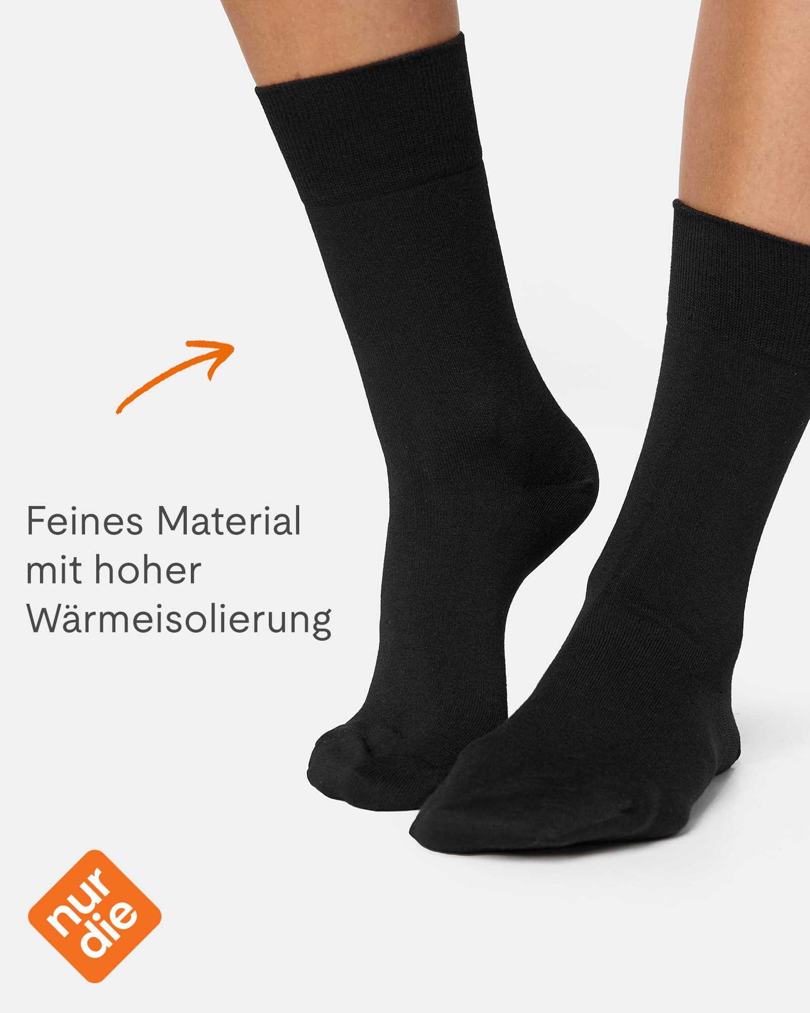 Die Bambus Thermo Socke von NUR DIE bietet die doppelte Wärmeisolierung im Vergleich zu unseren herkömmlichen Bambussocken ohne auf die weichen und farbstabilen Eigenschaften der Viskose aus Bambus-Zellstoff verzichten zu müssen. Durch die Verarbeitung eines feinen Elasthan-Fadens und des angenehmen Abschlussbunds schmiegt sich die Socke besonders weich an den Fuß an. Durch die innovative Thermolite Technologie wird die Körperwärme auf genommen und gespeichert. Die feine Socke trägt außerdem nicht dick auf und leitet die Feuchtigkeit von der Haut weg. Die echt gekettete Spitze verhindert drückende Nähte.