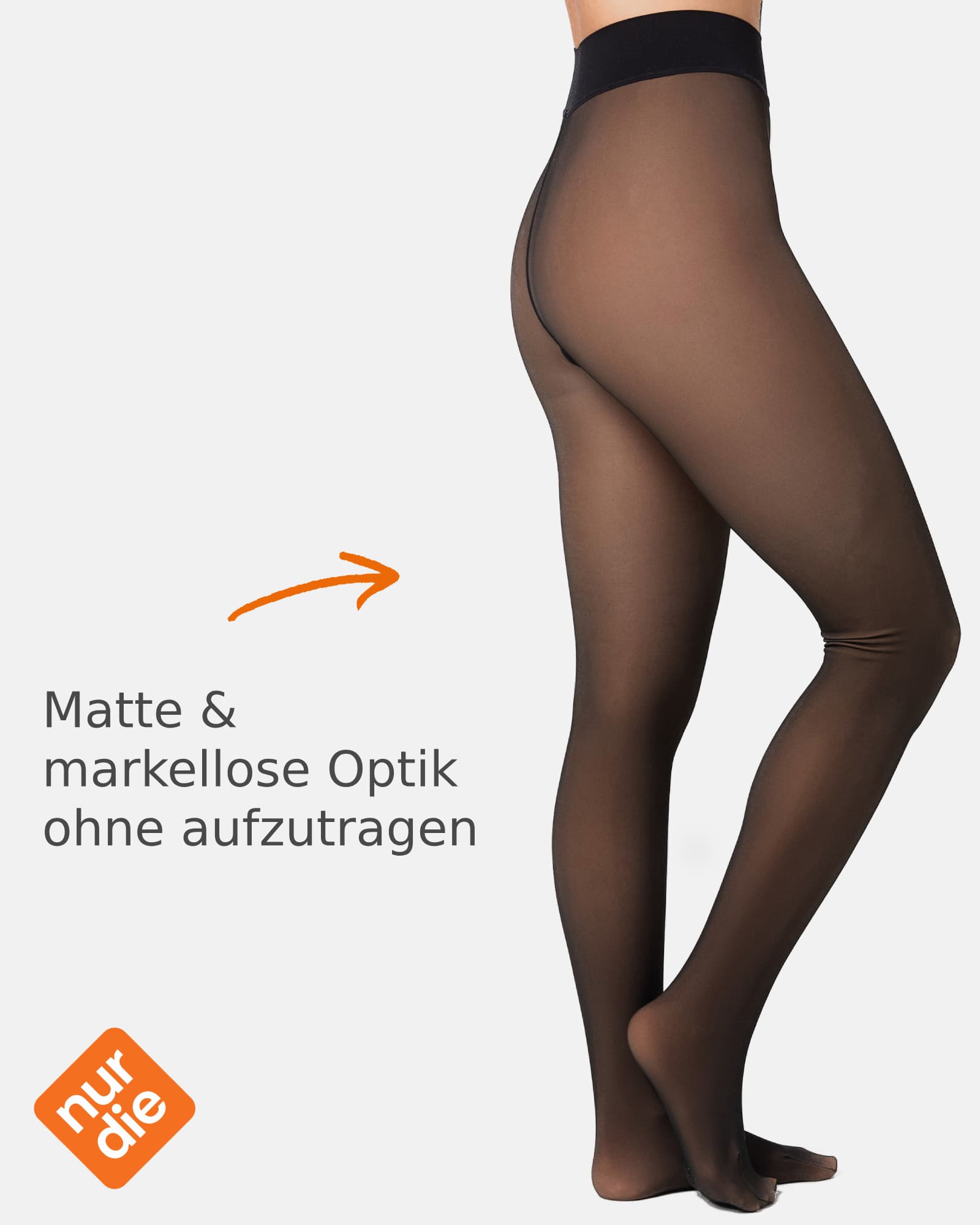 Die Warm&Transparent Strumpfhose mit wärmendem Innenfleece von NUR DIE in 80-DEN vereint eine edle transparente, matte Optik mit einer wärmenden Strumpfhose. Dank einer innovativen Stricktechnik mit beiger Innenseite, die durchscheint, wirkt diese dicke Strumpfhose nach außen transparent und zaubert einen angesagten 20-DEN Look am Bein. Die Strumpfhose lässt die Beine zudem makellos glatt erscheinen und formt eine schöne Figur. Trotz Innenfleeces, das dich auch bei kalten Temperaturen warm hält, trägt sie auch nicht auf und fühlt sich sehr angenehm auf der Haut an. Die Thermostrumpfhose lässt sich vielseitig zu Röcken, Kleidern, langen Pullovern und vielem mehr kombinieren.